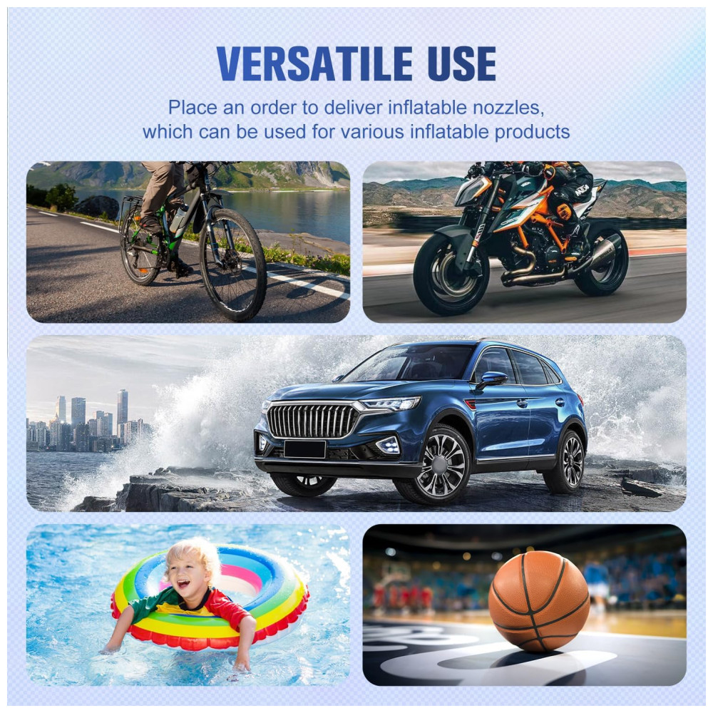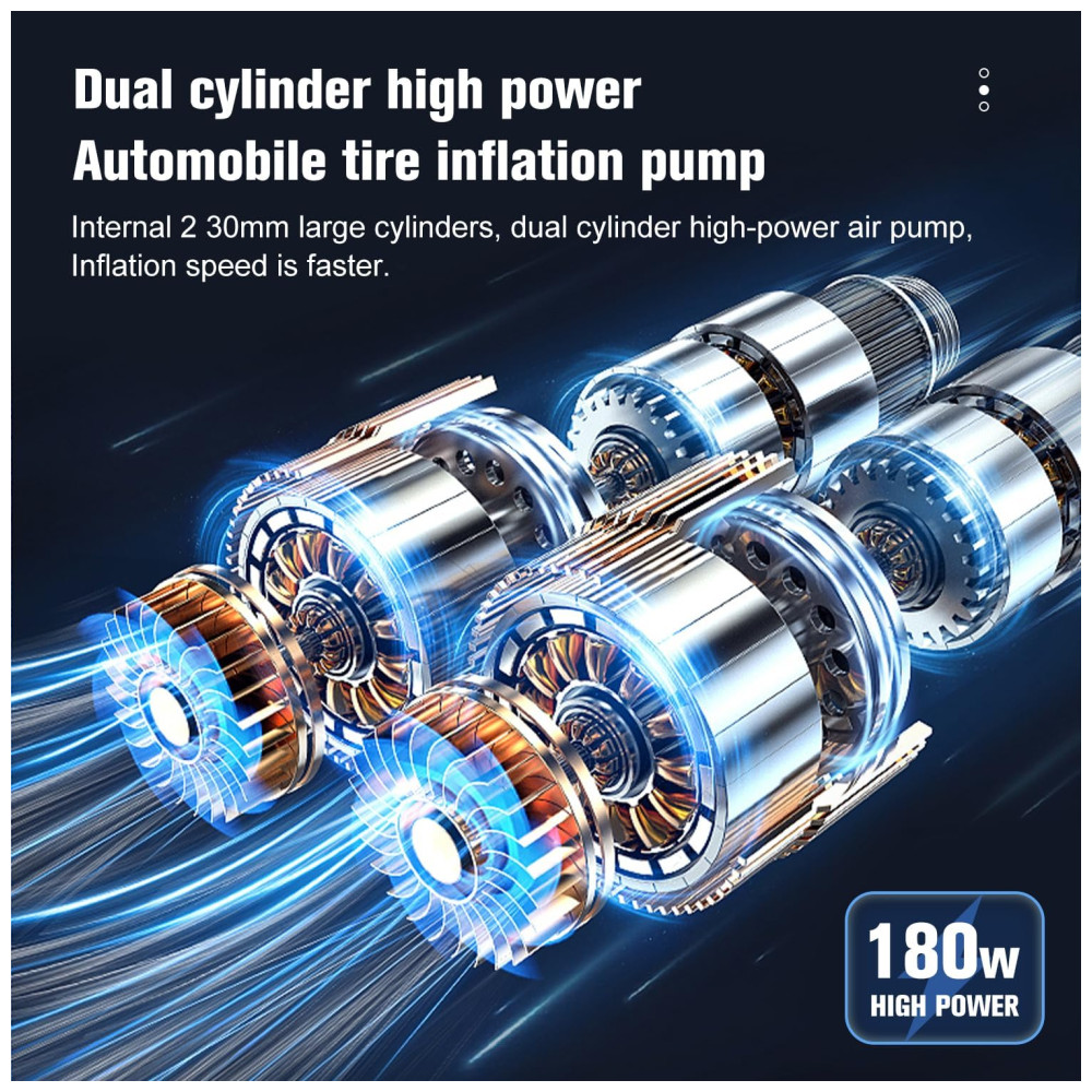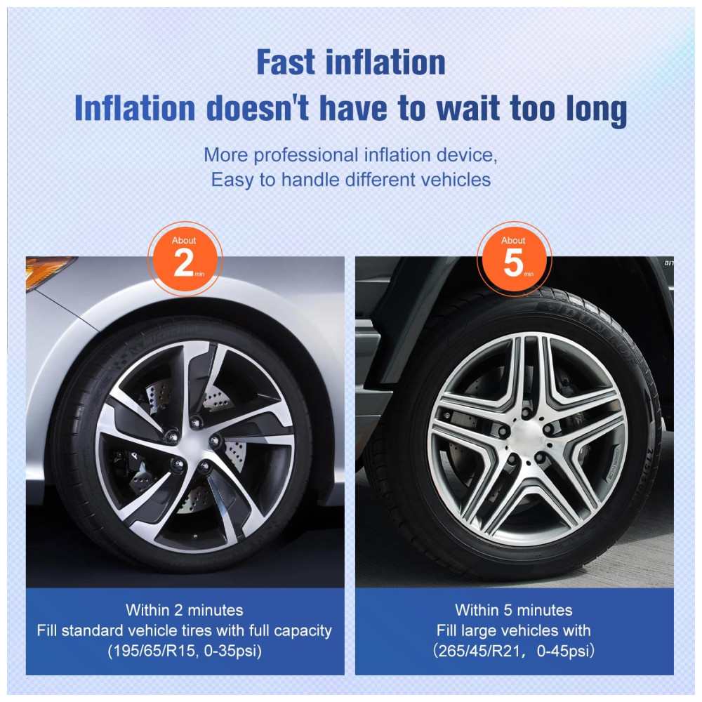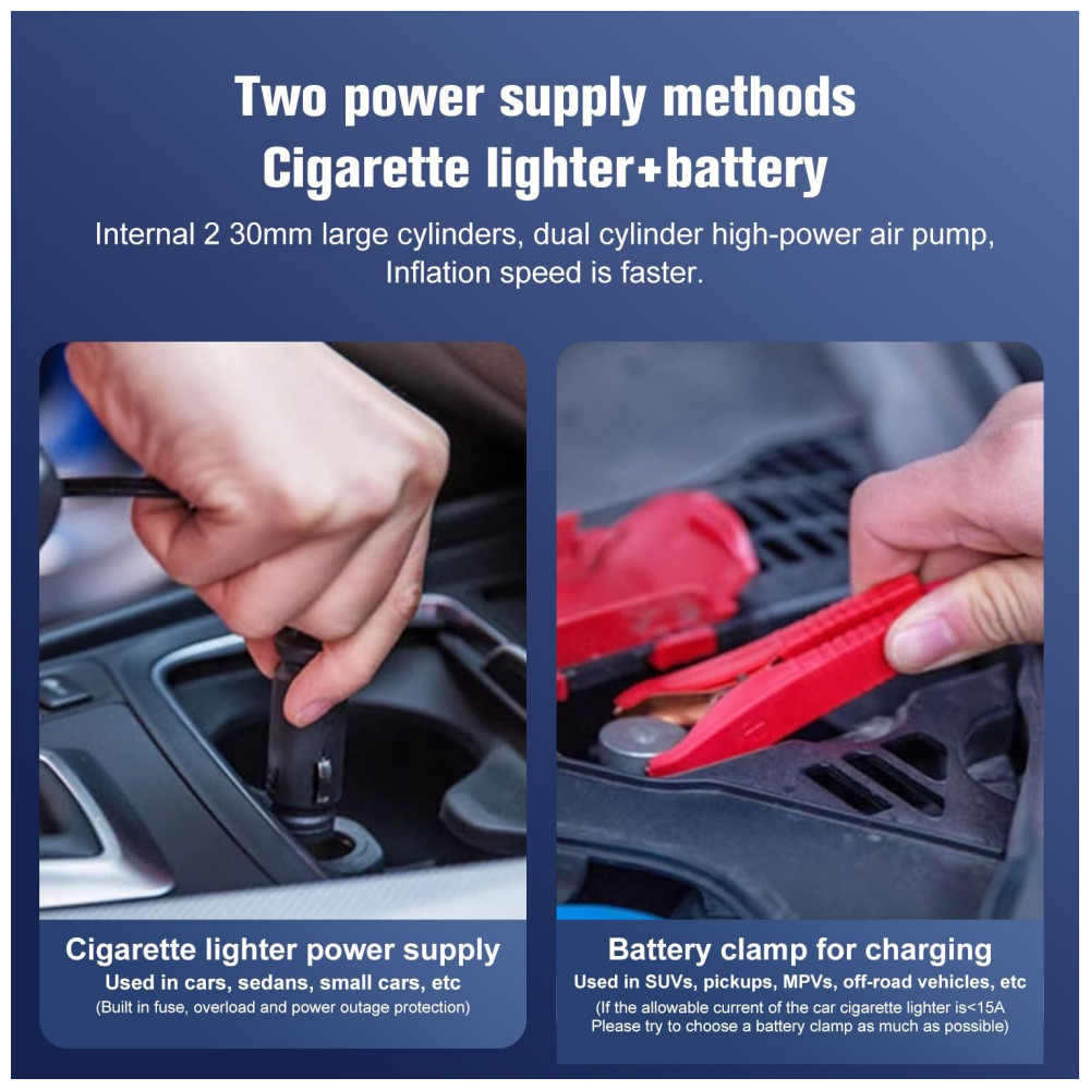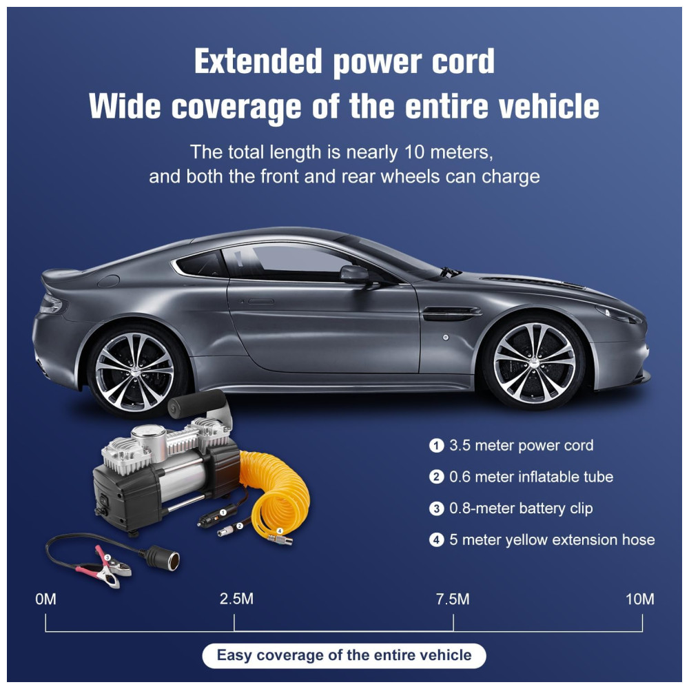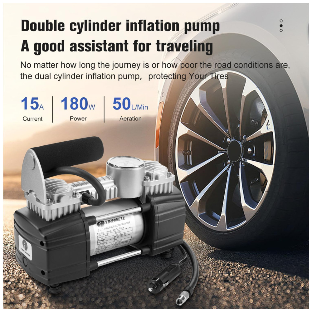 INFLAÇÃO RÁPIDA pressão máxima de 150PSI, fluxo de ar 2.12CFM0PSI, infla o pneu de veículo padrão em 2 minutos 195, 65 , R15, 0 35psi TECNOLOGIA DE ESTABILIDADE fuselagem com design de quatro barras, reduz efetivamente a vibração e o ruído, pés de borracha para garantir que a bomba de ar permaneça onde está colocada e não se mova durante a operação, torne o compressor de ar mais potente BOMBA DE INFLAÇÃO DE UNIDADE DIRETA DE CILINDROS DUPLOS No acionamento direto do motor, os dois cilindros ao mesmo tempo ar comprimido, inflável potente e rápido, também com motor de acionamento direto, faz com que o inversor tenha baixa velocidade de rotação, alta eficiência, compacto, silencioso e estabilidade e fácil de controlar TRABALHOS particularmente adequado para SUVs, caminhões, vans, Trailers, Crossovers, MPVs , campistas, reboques, minivans, também podem ser s para carros, motos, carrinhos de golfe, bicicletas e muito mais EQUIPADO com mangueira de extensão 5M e braçadeira de bateria de alta qualidade, a mangueira de extensão atende às necessidades do veículo com distância entre eixos inflável, braçadeira de bateria dir diretamente à bateria do veículo, ao compressor de pneus e a outros dispositivos de 12 volts, como aspirador, cafeteira e muito mais