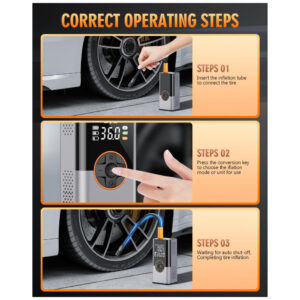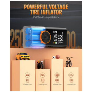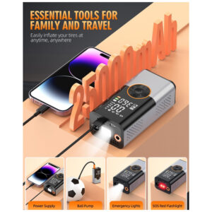 A inflação rápida e eficiente é a marca registrada do Compressor de Ar Portátil KUXISA, que apresenta um chip de alta performance gerando um fluxo de ar poderoso e de alta velocidade. Com taxa de inflação impressionante de 36 litros por minuto, sendo o dobro de infladores de pneus regulares, permite que você conclua o processo de inflação rapidamente, atingindo uma pressão máxima de 150 PSI. Este compressor oferece quatro unidades de medição de pressão e quatro modos predefinidos de inflação para bicicleta, motocicleta, carro e bola. Além disso, possui um modo manual que permite personalizar o valor de pressão de acordo com as necessidades específicas de inflação. Um dispositivo multifuncional de emergência que não é apenas uma bomba de ar, mas também um salvaguarda confiável para suas viagens. A luz LED montada na parte superior oferece três modos de iluminação para dissipar a escuridão ou piscar como um sinal de aviso à noite para alertar veículos que se aproximam. Equipado com uma porta USB bidirecional de 5V2A, permite carregamento rápido para celulares e outros dispositivos eletrônicos. Com design portátil e compacto, é notavelmente pequeno e fácil de carregar, vindo com uma bolsa de armazenamento para guardar facilmente no carro, suporte de bicicleta ou mochila. Ideal para viagens e uso doméstico, com vários acessórios inclusos, este inflador de pneus é um item essencial para motoristas, ciclistas e aventureiros.