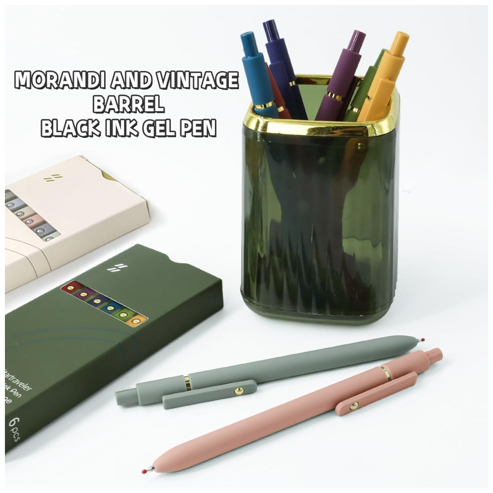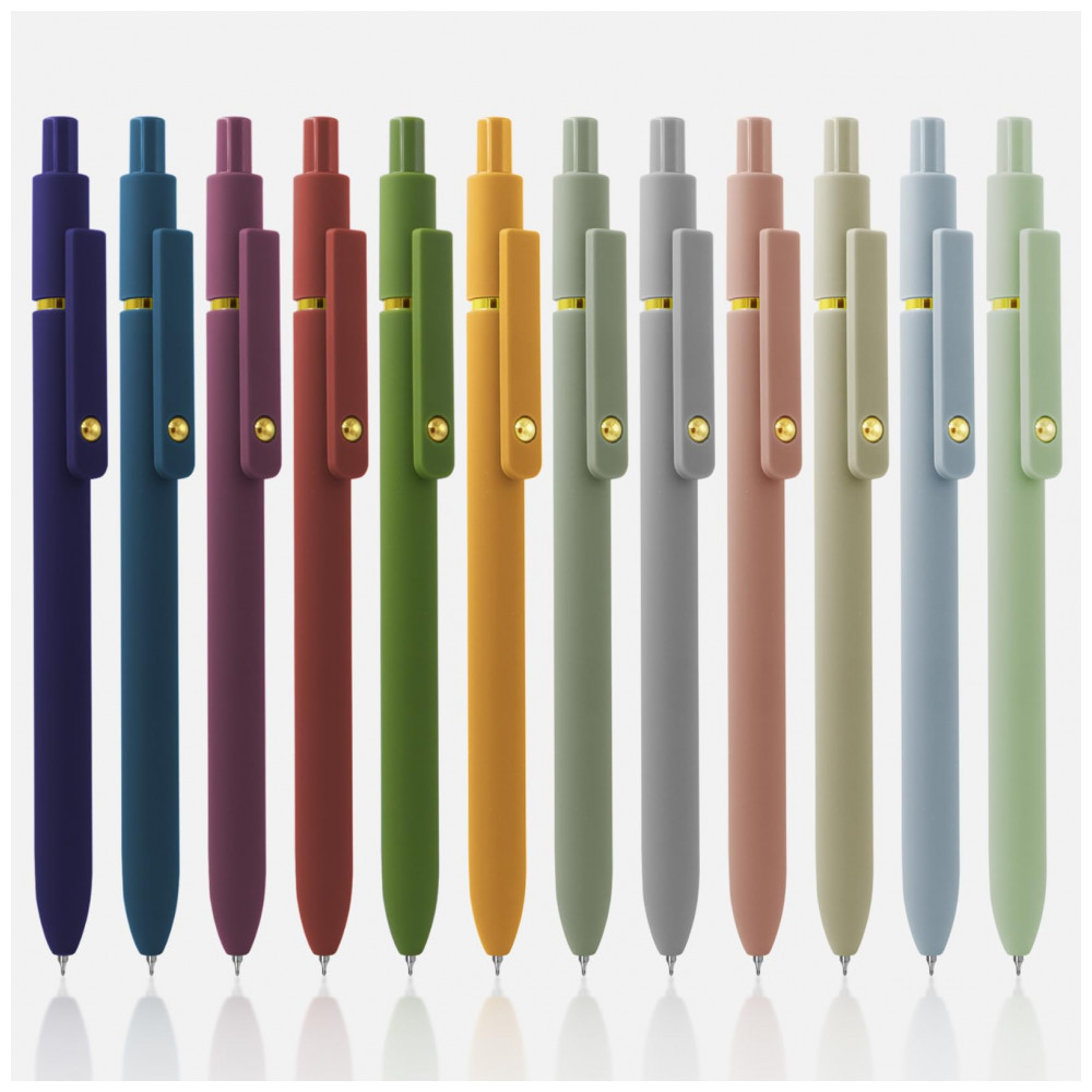 O conjunto de canetas em gel UIXJODO Morandi e dourado vintage reúne 12 canetas com tinta preta de secagem rápida e ponta fina de 0,5 mm, voltadas para escrita fluida em cadernos, planners e documentos de uso diário. O corpo das canetas combina tons Morandi e dourado retrô com esfera metálica decorativa na parte superior, criando um visual diferenciado para uso em ambiente de trabalho, estudo ou home office. A formulação da tinta foi desenvolvida para traço nítido, com baixa tendência a borrões, desbotamento ou sangramento para o verso da folha, favorecendo anotações detalhadas e journaling.
