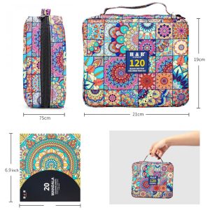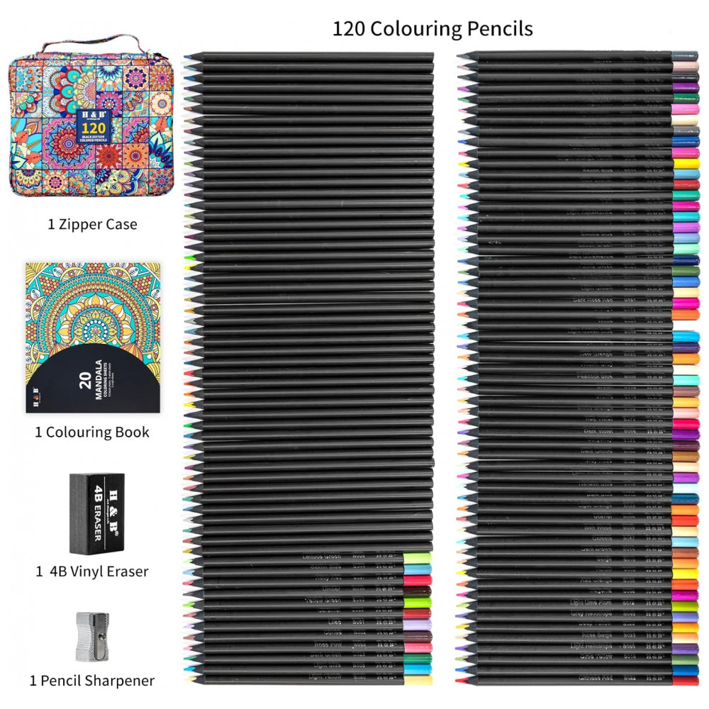 Conjunto 120 lápis de cor H & B Black Wood com livro para colorir em papel preto borracha e apontador estojo mandala com zíper