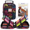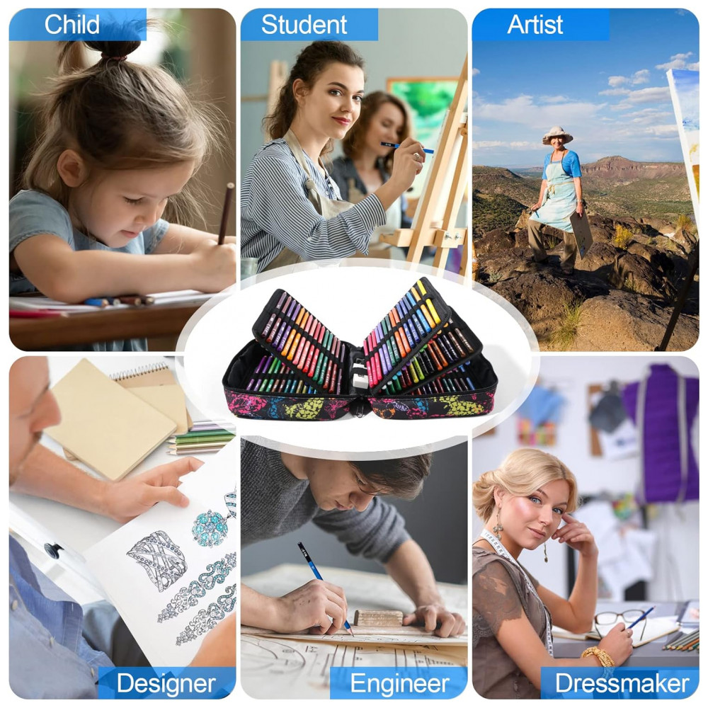 Todos os itens são organizados em estojo com fechamento em zíper e estrutura interna em camadas, permitindo separar lápis por grupos de cor. A embalagem facilita o transporte e o acesso aos lápis, atendendo usuários iniciantes e experientes em atividades de desenho e coloração.