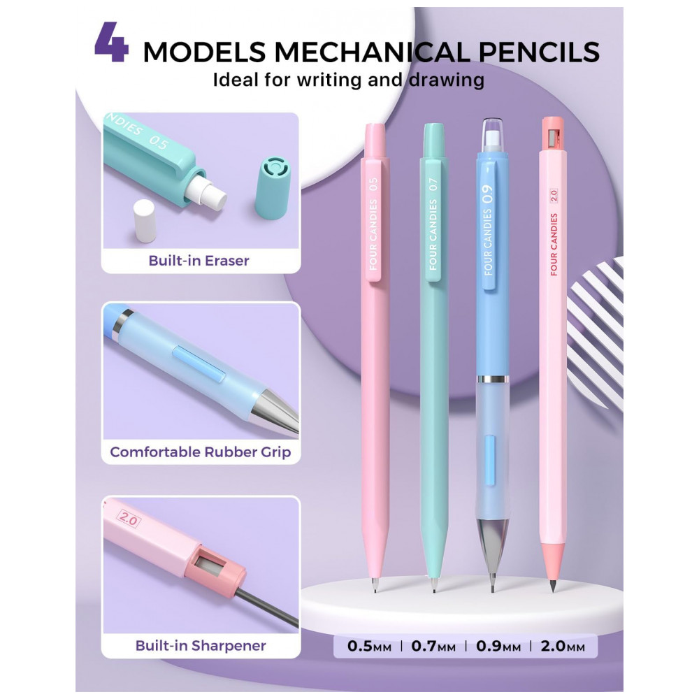 Conjunto 36 peças Four Candies roxo com estojo e lapiseiras 05 mm 07 mm 09 mm e 20 mm para escrita e desenho
