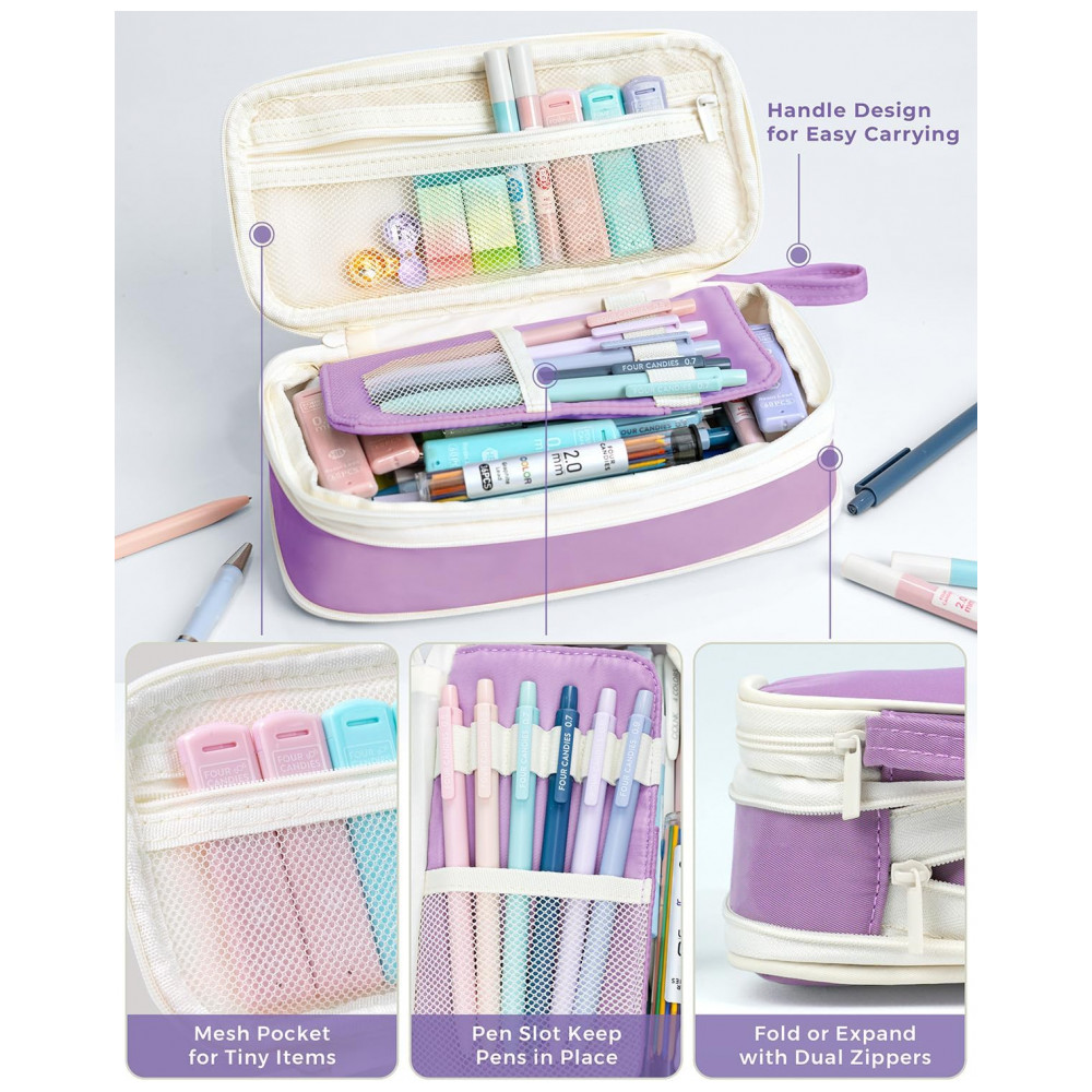 O kit Four Candies 36 peças roxo reúne um estojo de grande capacidade, 12 lapiseiras em diferentes espessuras, 624 grafites, borrachas e apontadores em um conjunto único para escrita, desenho e rascunhos em ambiente acadêmico e profissional. As lapiseiras em 0,5 mm, 0,7 mm, 0,9 mm e 2,0 mm atendem desde anotações precisas até traços mais largos, adequadas para atividades de estudo, esboços e desenho técnico leve. O estojo em tecido poliéster expansível, com zíper duplo e compartimentos internos, mantém lapiseiras, grafites e borrachas organizados e protegidos, facilitando o transporte em mochilas e bolsas.