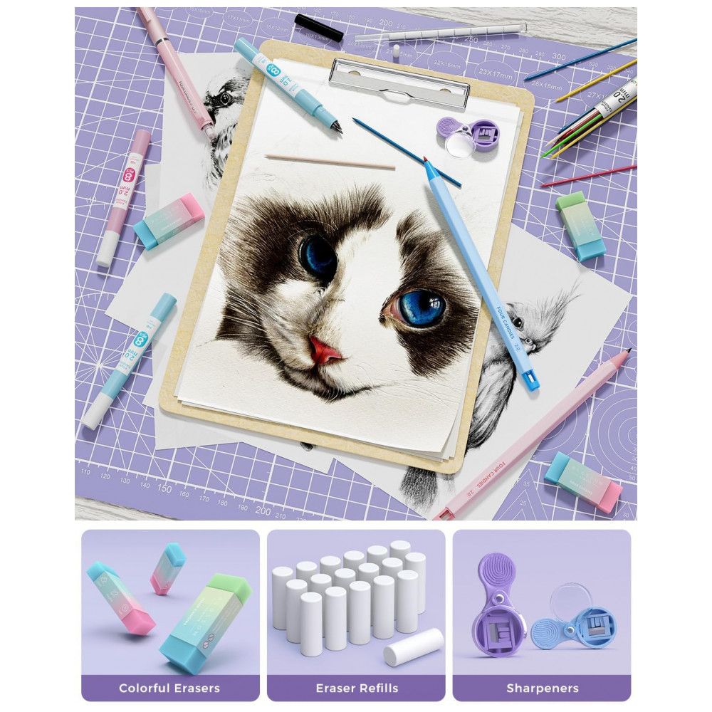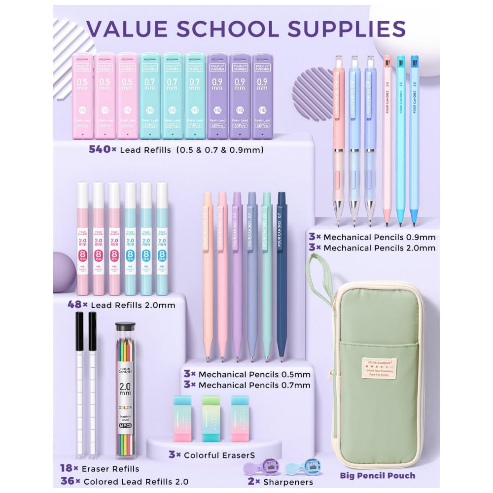 O kit Four Candies 36 peças em tom verde reúne um estojo de grande capacidade, 12 lapiseiras em diferentes espessuras, 624 grafites, borrachas e apontadores em um único conjunto voltado para escrita, desenho e rascunhos em ambiente acadêmico e profissional. As lapiseiras em 0,5 mm, 0,7 mm, 0,9 mm e 2,0 mm permitem desde anotações precisas até traços mais largos, atendendo a tarefas de resolução de exercícios, esboços e desenho técnico leve. O estojo em poliéster com design expansível, zíper duplo e divisórias internas mantém lapiseiras, grafites e borrachas organizados, facilitando o transporte em mochilas e bolsas.