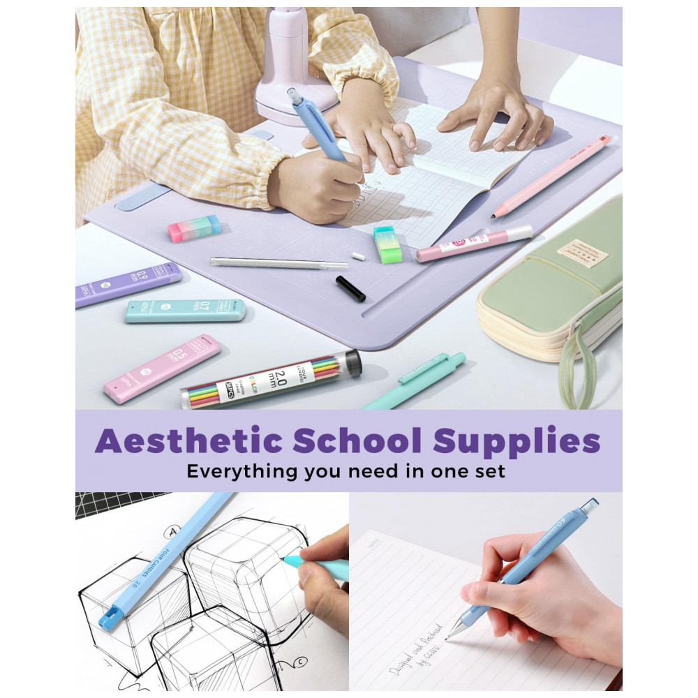 Os grafites são fornecidos em diferentes espessuras, com formulação voltada para traço suave e escuro, adequada para escrita contínua e desenho em cadernos e blocos. Um dos tubos de grafite colorido permite converter a lapiseira 2,0 mm em lápis de cor mecânico, útil para marcações, esquemas e detalhes criativos. As lapiseiras finas contam com empunhadura triangular ou emborrachada para maior conforto, enquanto o modelo 2,0 mm possui área antiderrapante e apontador embutido, indicada para usuários a partir de 14 anos que buscam um kit completo em um único estojo.