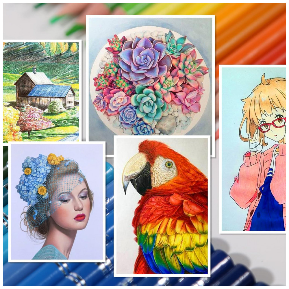 A paleta inclui cores variadas para preenchimento, sombreamento e criação de gradientes, permitindo composições detalhadas em papel de desenho e livros para colorir. Cada lápis é identificado na extremidade com nome e número da cor, o que facilita a seleção e repetição de combinações cromáticas em diferentes trabalhos.