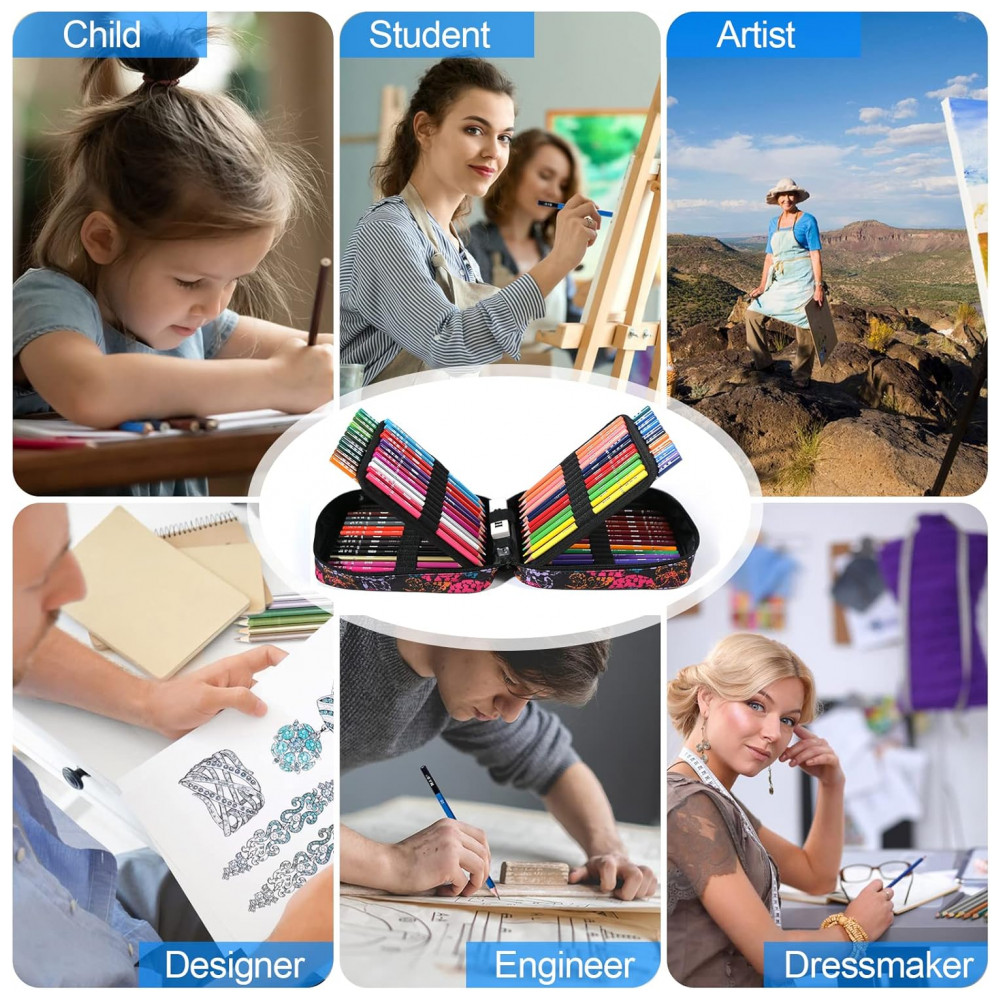 Os lápis possuem corpo em madeira com grip liso, ponta de espessura média e traço aproximado de 2 mm, adequado para áreas de cor contínua e detalhes moderados. O conjunto inclui apontador e borracha para manutenção das pontas e correção de pequenos ajustes durante o processo de desenho.