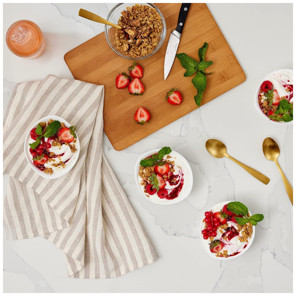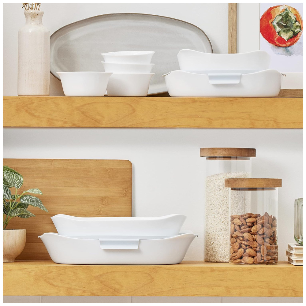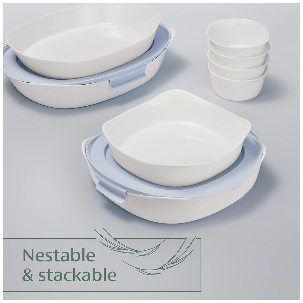Conjunto de 8 peças Inclui uma assadeira de 2,5 litros e uma assadeira de 1,75 litros com tampas mais quatro ramequins de 1 xícara