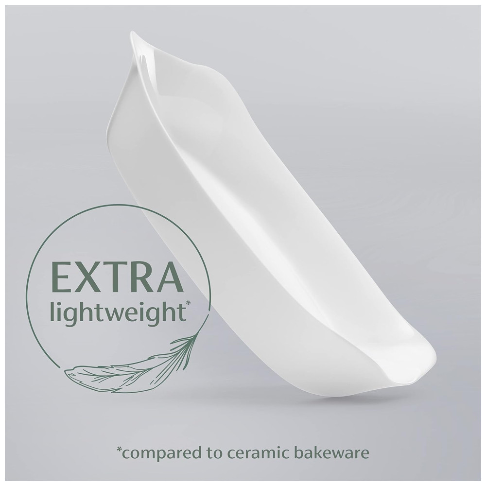 A assadeira de vidro Rubbermaid DuraLite é extraleve em comparação com as assadeiras de cerâmica, bem como resistente a quebras e lascas