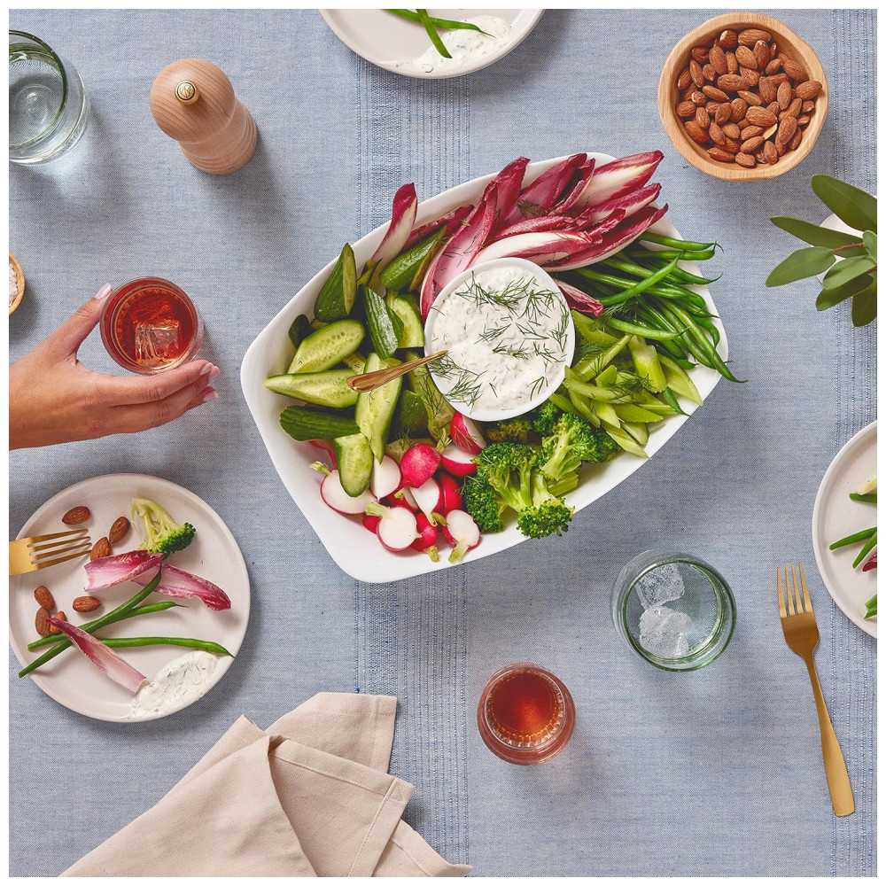 para uso em temperaturas de forno e frango de até 550 graus F, este conjunto de utensílios de vidro Rubbermaid DuraLite pode ir facilmente do forno para a mesa, para a geladeira ou freezer