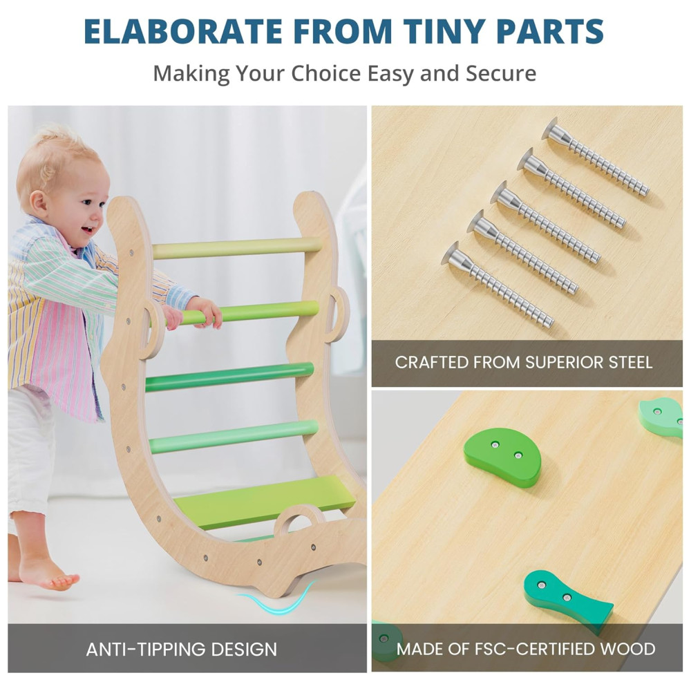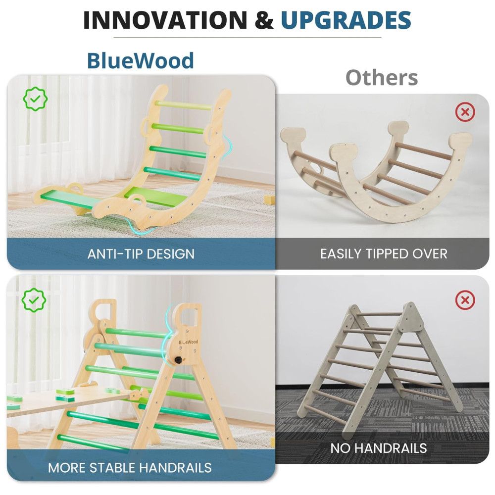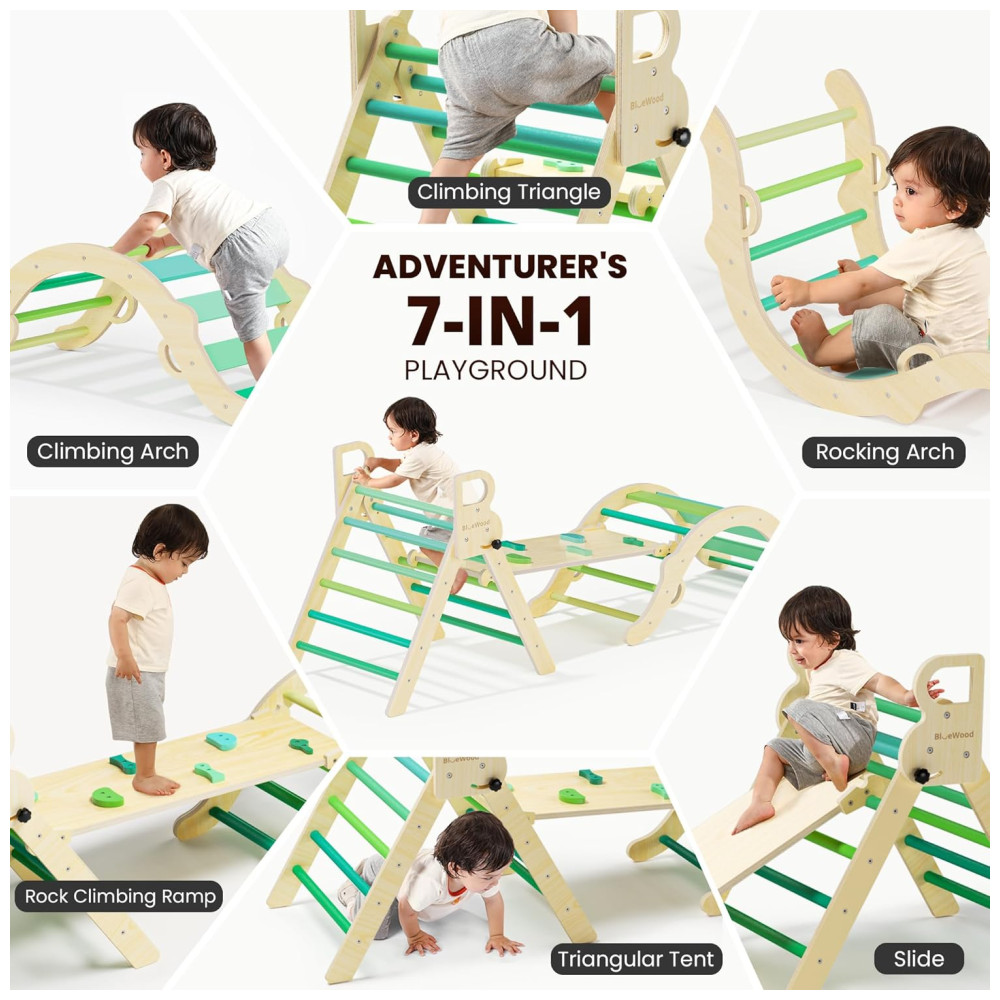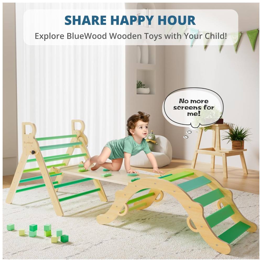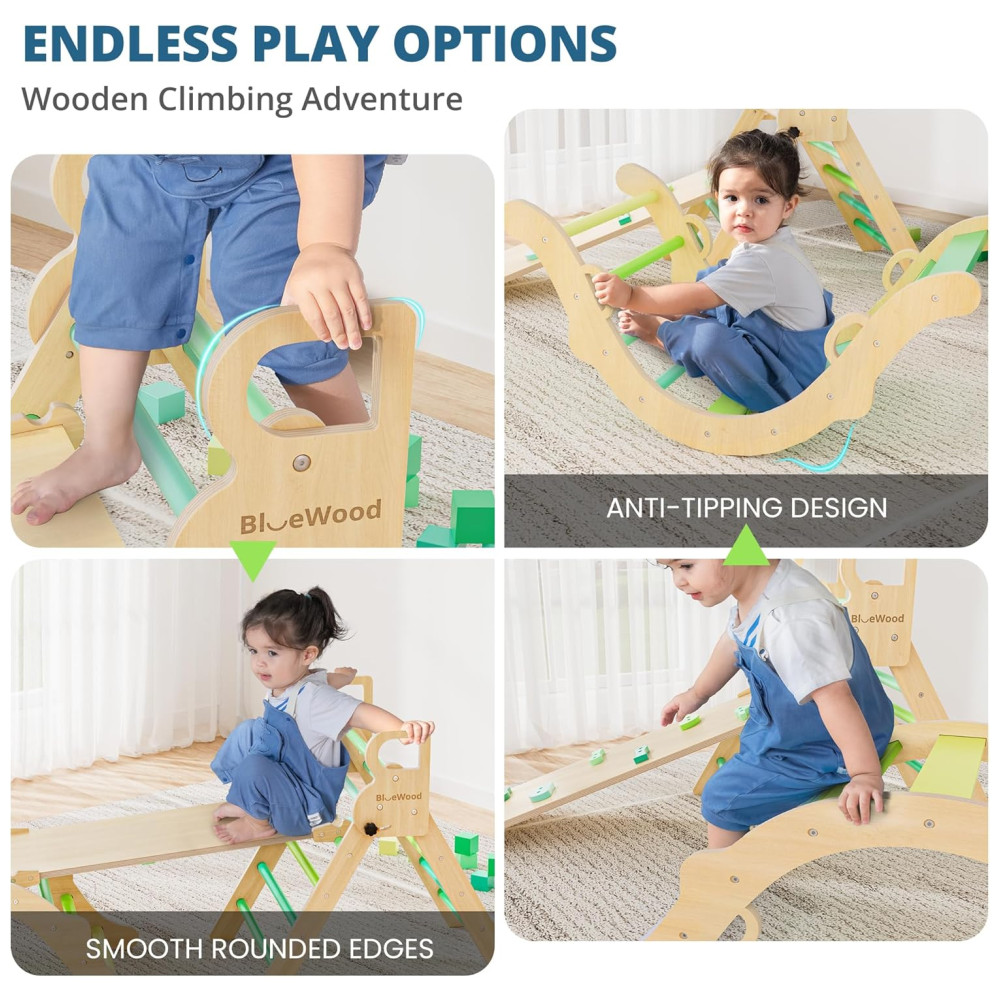 Conjunto BlueWood Pikler Triangle: Brinquedo de Escalada de Madeira para Crianças Filosofia Montessoriana 7 em 1 Design Exclusivo em Verde Verão