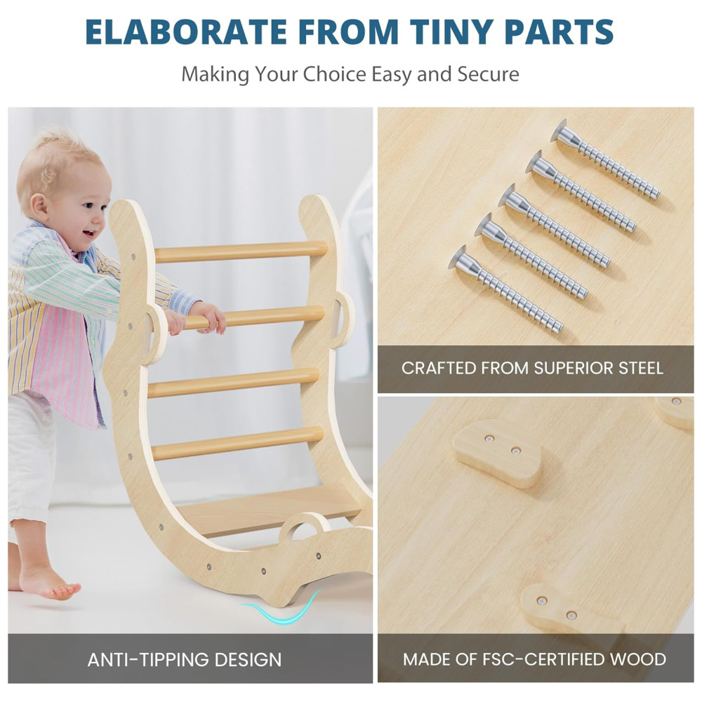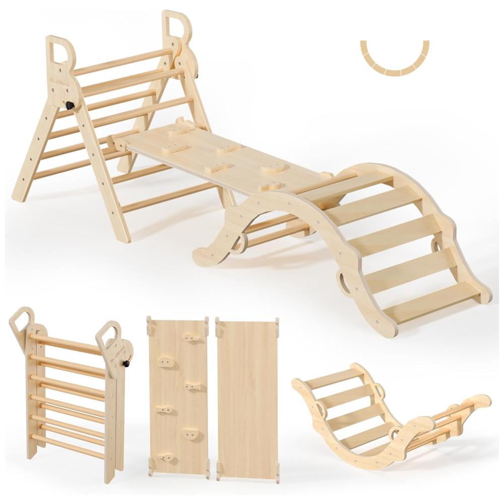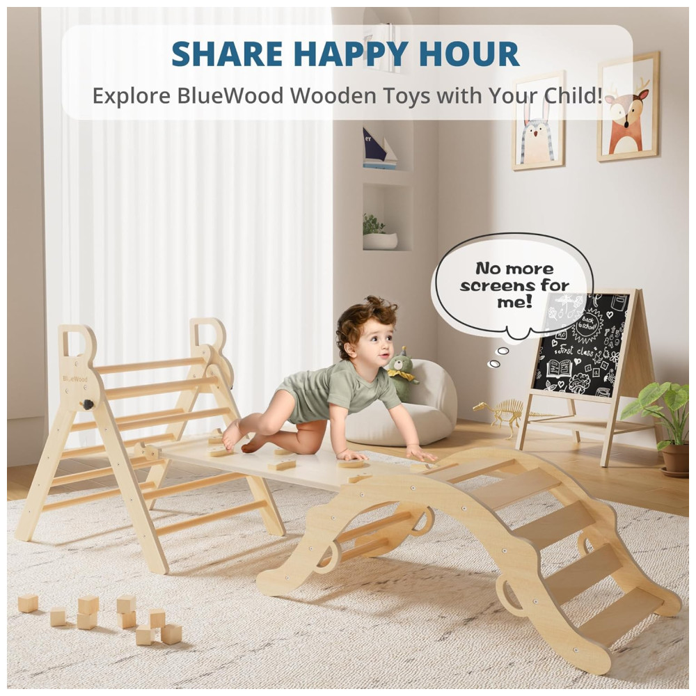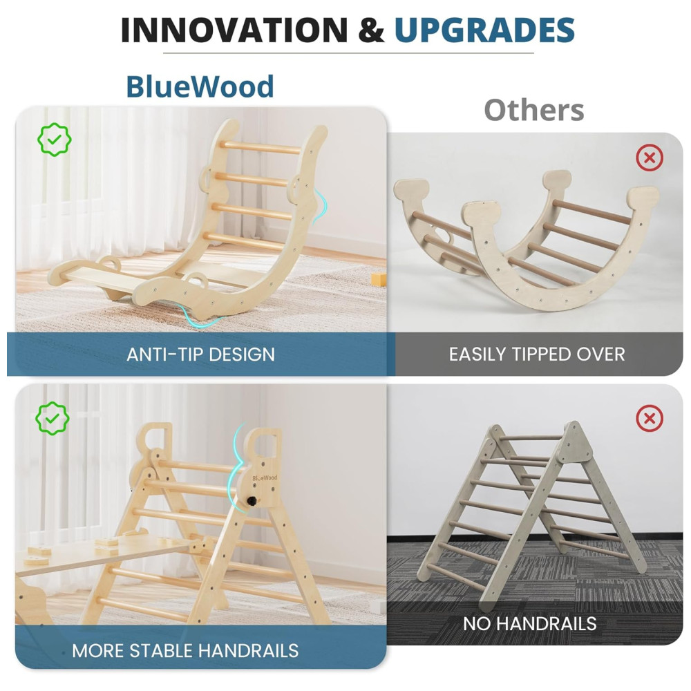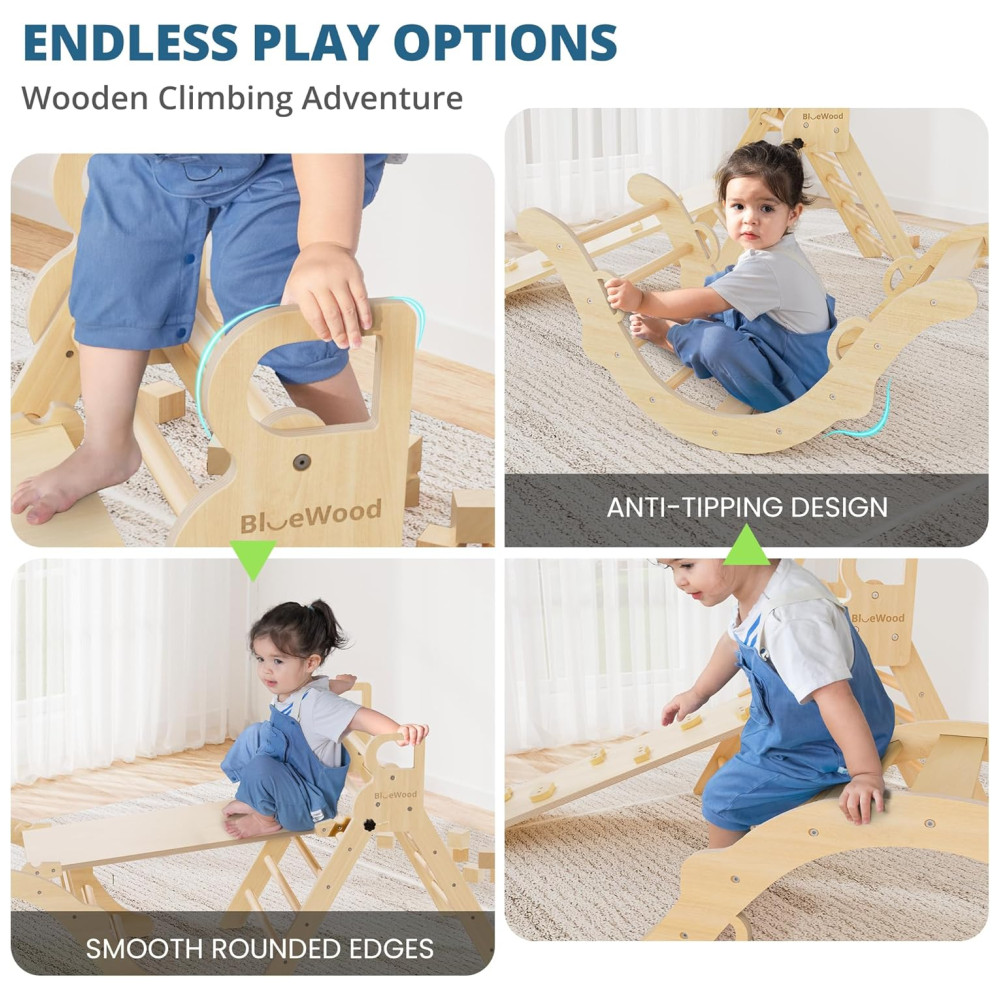 Conjunto BlueWood Pikler Triangle: Brinquedo de Escalada de Madeira para Crianças Montessori 7 em 1 Design Exclusivo e Sustentável