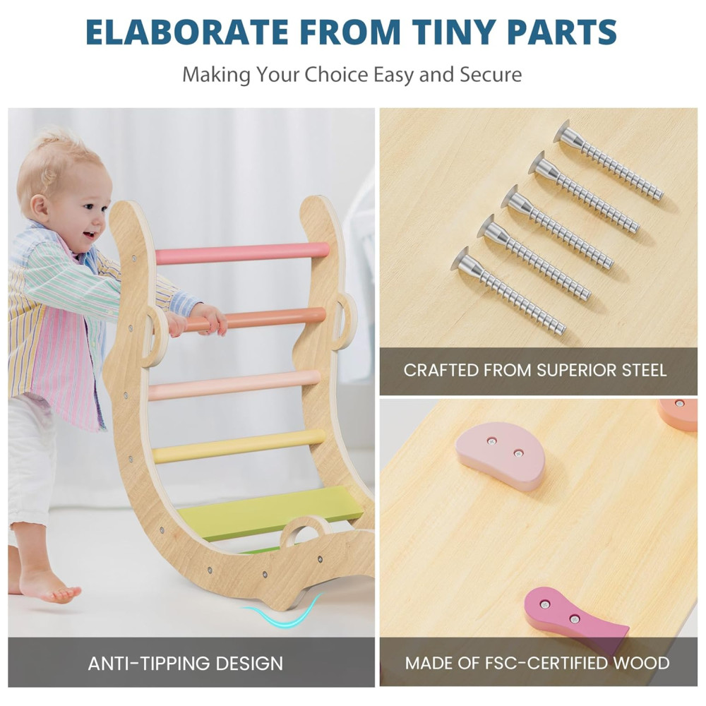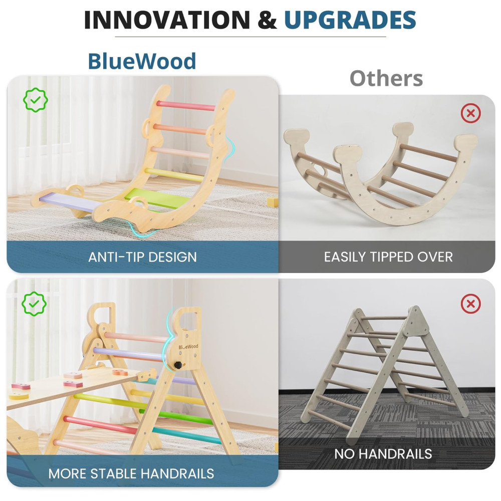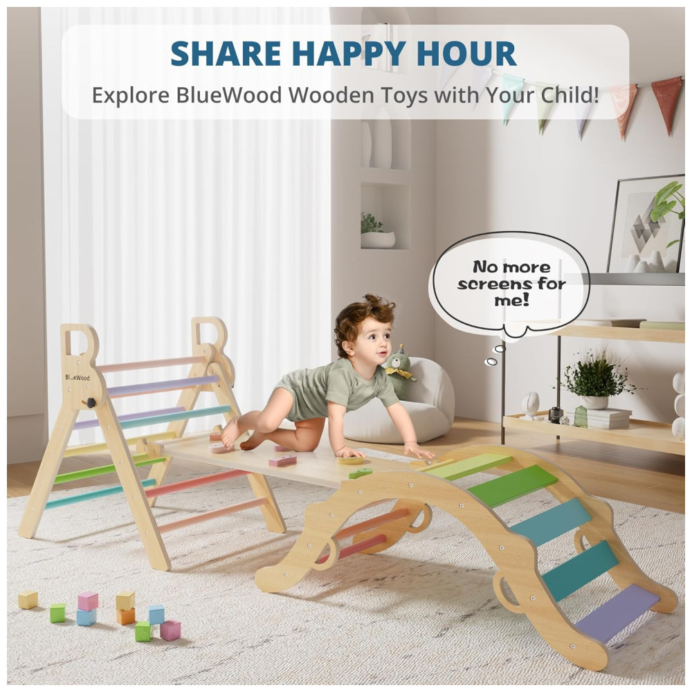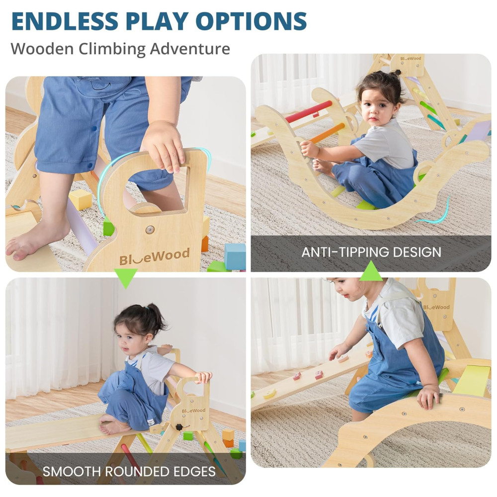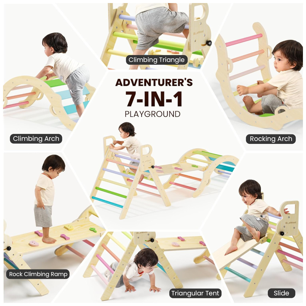 Conjunto BlueWood Pikler Triangle: Brinquedo de Escalada de Madeira para Crianças Montessori com 7 em 1 Design Exclusivo e Colorido
