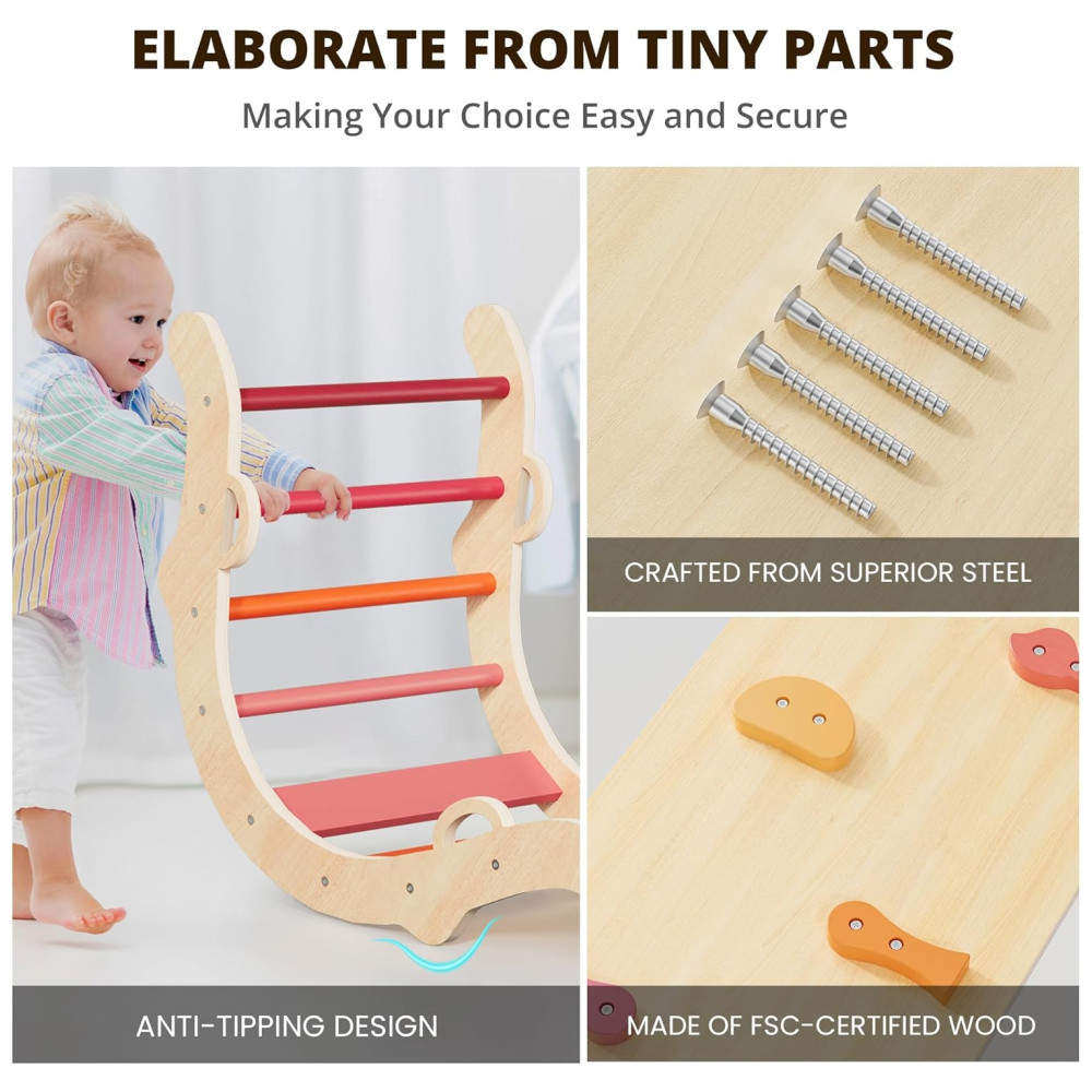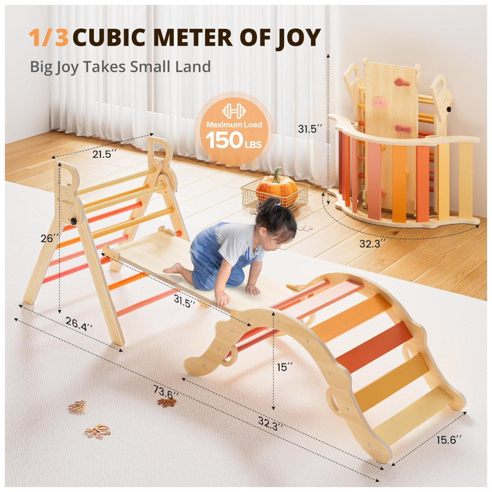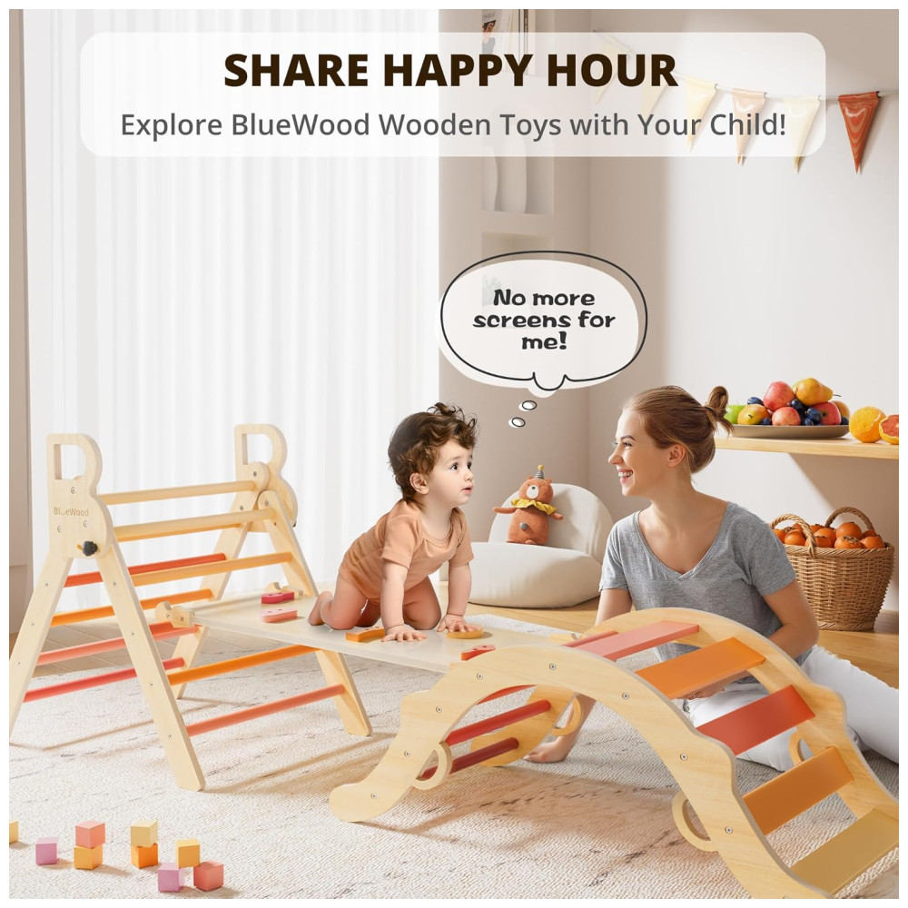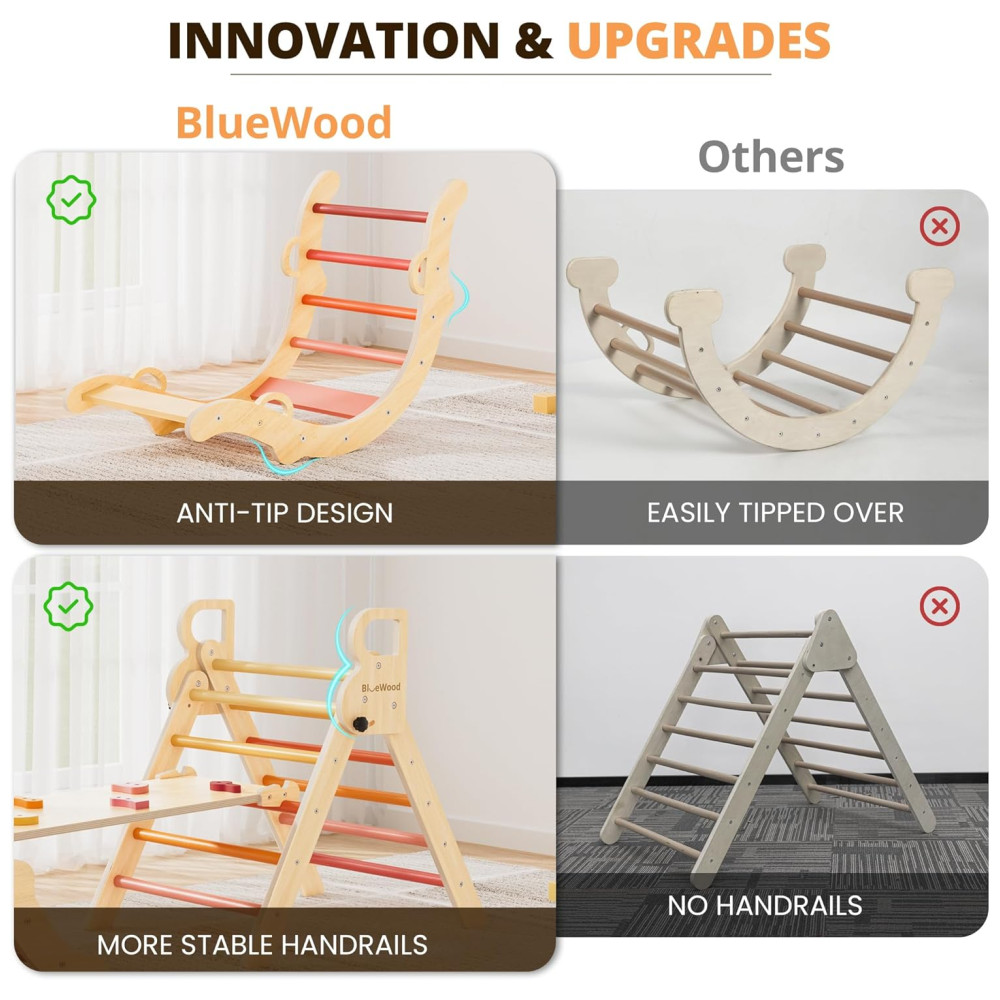 Conjunto BlueWood Pikler Triangle: Brinquedo de Escalada de Madeira para Crianças Montessori Play Gym com Arco Rampa e Escada – Autêntica Diversão d