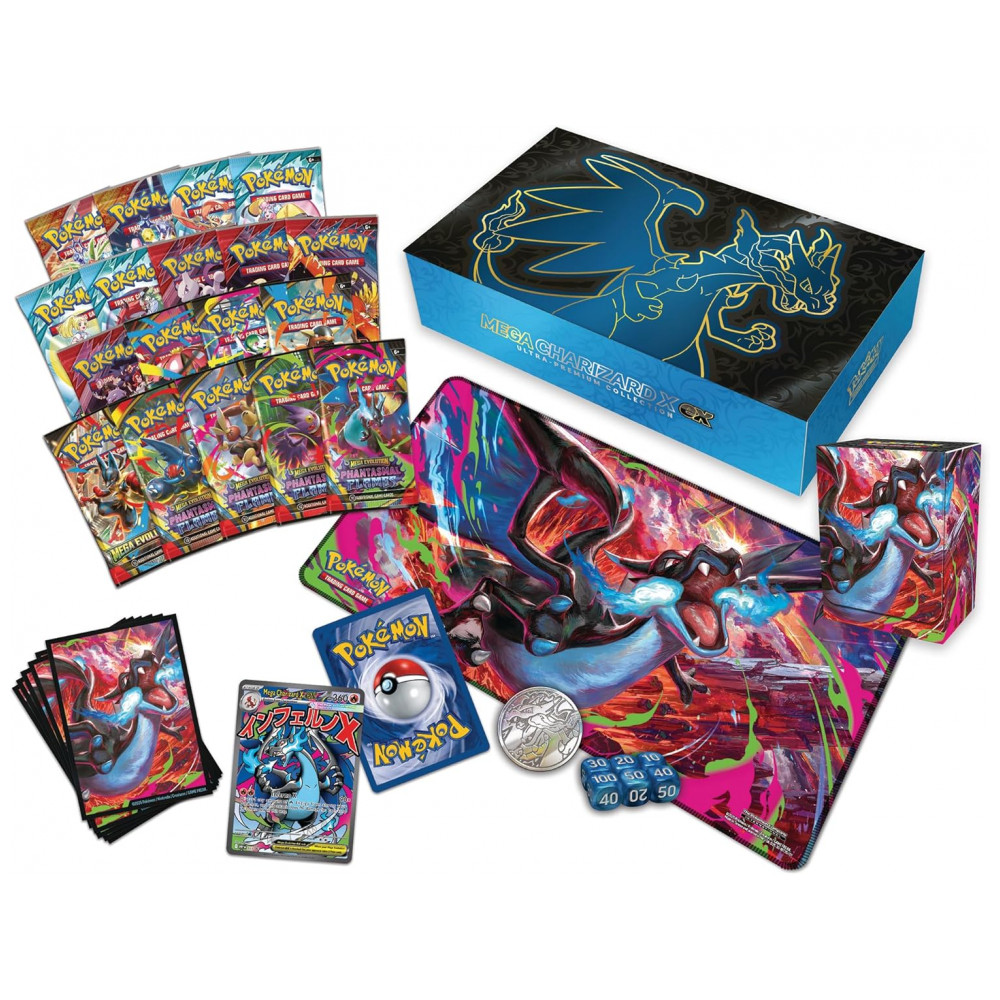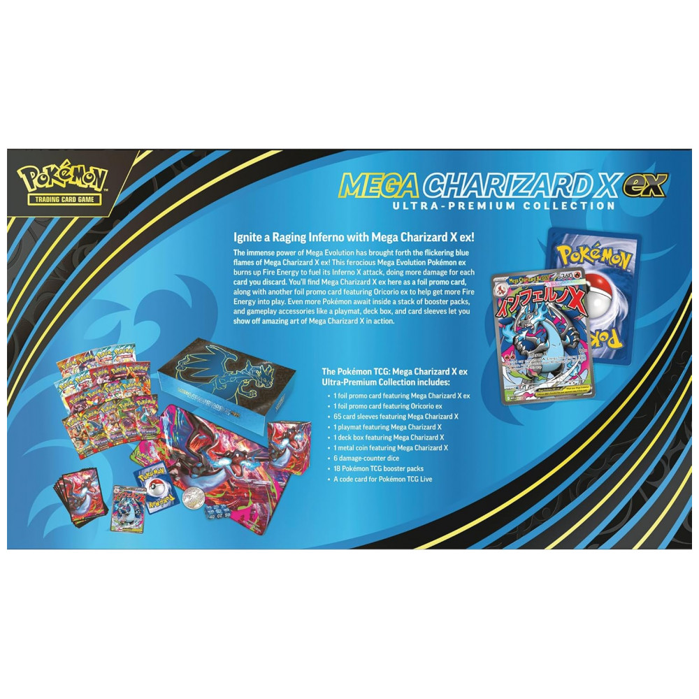 O Pokémon TCG Mega Charizard X ex Ultra-Premium Collection é um conjunto ultra premium em inglês voltado para jogadores e colecionadores que buscam cartas promocionais exclusivas e acessórios de jogo temáticos do Mega Charizard X ex. O kit inclui carta promocional foil de Mega Charizard X ex e carta promocional foil adicional de Oricorio ex, ambas adequadas para uso em decks temáticos de fogo.
