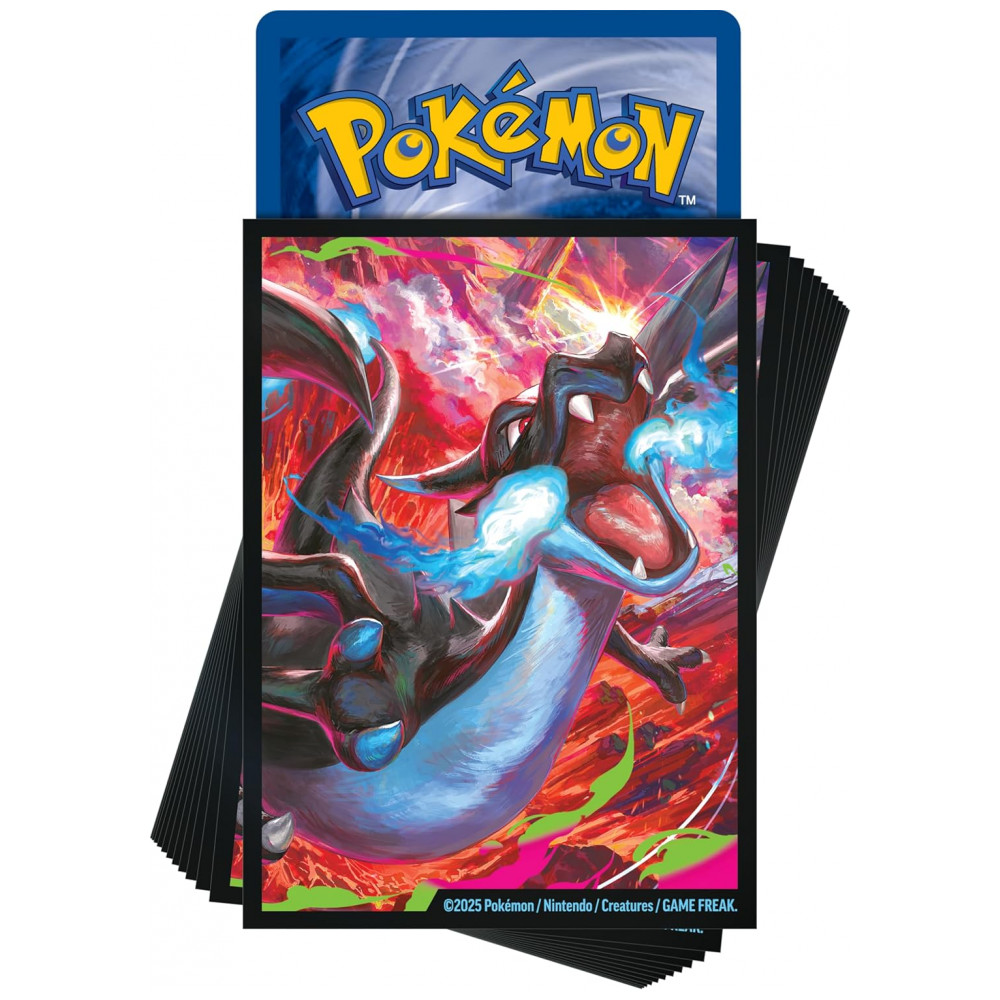 Conteúdo da caixa – acessórios de proteção: 65 sleeves com arte do Mega Charizard X, 1 deck box temática Mega Charizard X