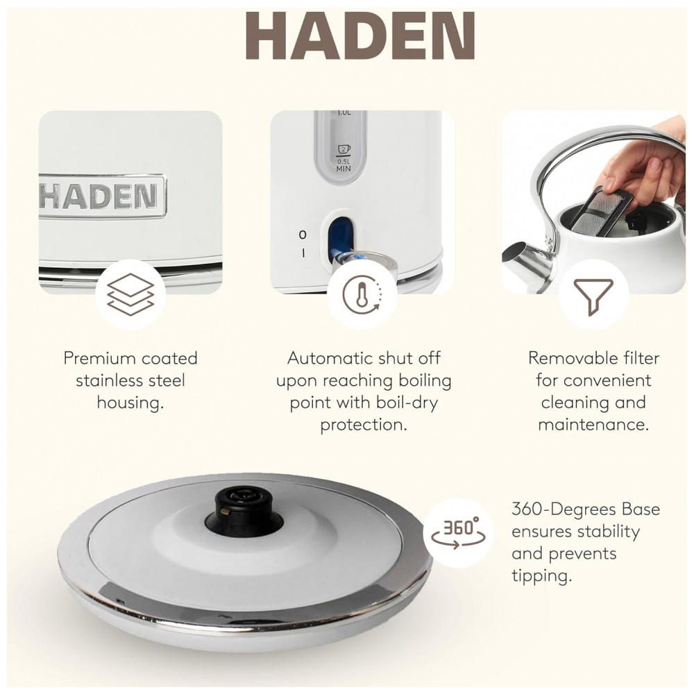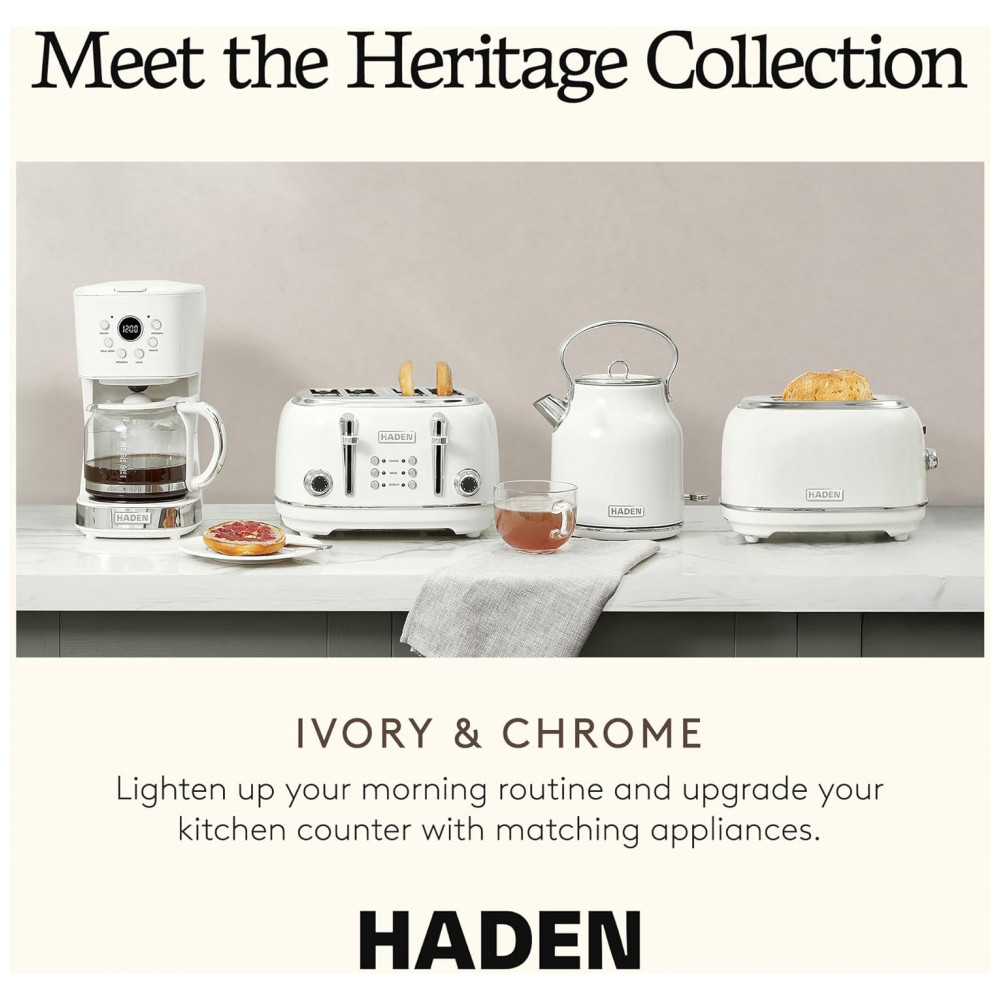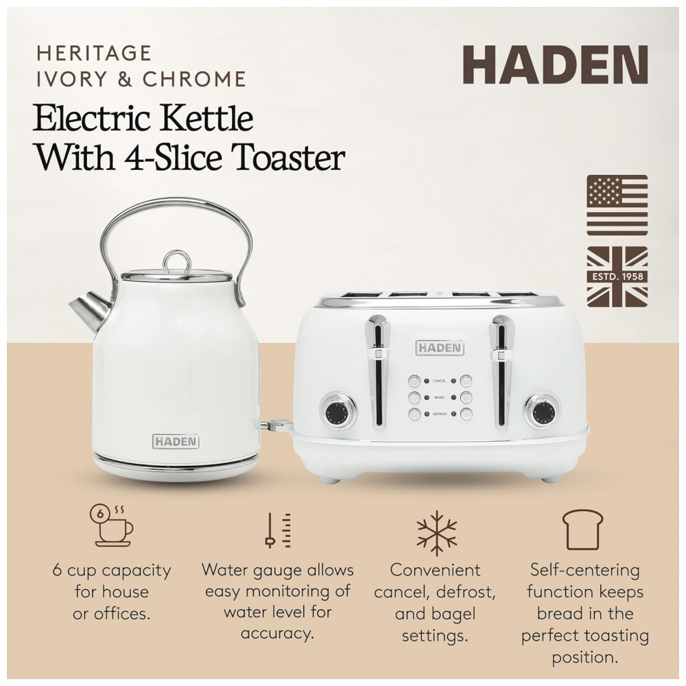 O conjunto HADEN Heritage marfim reúne uma chaleira elétrica em aço inox com capacidade de 1,7 litro e uma torradeira elétrica retrô de 4 fatias com fendas largas, projetados para uso diário em cozinhas residenciais. A chaleira possui base giratória 360°, indicador de nível de água, filtro removível e luz indicadora de funcionamento, com proteção contra fervura a seco para uso mais seguro.