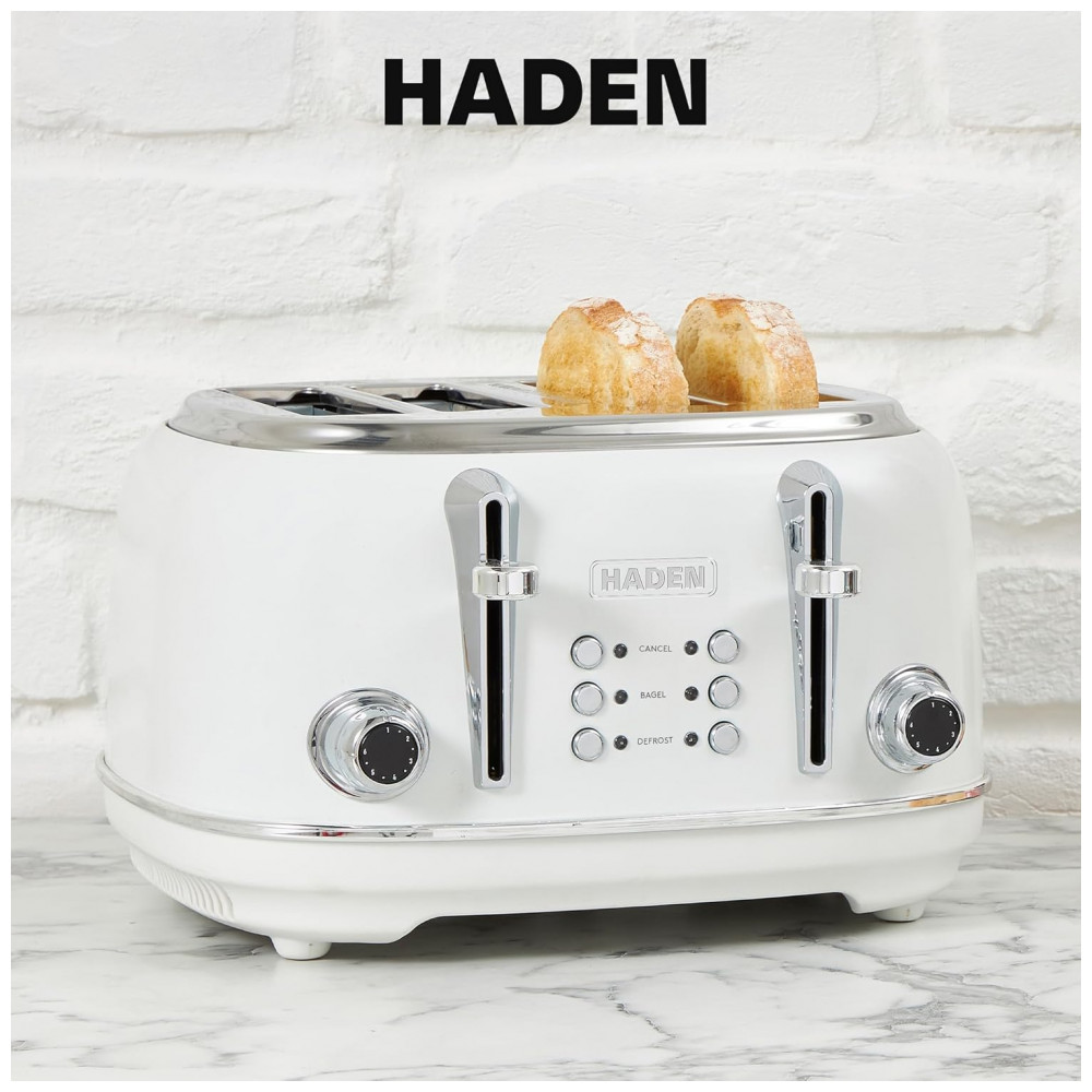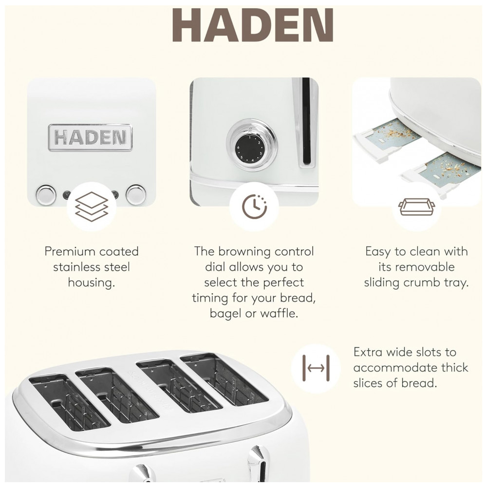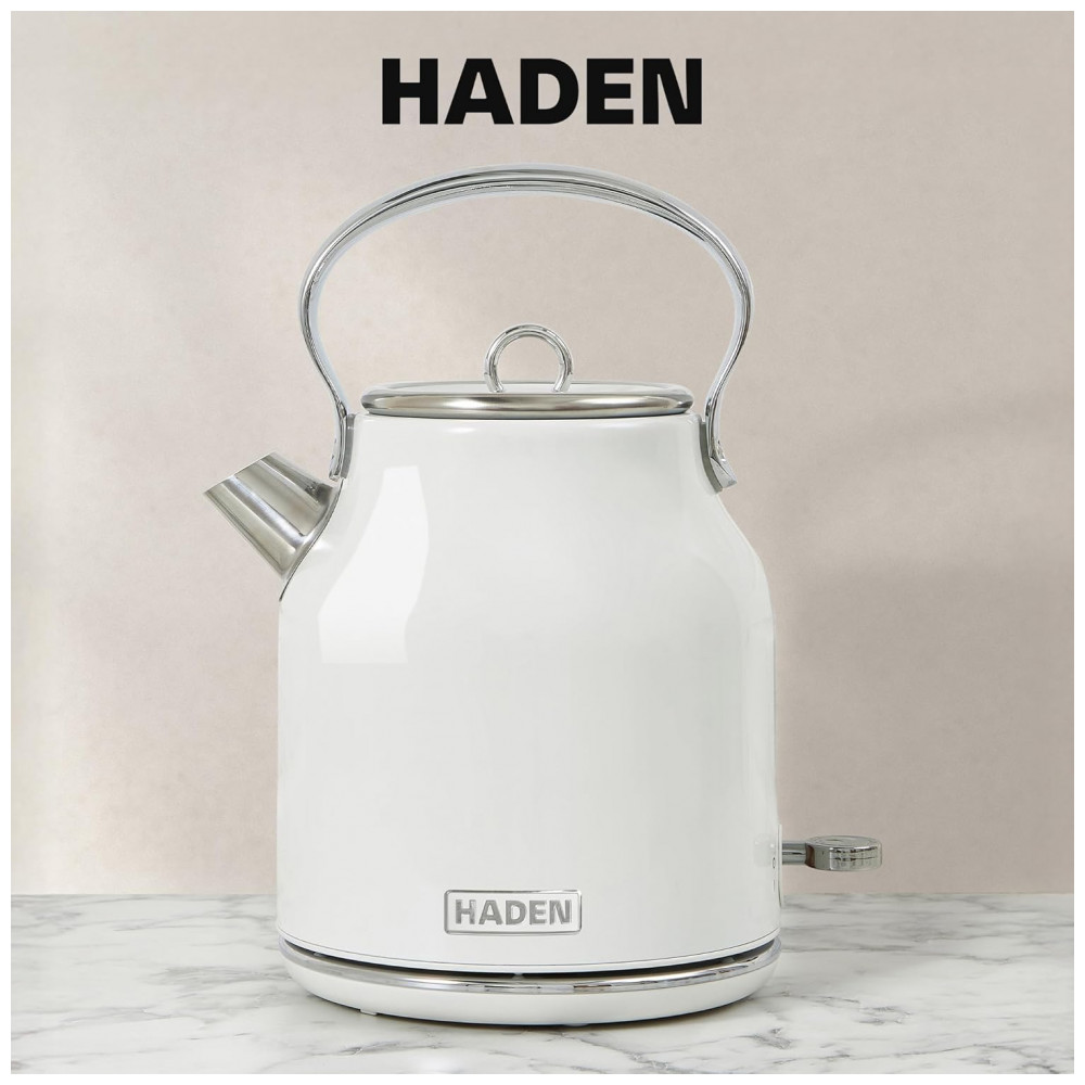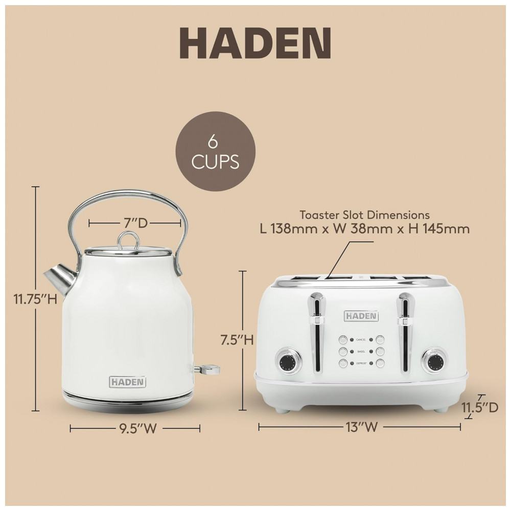 O conjunto HADEN Heritage marfim reúne uma chaleira elétrica em aço inox com capacidade de 1,7 litro e uma torradeira elétrica retrô de 4 fatias com fendas largas, projetados para uso diário em cozinhas residenciais. A chaleira possui base giratória 360°, indicador de nível de água, filtro removível e luz indicadora de funcionamento, com proteção contra fervura a seco para uso mais seguro.