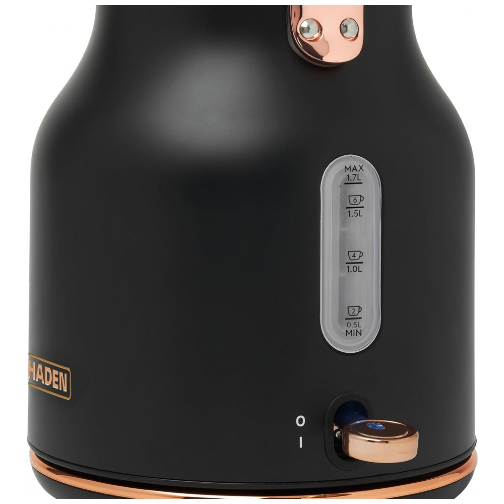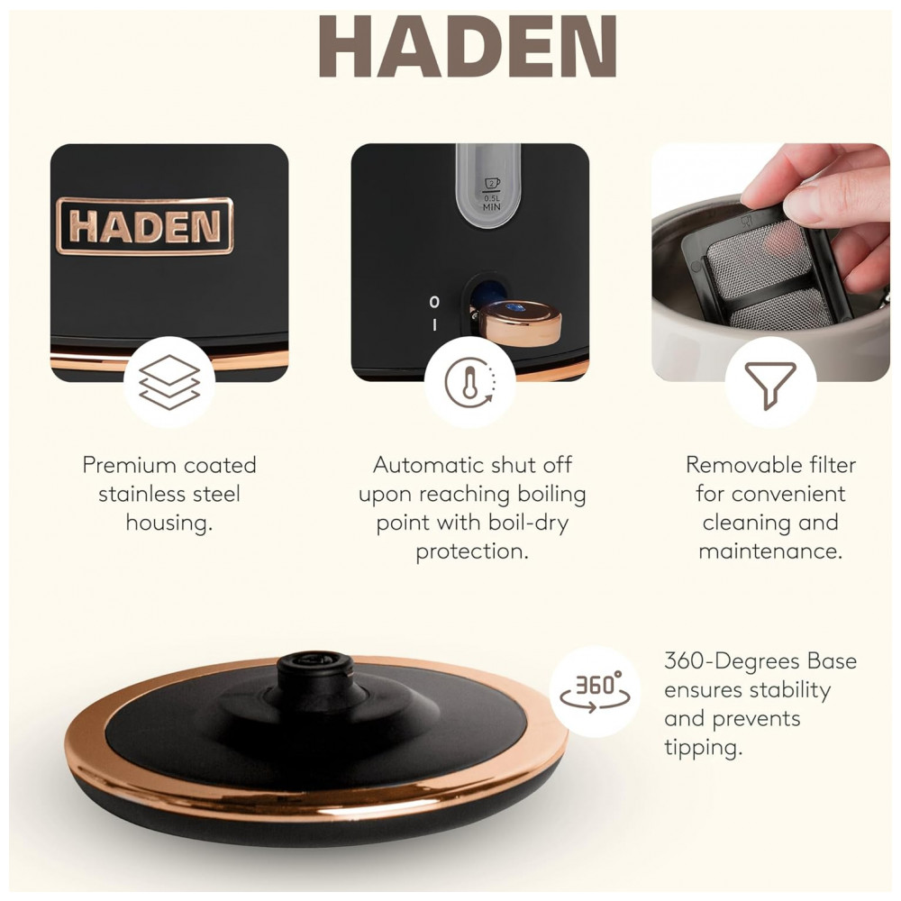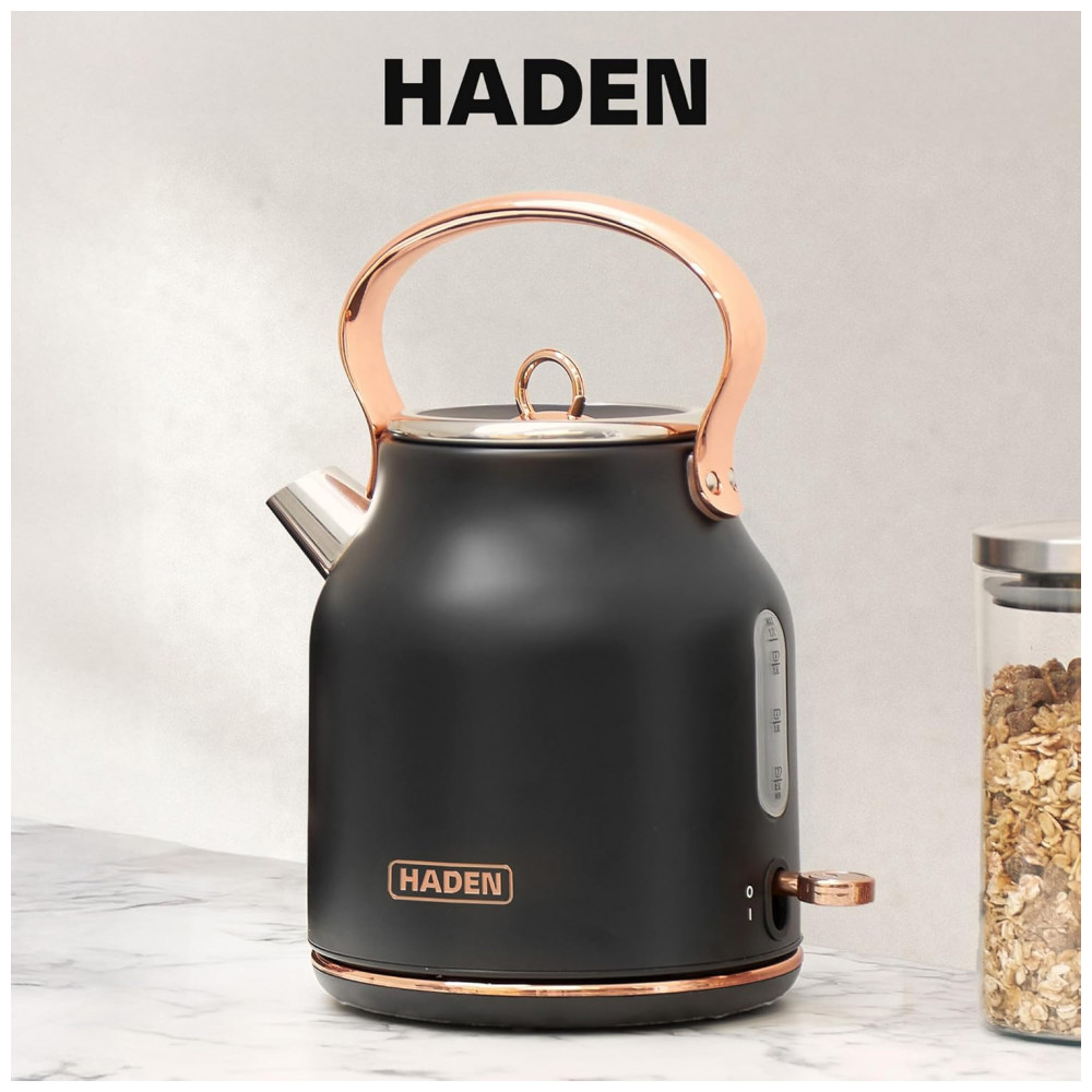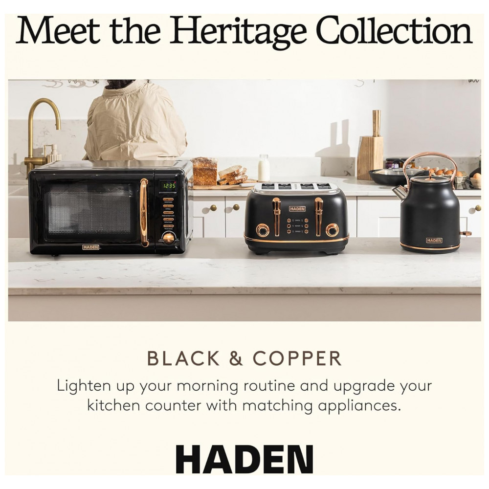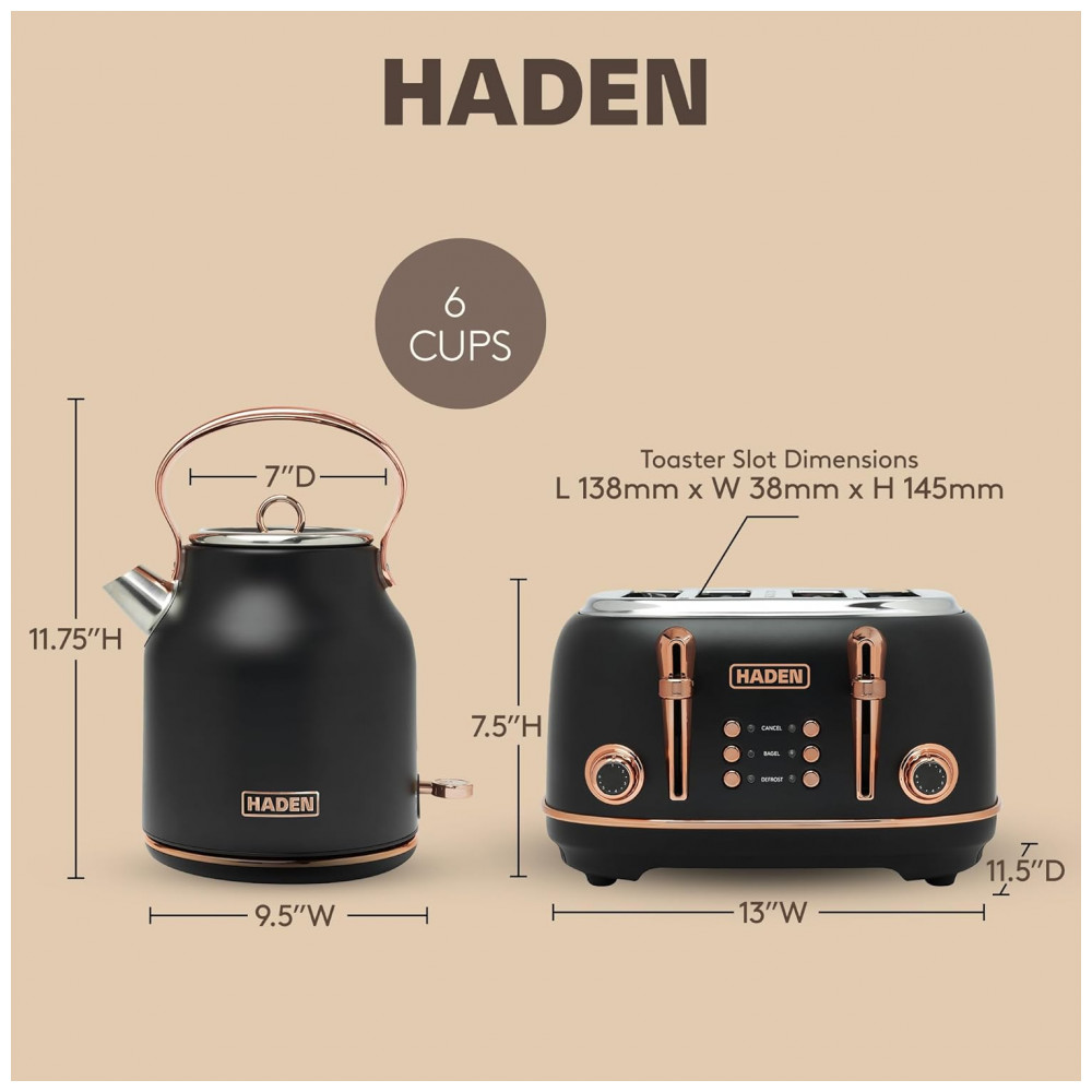 O conjunto HADEN Heritage preto e cobre reúne uma chaleira elétrica em aço inox com capacidade de 1,7 litro e uma torradeira elétrica de 4 fatias com fendas largas, projetados para uso diário em cozinhas residenciais. A chaleira possui acabamento em inox com detalhes em cobre, proteção contra fervura a seco, luz indicadora em LED e capacidade aproximada para 7 xícaras de água, indicada para preparo de chá, café e uso geral na cozinha.