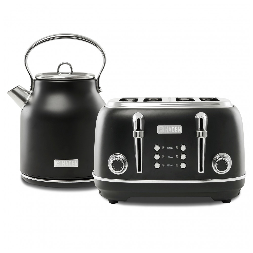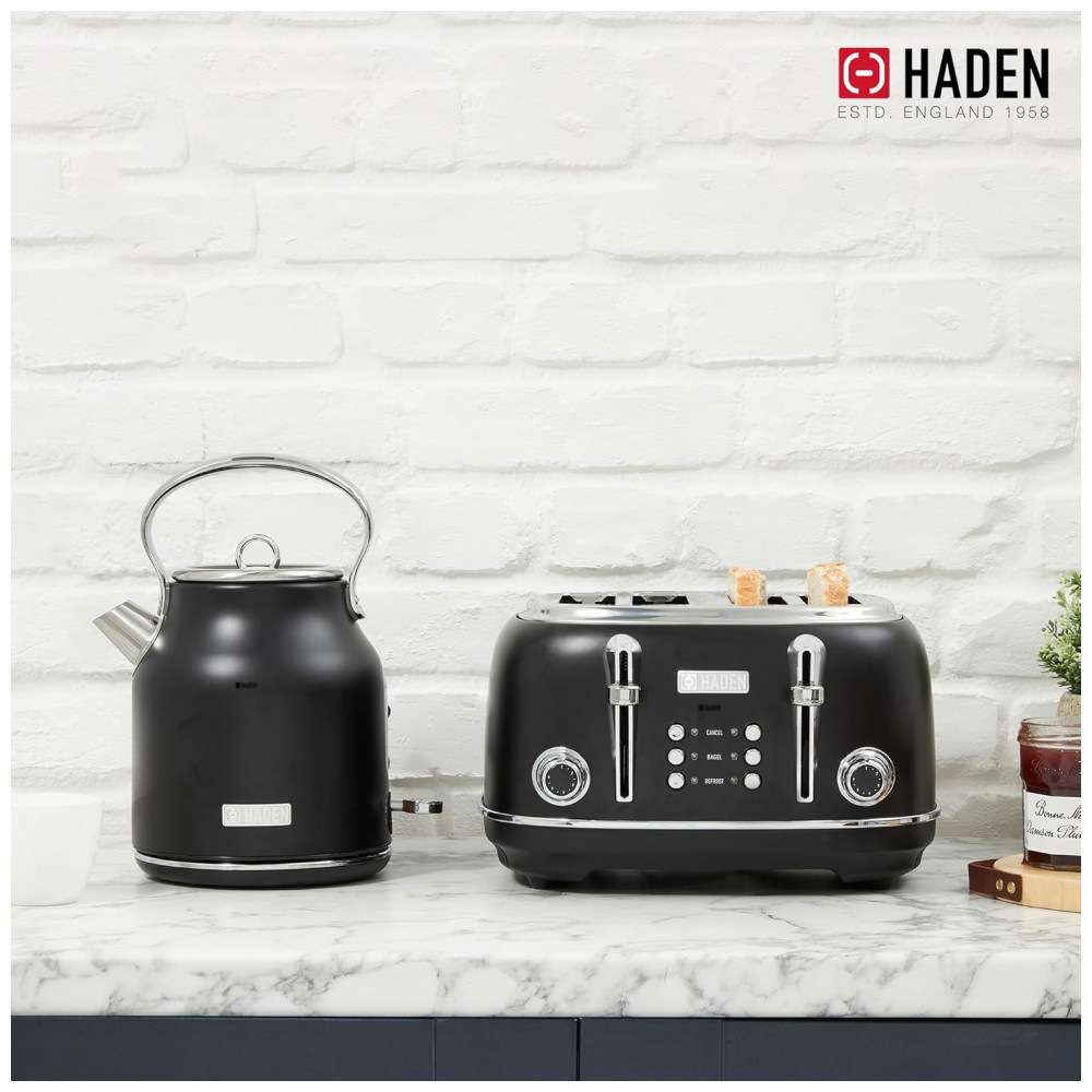Conjunto chaleira elétrica e torradeira HADEN Heritage inox preta e cromada 4 fatias 17L 110V