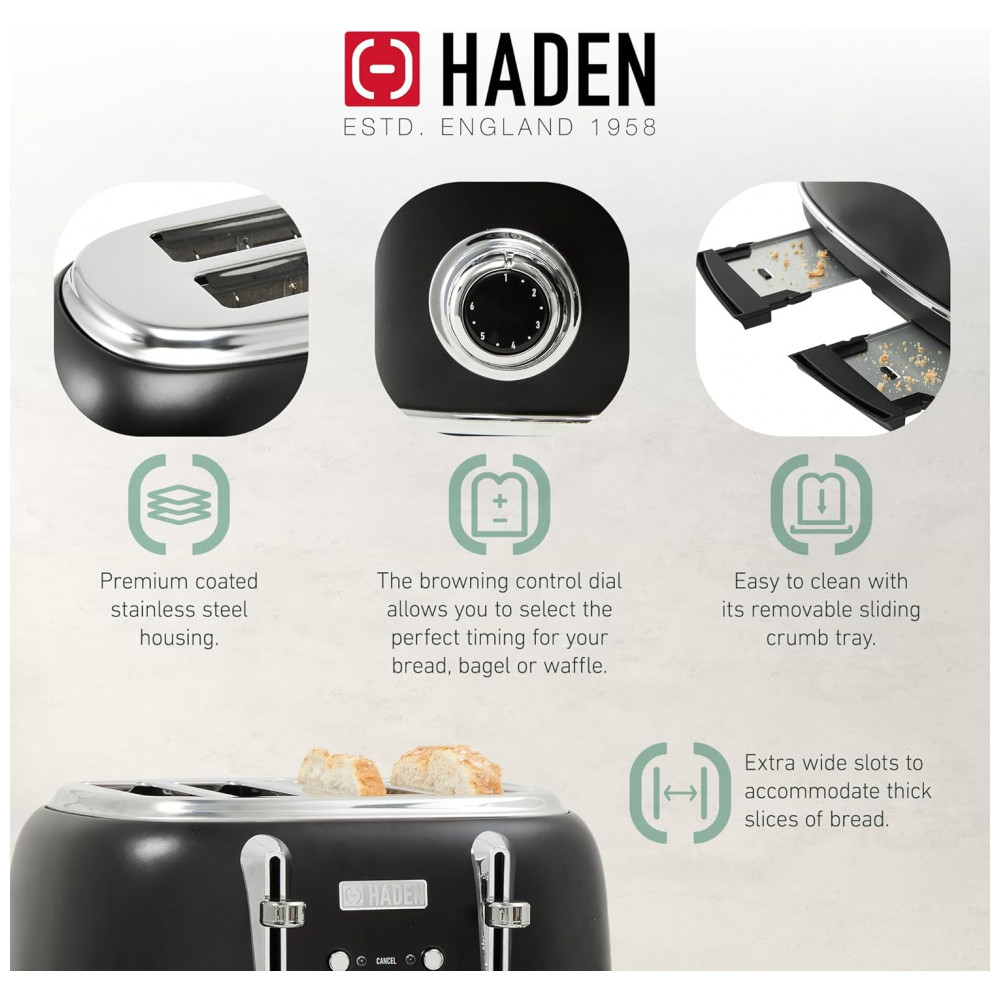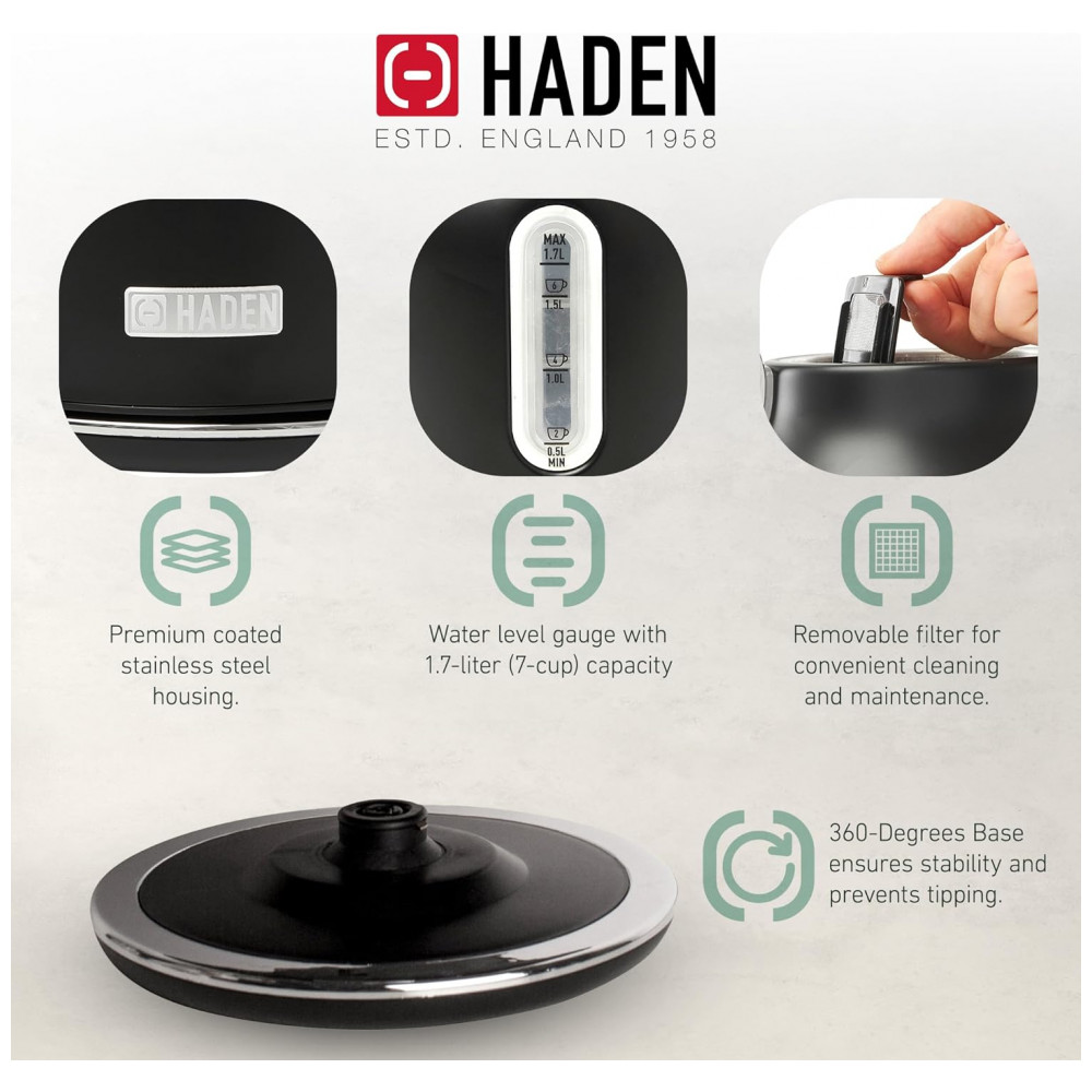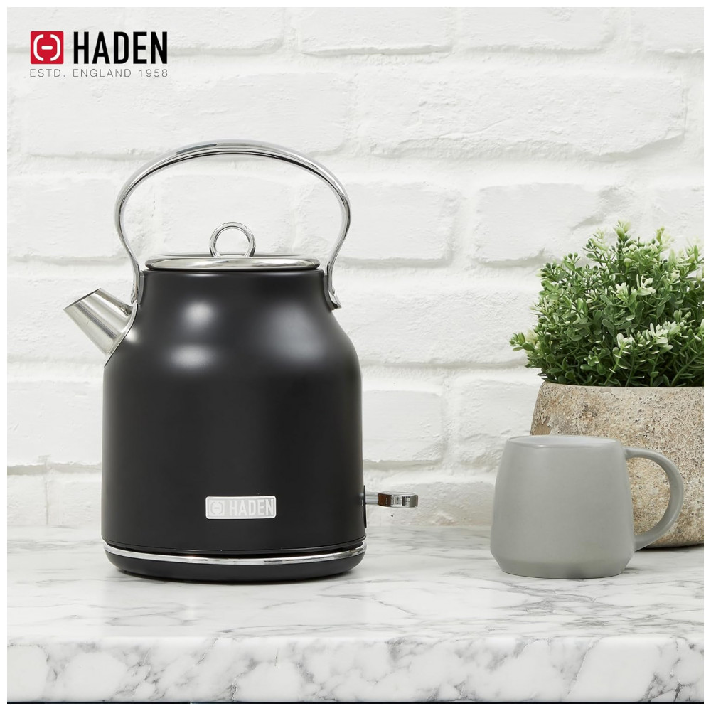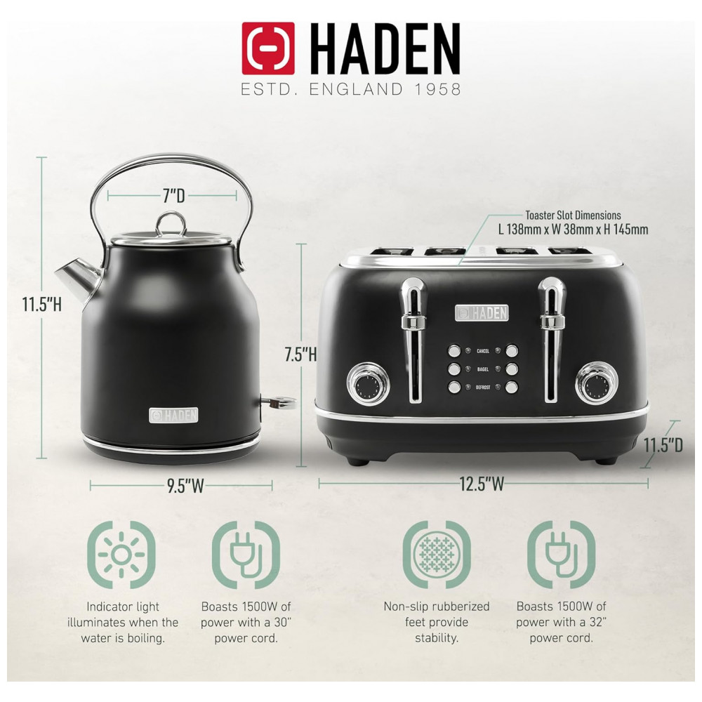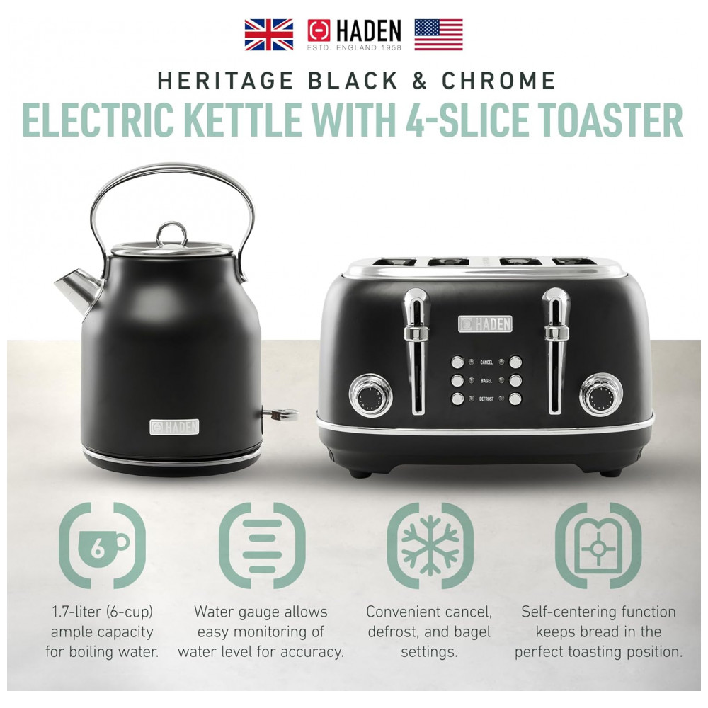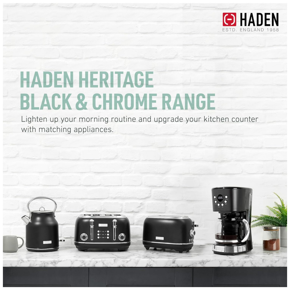 O conjunto HADEN Heritage preto e cromado reúne uma chaleira elétrica em aço inox com capacidade de 1,7 litro e uma torradeira elétrica de 4 fatias com fendas largas, indicado para uso diário em cozinhas residenciais. A chaleira oferece capacidade aproximada para 7 xícaras de água, adequada para preparo de chá, café e apoio em rotinas de cozinha, mantendo o visual clássico da linha Heritage.
