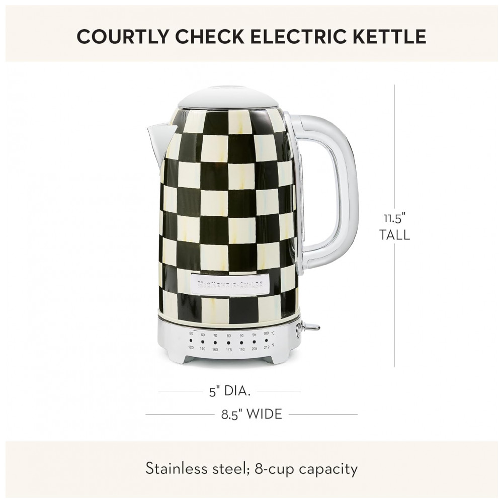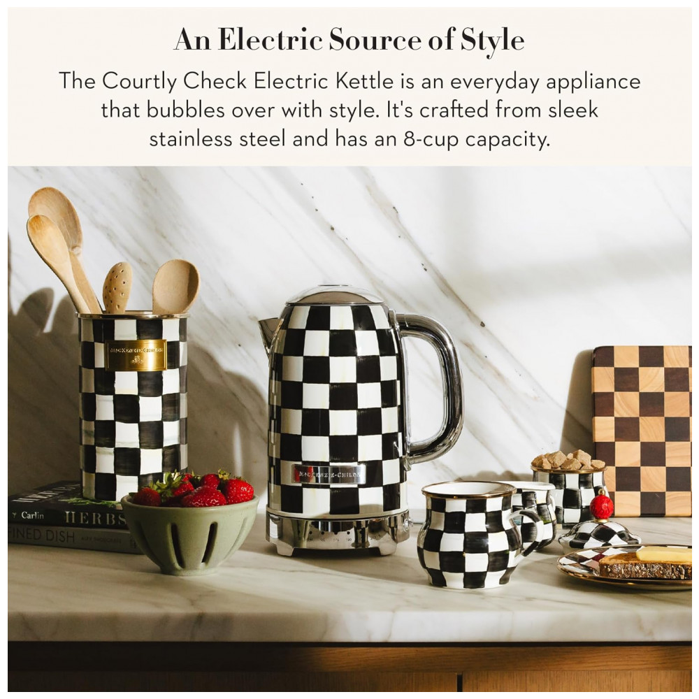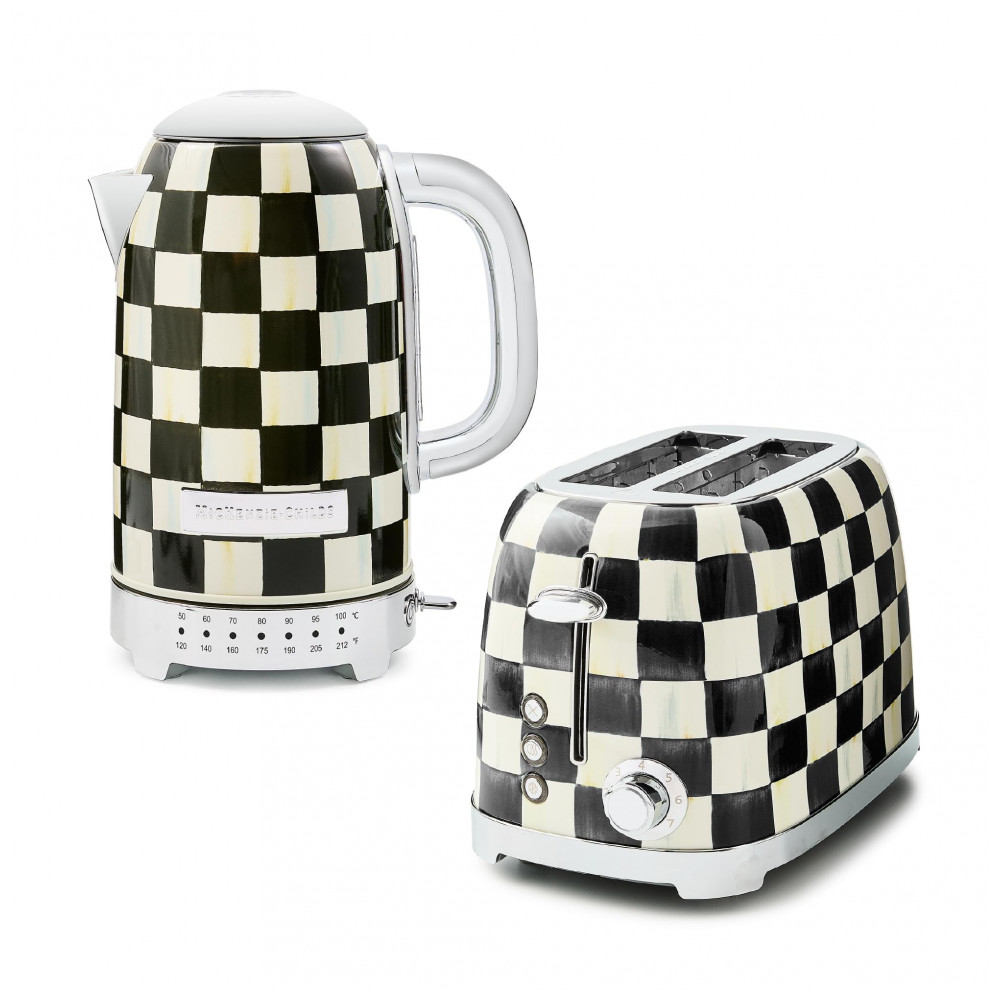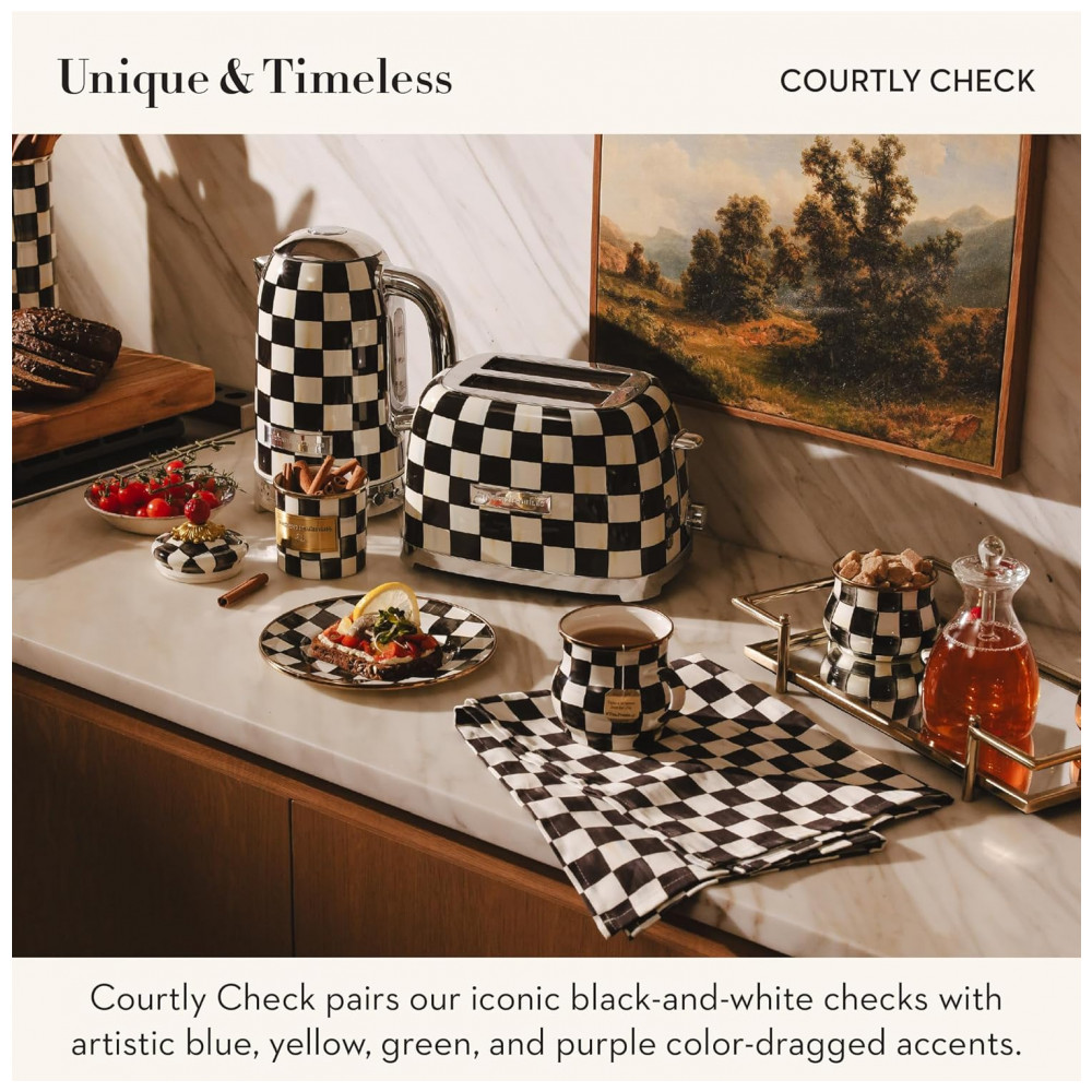 O conjunto Mackenzie-Childs Courtly Check reúne uma chaleira elétrica em inox e uma torradeira elétrica para 2 fatias, ambos com acabamento em padrão xadrez preto e branco característico da marca. As peças foram desenvolvidas como eletroportáteis de bancada para preparo de bebidas quentes e torradas no dia a dia, aliando função prática e aspecto decorativo para cozinhas residenciais.
