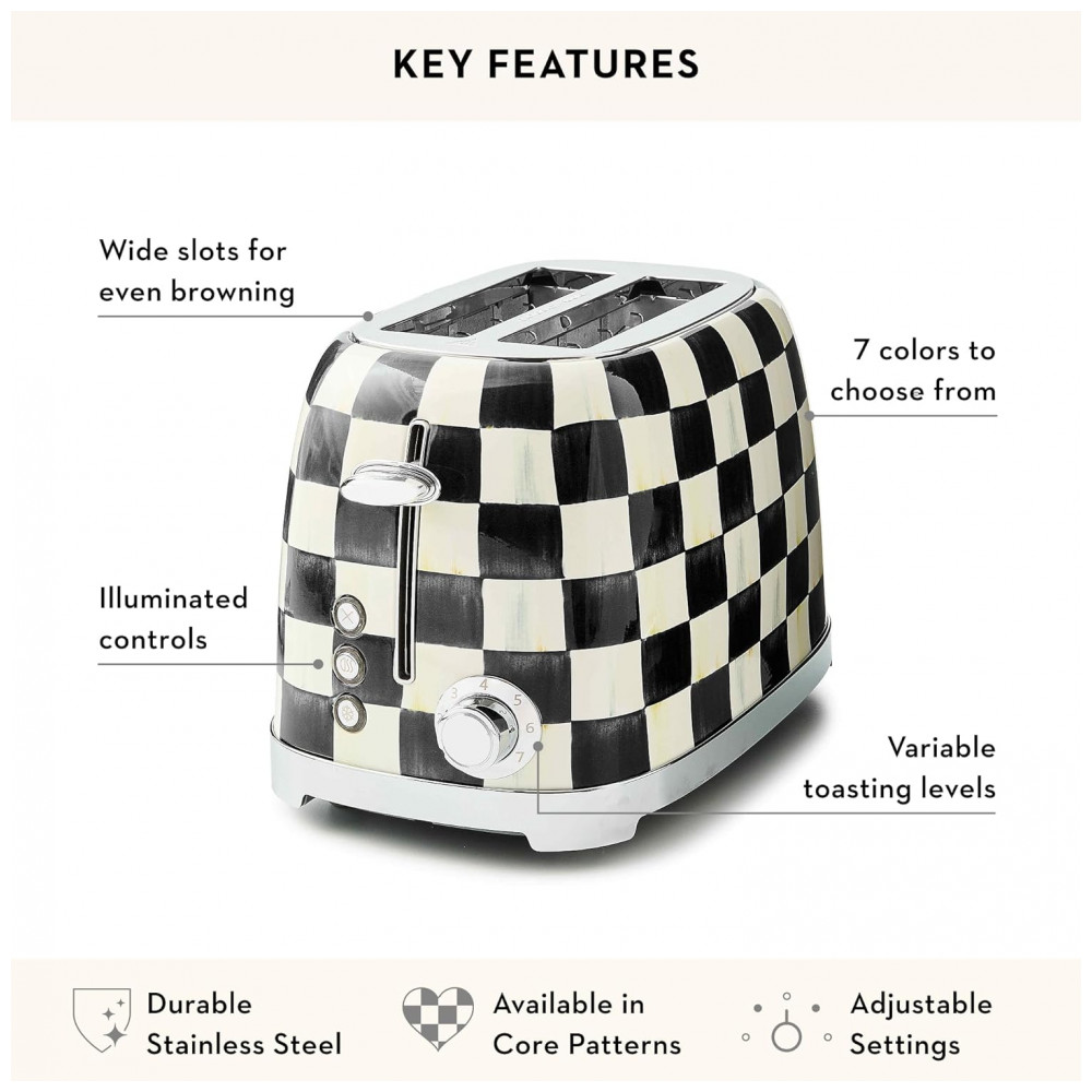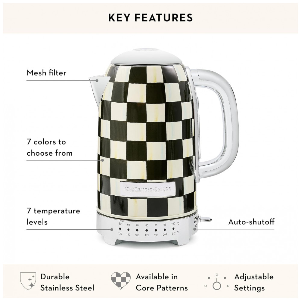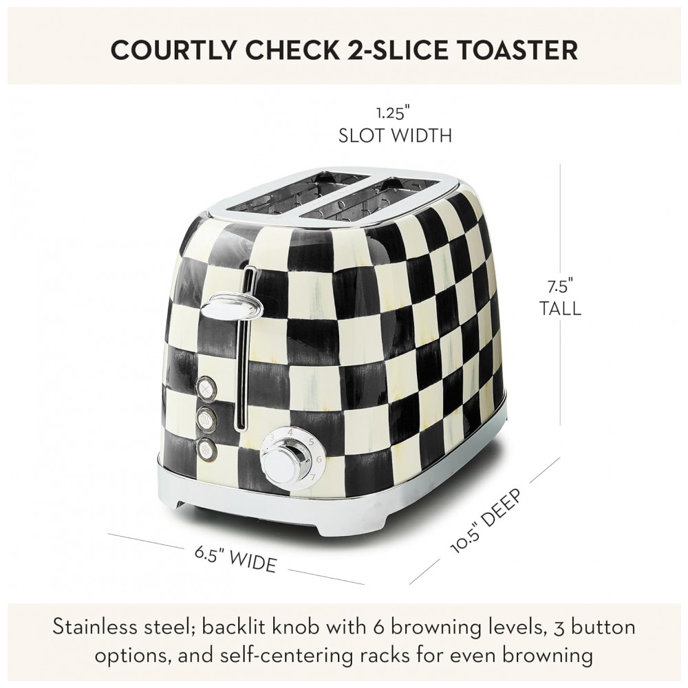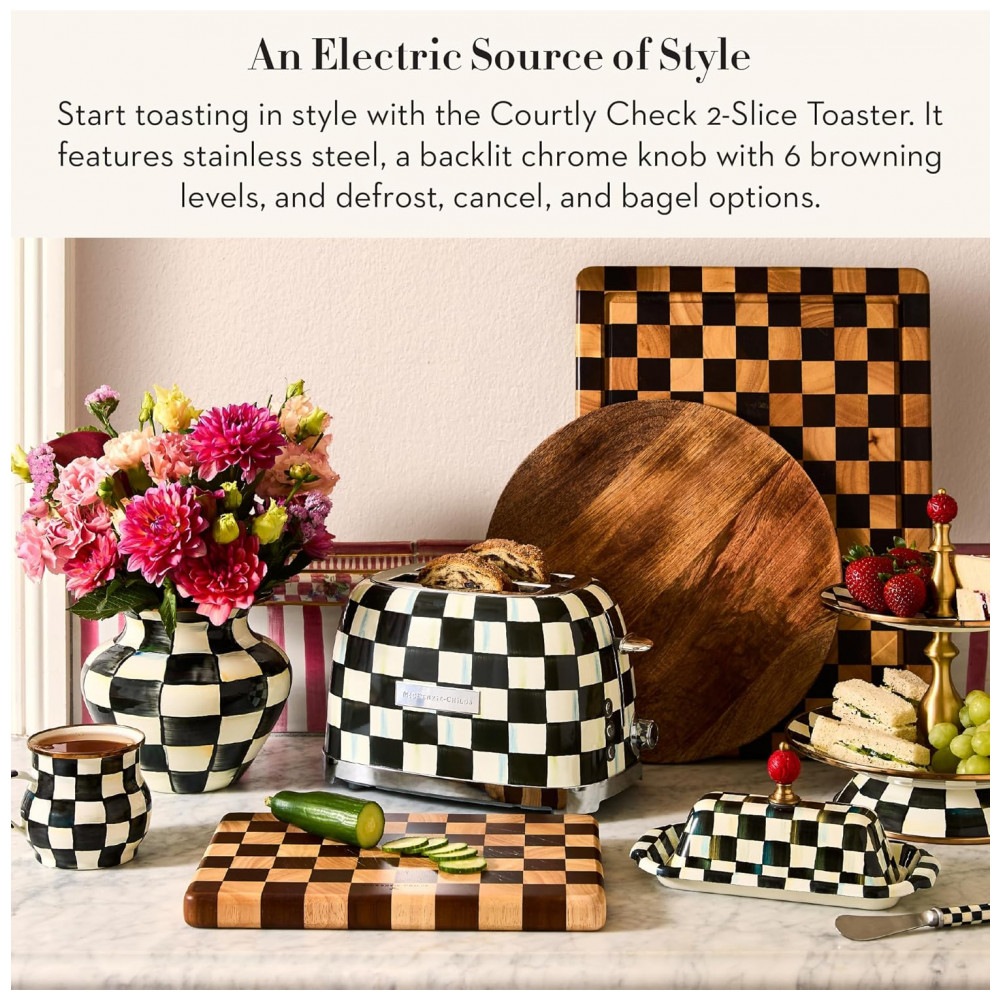 O conjunto Mackenzie-Childs Courtly Check reúne uma chaleira elétrica em inox e uma torradeira elétrica para 2 fatias, ambos com acabamento em padrão xadrez preto e branco característico da marca. As peças foram desenvolvidas como eletroportáteis de bancada para preparo de bebidas quentes e torradas no dia a dia, aliando função prática e aspecto decorativo para cozinhas residenciais.
