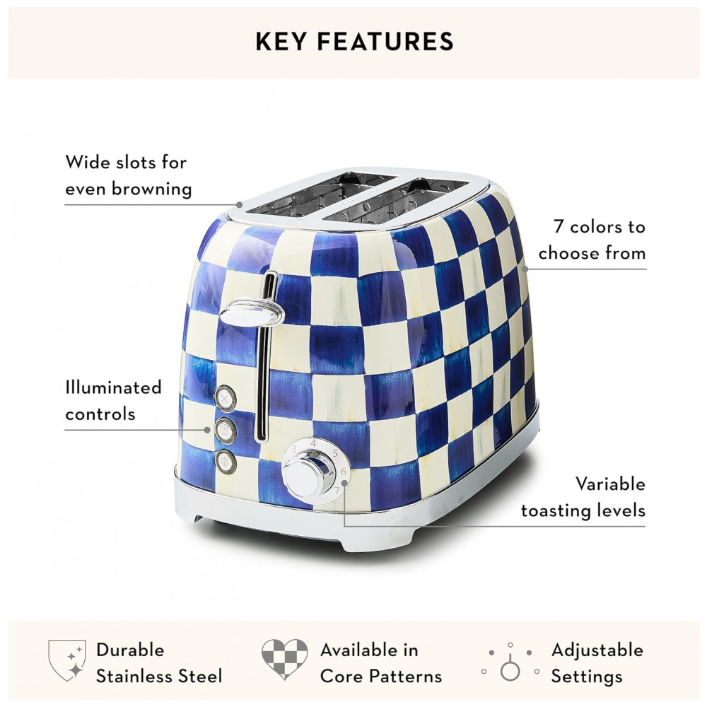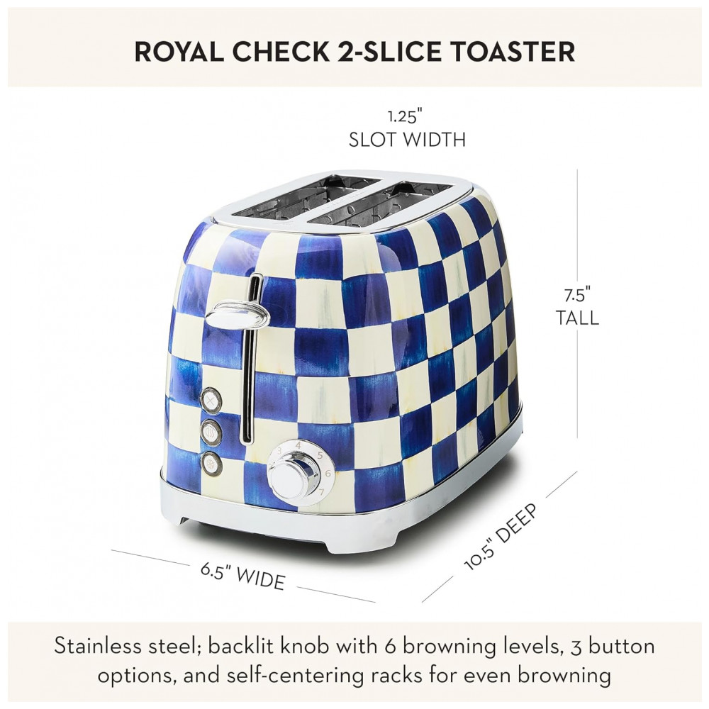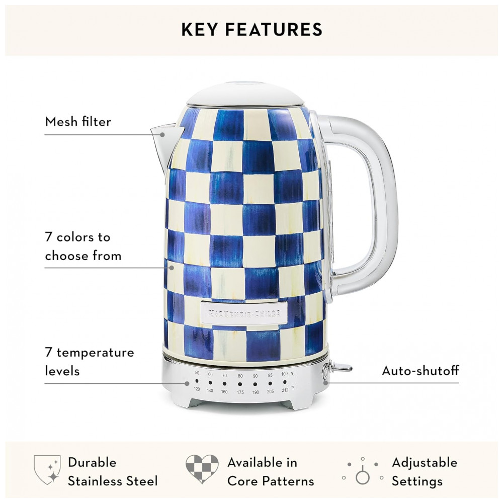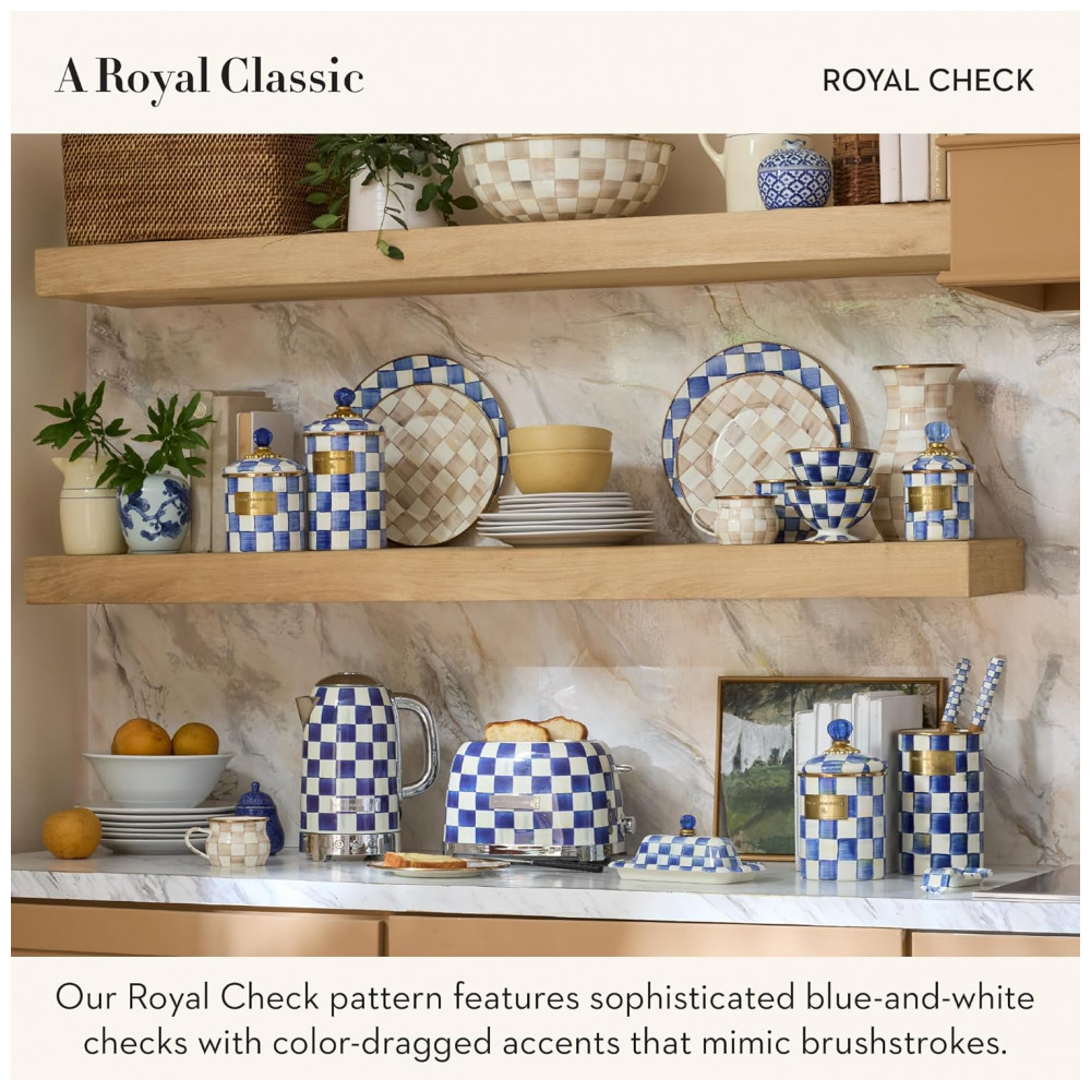 O conjunto Mackenzie-Childs Royal Check reúne uma chaleira elétrica em aço inox e uma torradeira elétrica para 2 fatias, ambas com acabamento em padrão xadrez azul e branco característico da linha Royal Check. As duas peças foram desenvolvidas como eletroportáteis de bancada para preparo de bebidas quentes e torradas, unindo função prática e elemento decorativo para cozinhas residenciais.