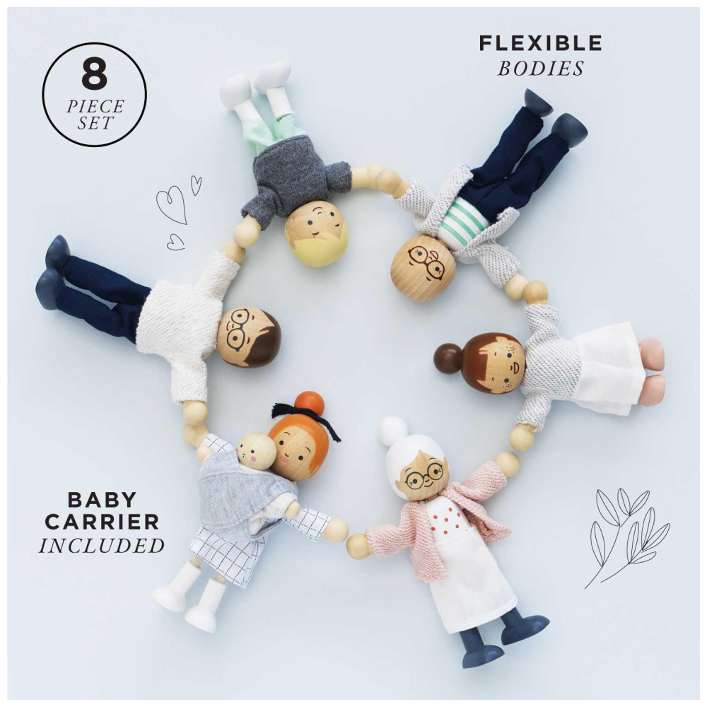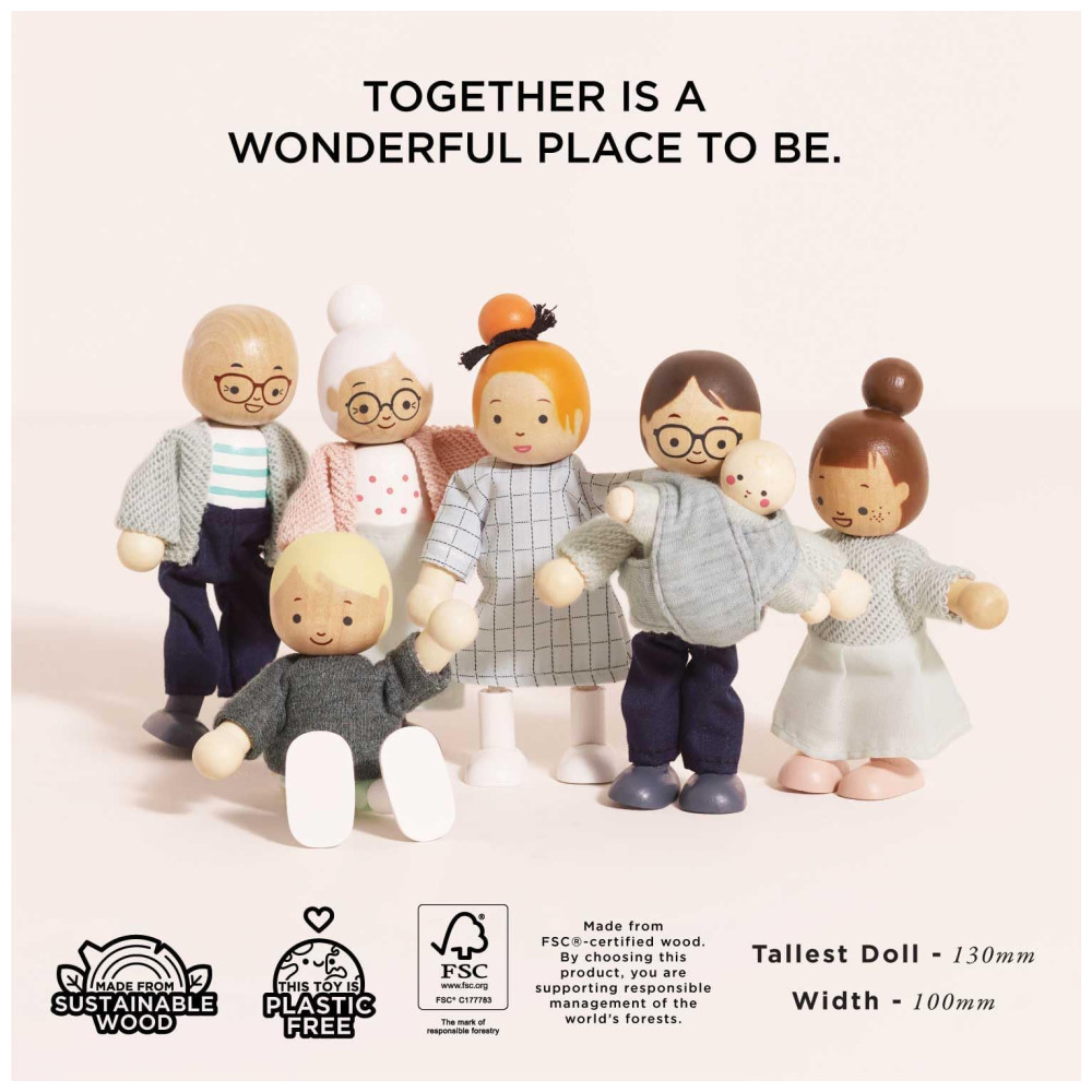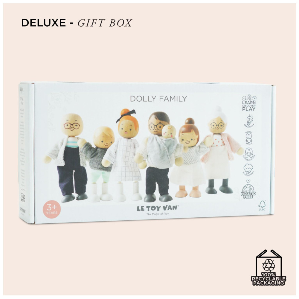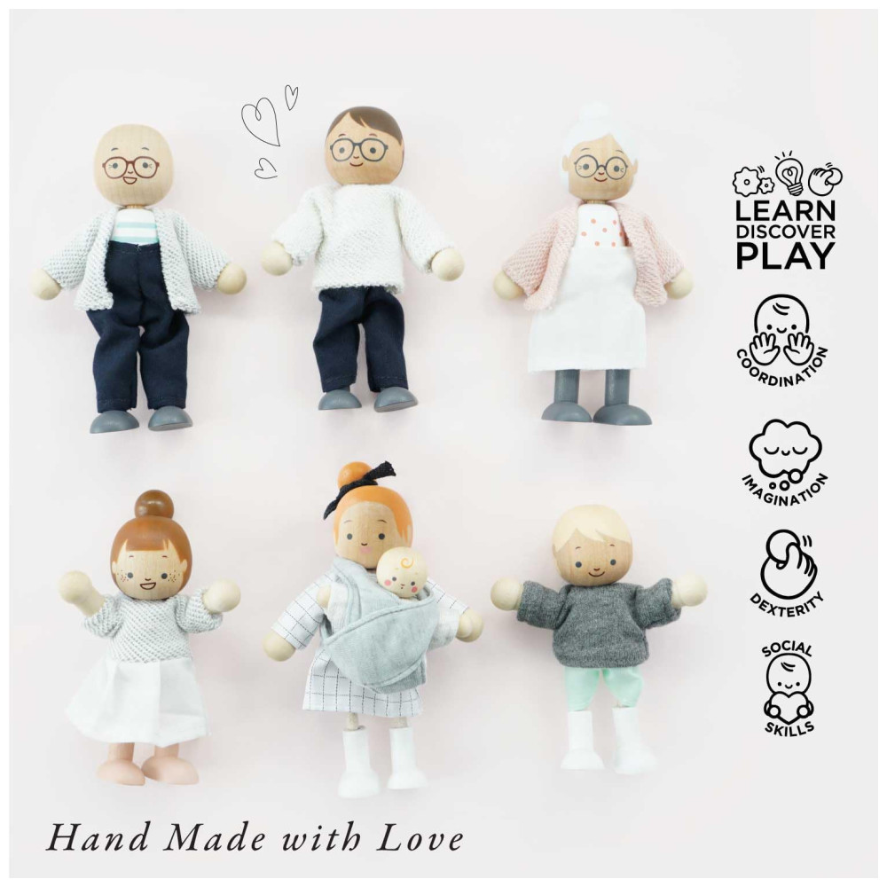 Le Toy Van oferece bonecos e acessórios cuidadosamente elaborados para casas de bonecas. O Conjunto Minha Família é intuitivamente projetado e pintado à mão, trazendo vida às histórias criadas pelas crianças.