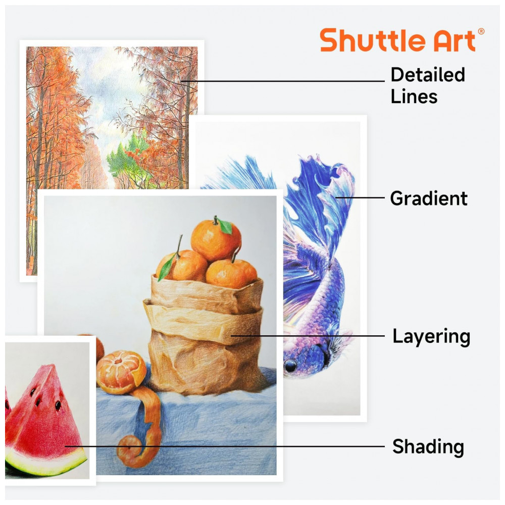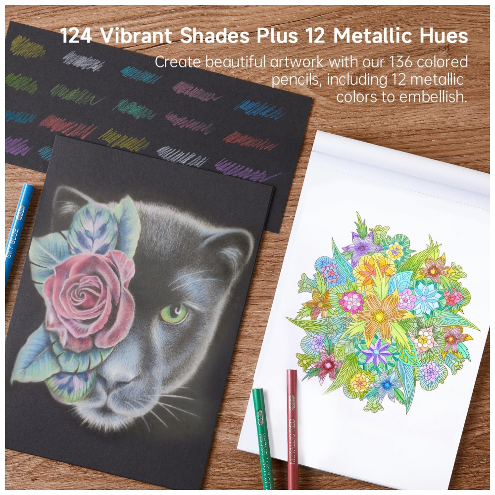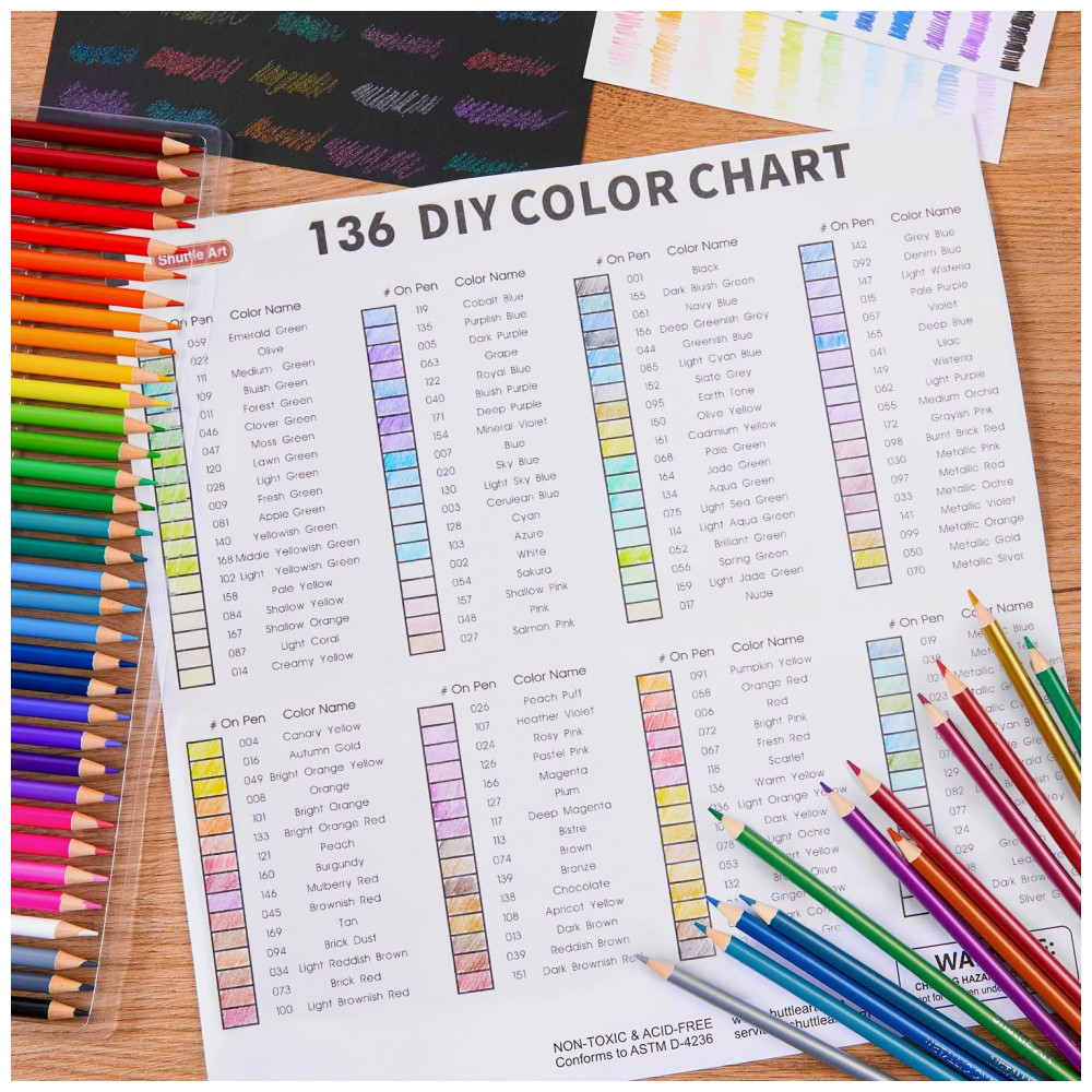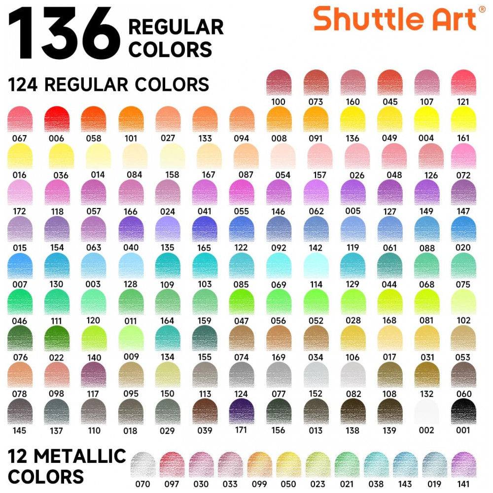 Com o conjunto de 136 lápis de cor Shuttle Art, você terá à disposição 136 cores vibrantes e únicas, incluindo 12 cores metálicas, perfeitas para crianças, adultos, artistas e amantes de cores utilizarem em livros de colorir, desenhos, esboços e outras criações artísticas. Suas minas macias escrevem suavemente e proporcionam cores vivas, fáceis de misturar, sobrepor e sombrear. O núcleo da mina de alta qualidade e espessura evita quebras durante o uso diário e ao apontar, garantindo durabilidade. Cada lápis é numerado e possui o nome da cor para fácil identificação, acompanhado por um gráfico de cores DIY em branco, permitindo que você crie suas próprias amostras de cores para uma seleção rápida, ideal para artistas, designers e amantes de cores. Todos os lápis de cor são armazenados em quatro bandejas individuais e embalados em uma caixa resistente de PET, que oferece amplo espaço para armazenamento e organização. Além disso, os 136 lápis de arte estão pré-afiados, prontos para uso imediato, poupando seu tempo de preparação. Atóxicos, livres de ácido, seguros e adequados para todas as idades.