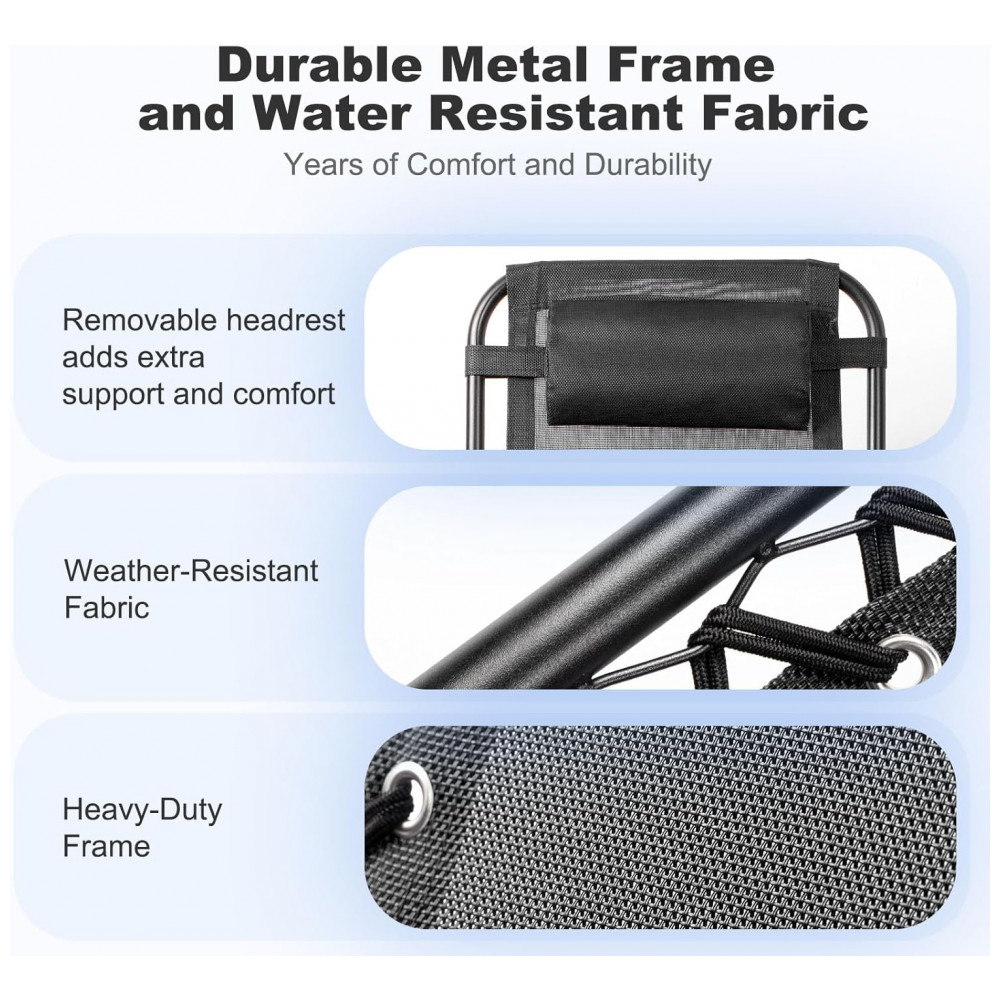 RELAXE COM ESTILO! As cadeiras de praia reclináveis Nazhura foram projetadas para fornecer o máximo de conforto e estilo, com um elegante design em malha de aço preta que se destaca em qualquer ambiente ao ar livre. CONFORTO AJUSTÁVEL! Com um sistema de reclinamento travável e cordas elásticas removíveis que se ajustam ao peso do seu corpo, você pode encontrar a posição perfeita para relaxar. DESIGN PORTÁTIL! Leves e dobráveis, nossas cadeiras de praia são fáceis de transportar para onde você for, seja para a praia, parque ou no próximo evento esportivo do seu filho. CARACTERÍSTICAS CONVENIENTES! Nossas cadeiras de praia vêm com uma bandeja destacável que inclui dois porta-copos, um suporte para celular e um suporte para tablet, para que você possa manter suas bebidas favoritas e dispositivos de mídia sempre à mão. DURÁVEL E RESISTENTE! Com uma alta capacidade de peso de 136 kg e um tecido de tela flexível e de baixo desgaste, nossas cadeiras de praia são construídas para durar e proporcionar anos de relaxamento confortável.