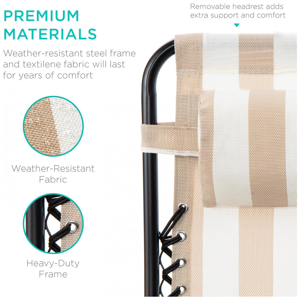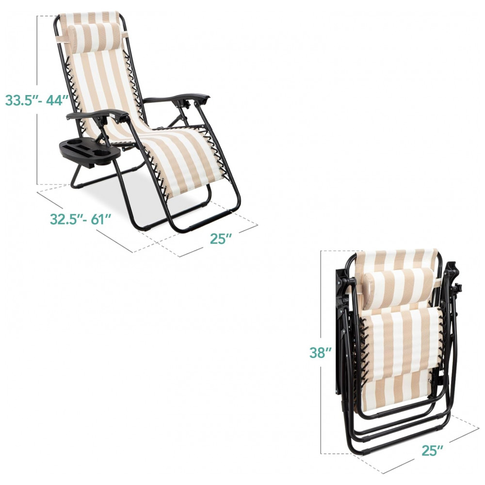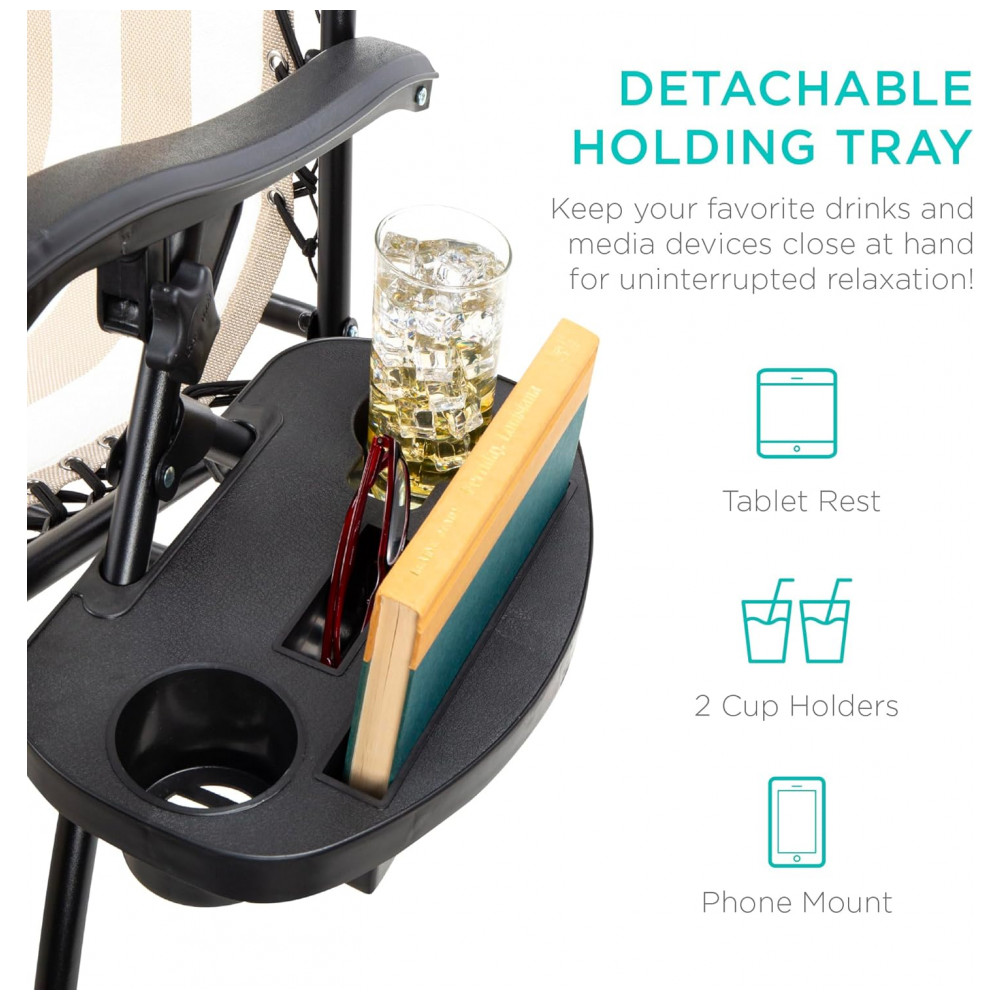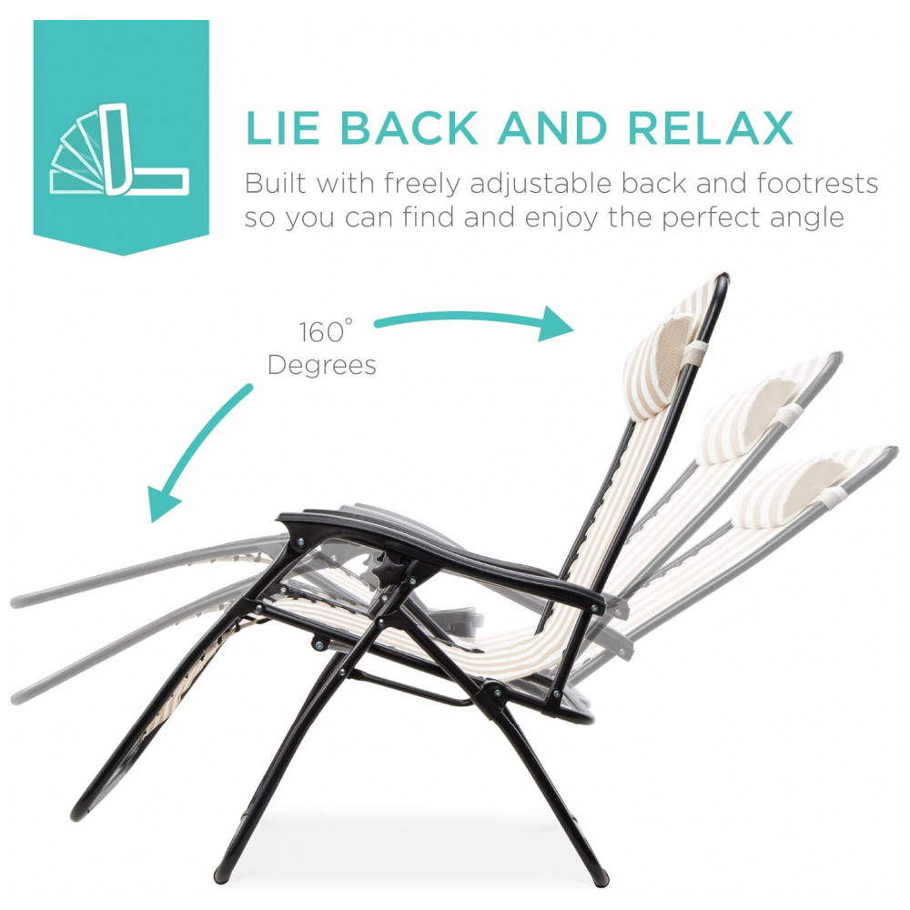 Desfrute do máximo de conforto com o Conjunto de 2 Cadeiras Reclináveis de Aço da Best Choice Products. Com um sistema de reclinagem travável que desliza suavemente para a posição ergonômica de gravidade zero, essas cadeiras oferecem ajuste imediato ao peso do seu corpo. Leves e dobráveis, são ideais para levar para o parque, praia ou eventos esportivos. As bandejas removíveis possuem dois porta-copos, um suporte para telefone e outro para tablet, garantindo que você tenha suas bebidas e dispositivos sempre ao alcance. Construídas com capacidade para até 113 kg, tecido textilene durável e encostos de cabeça ajustáveis e removíveis, proporcionam conforto personalizado. Dimensões abertas: 82.55cm x 63.5cm x 85.1cm. Dimensões dobradas: 96.5cm x 63.5cm x 15.2cm. Peso suportado: 113kg.