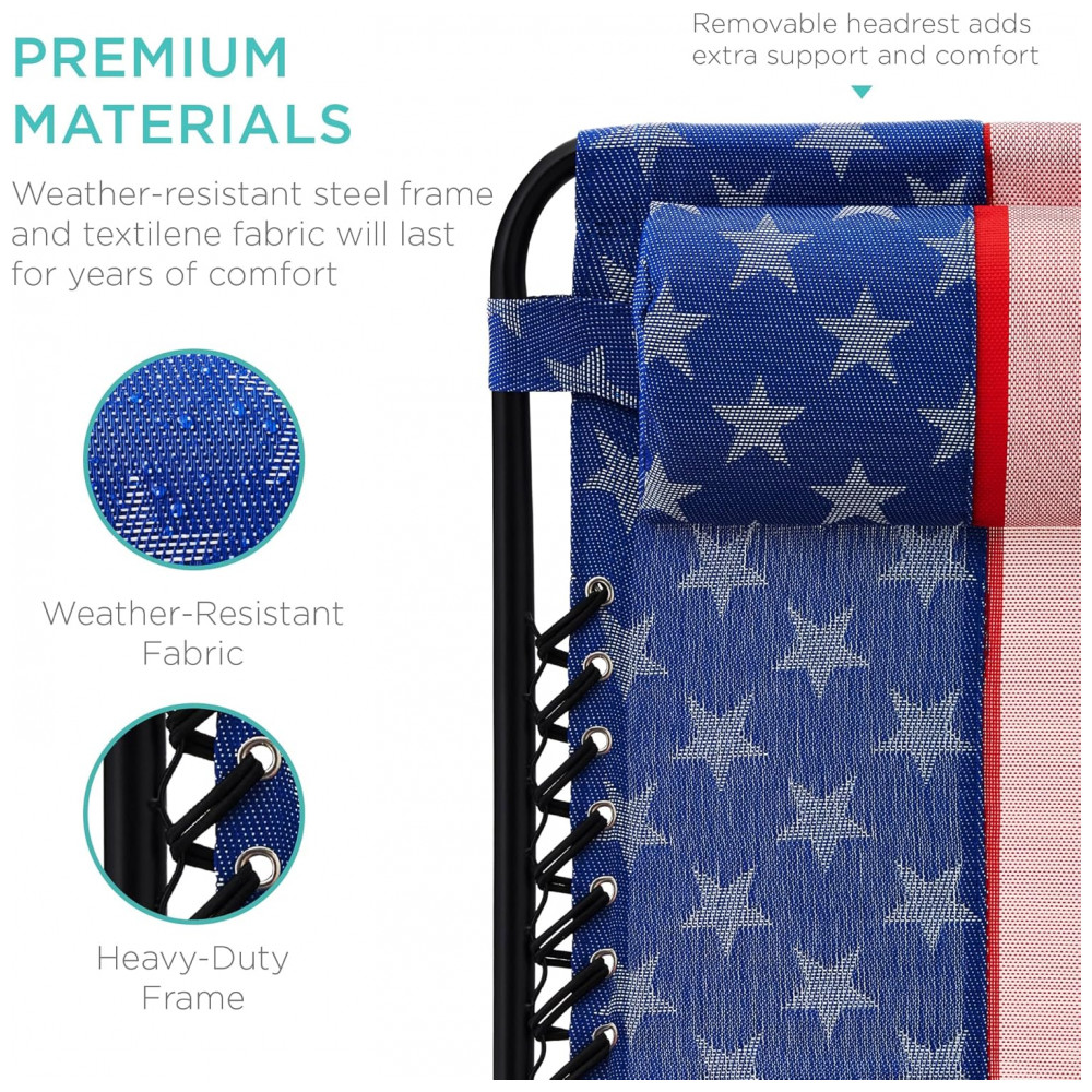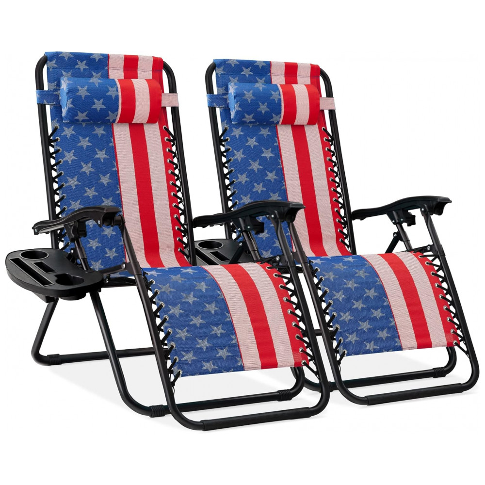 Desfrute de conforto e relaxamento com o Conjunto de 2 Cadeiras Reclináveis de Gravidade Zero da Best Choice Products. Com um sistema de reclinagem travável, ajusta-se facilmente à posição ergonômica de gravidade zero, se adaptando ao peso do seu corpo. Leve e portátil, é perfeito para viagens ao parque, praia ou eventos esportivos. A bandeja removível possui dois porta-copos, suporte para celular e tablet. Construídas para durar, suportam até 113kg e incluem apoios de cabeça removíveis e ajustáveis. Dimensões abertas: 82,5x63x85-112cm. Dimensões dobradas: 96x63x15cm. Peso suportado: 113kg.