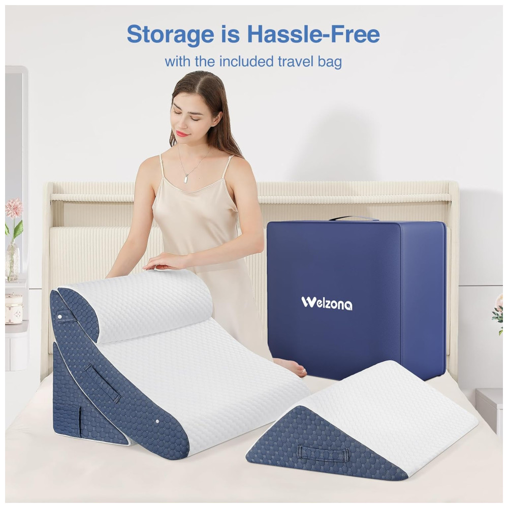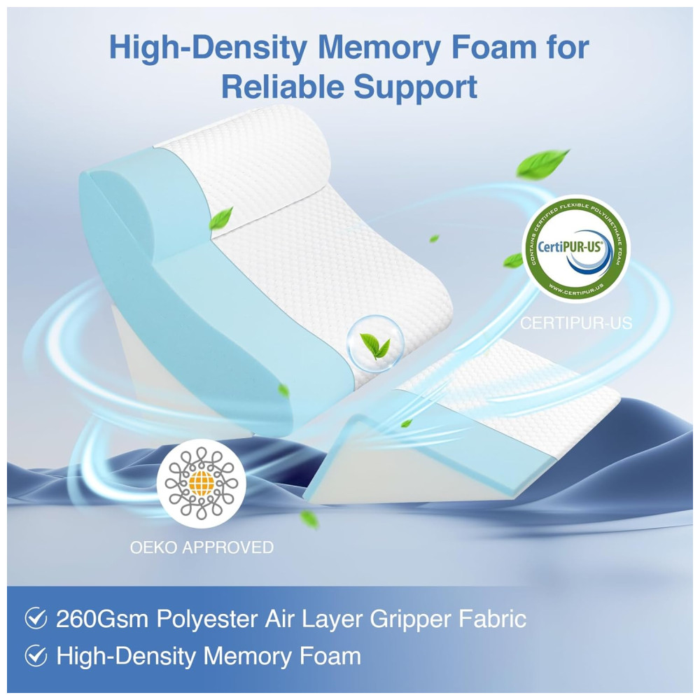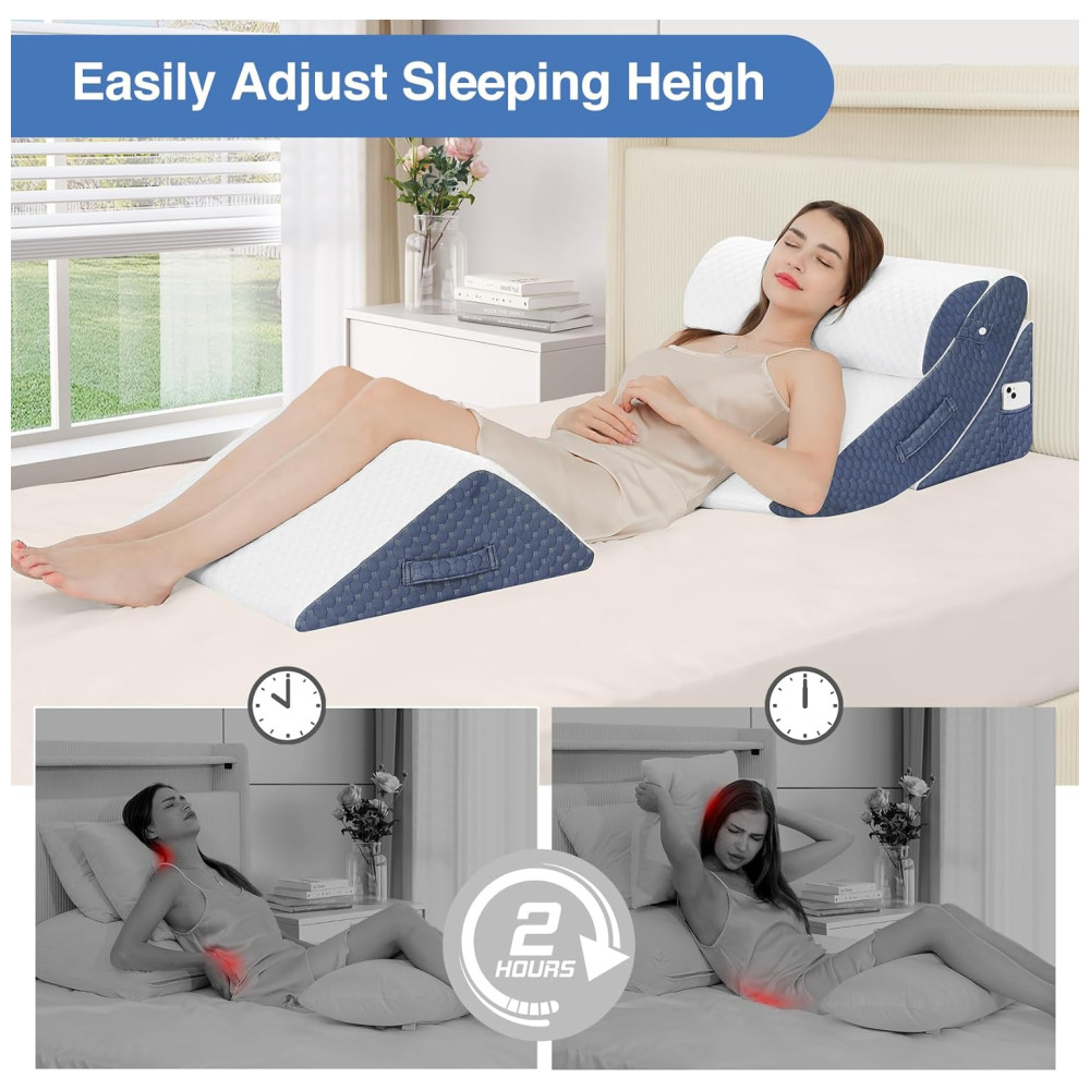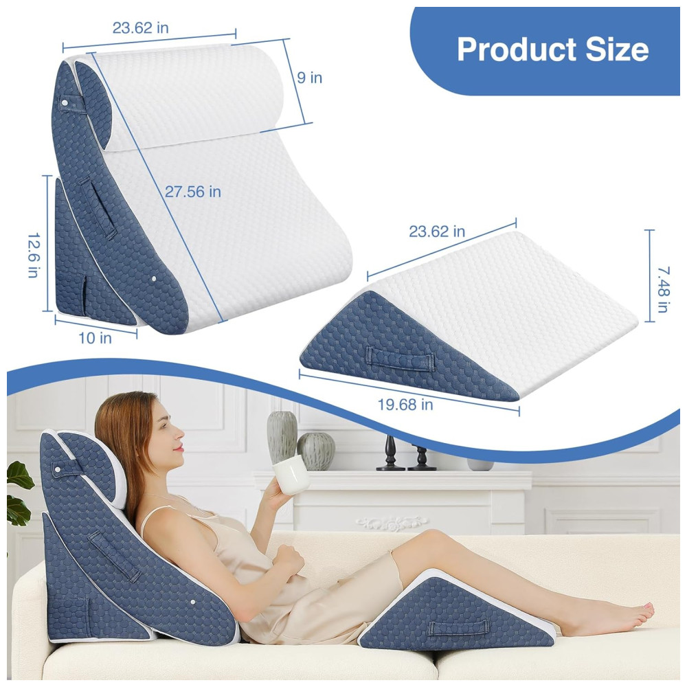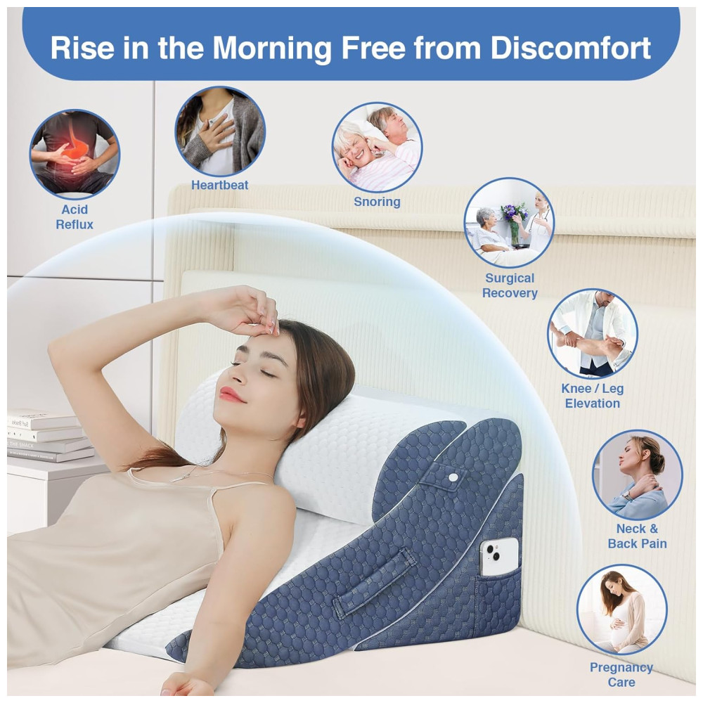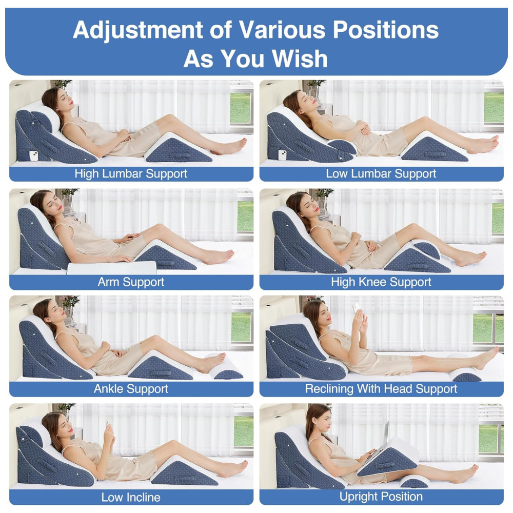 Este travesseiro pode ser usado em qualquer combinação ou combinação para atender a mais necessidades, permitindo que você adormeça ou relaxe com conforto. As almofadas ajustáveis permitem que você encontre o ângulo certo para ler, assistir TV, dormir ou trabalhar no sofá, no chão ou na cama. A almofada de elevação de pernas e joelhos melhora a circulação e alivia a pressão nas extremidades inferiores. A almofada de apoio estendida em cunha garante uma postura correta do braço.