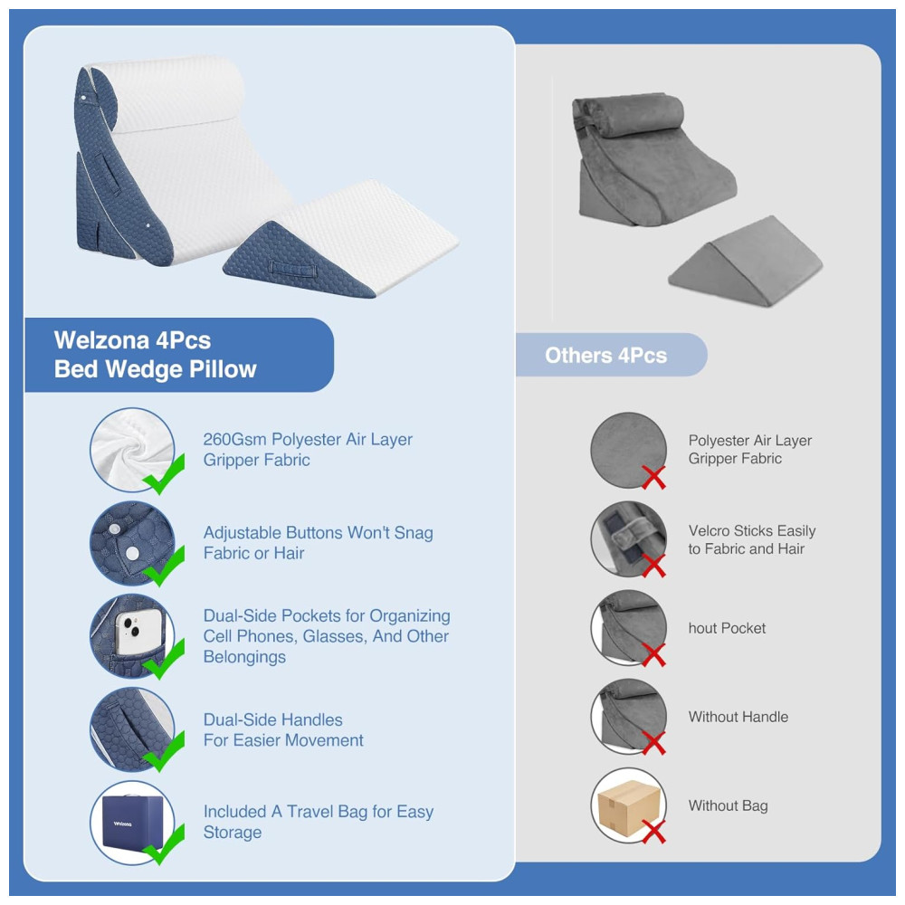 Os travesseiros de cunha de cama ergonomicamente projetados proporcionam alívio da dor e suporte de posicionamento geral confortável para pescoço, ombros, parte inferior das costas, costas e pernas tensos. A fronha de travesseiro ortopédico possui aberturas laterais com zíper que são fáceis de remover e laváveis à máquina para mantê la limpa e bonita. O design antiderrapante duplo de botões ajustáveis nas laterais superior e inferior e a superfície de grânulos antiderrapantes de PVC na parte inferior evitam que o travesseiro em cunha para alívio da dor nas costas escorregue e reduzem a necessidade de ajustes frequentes.