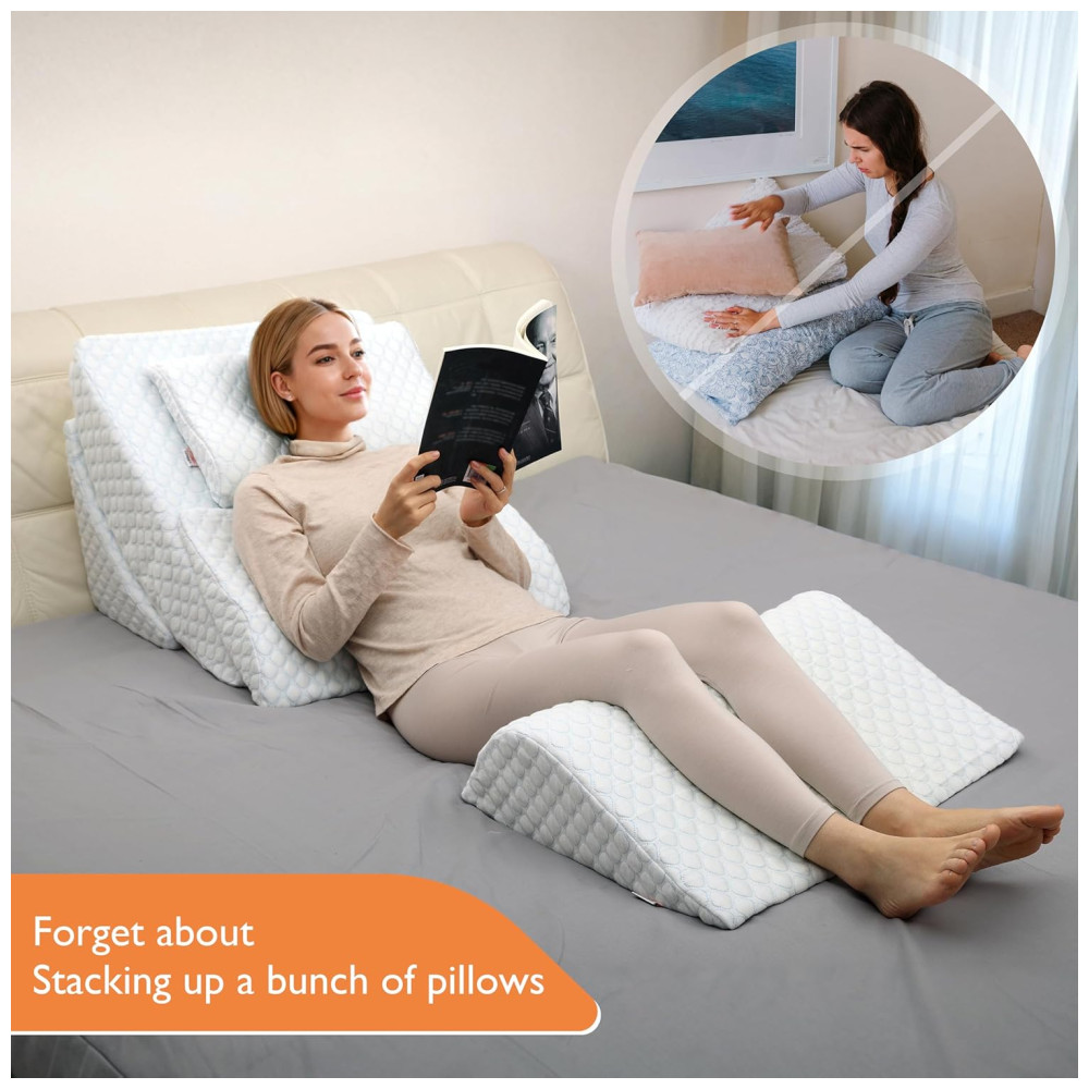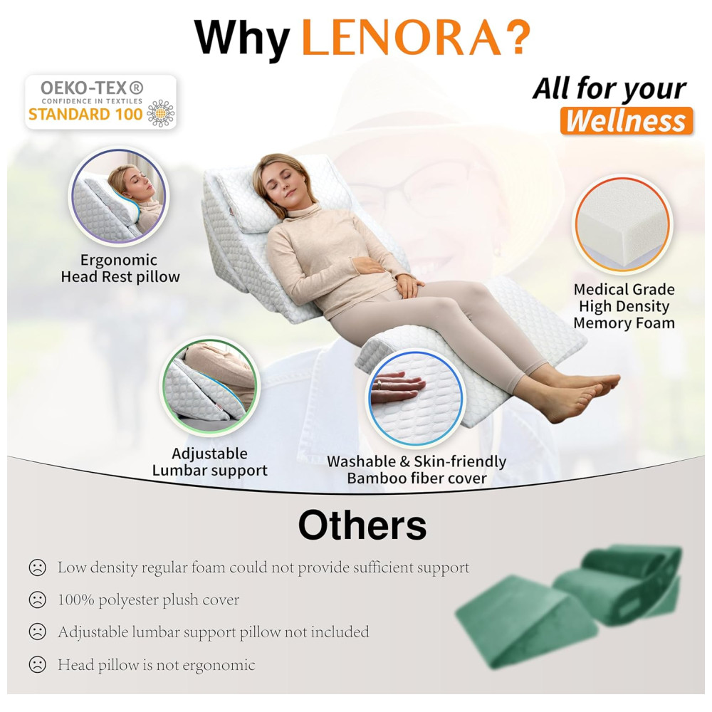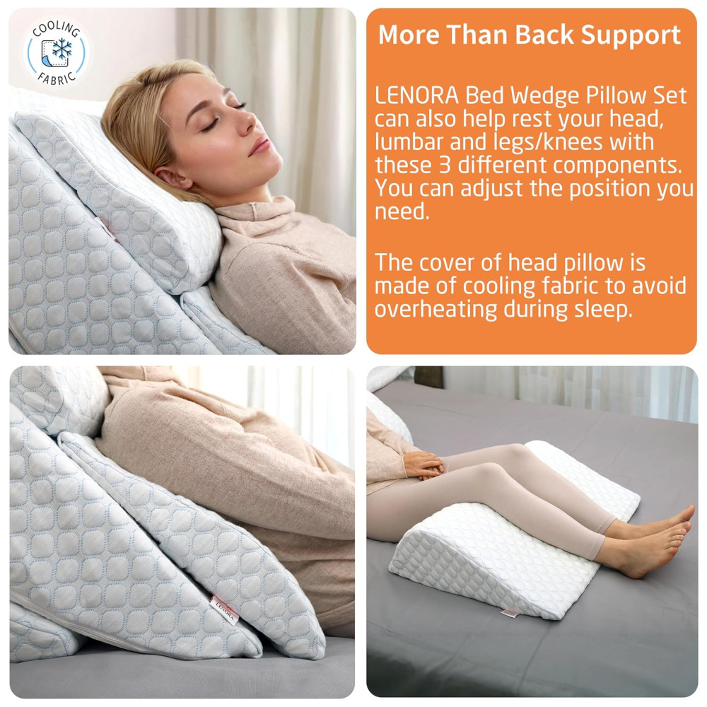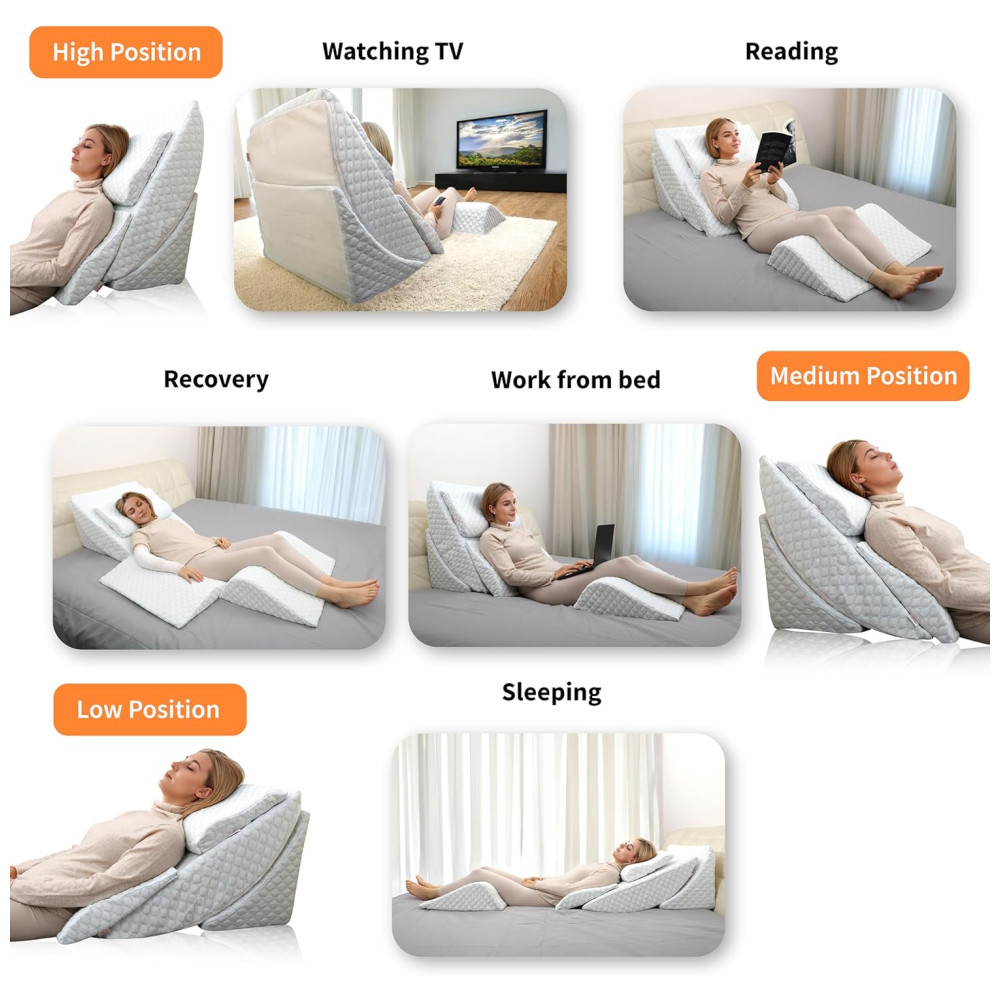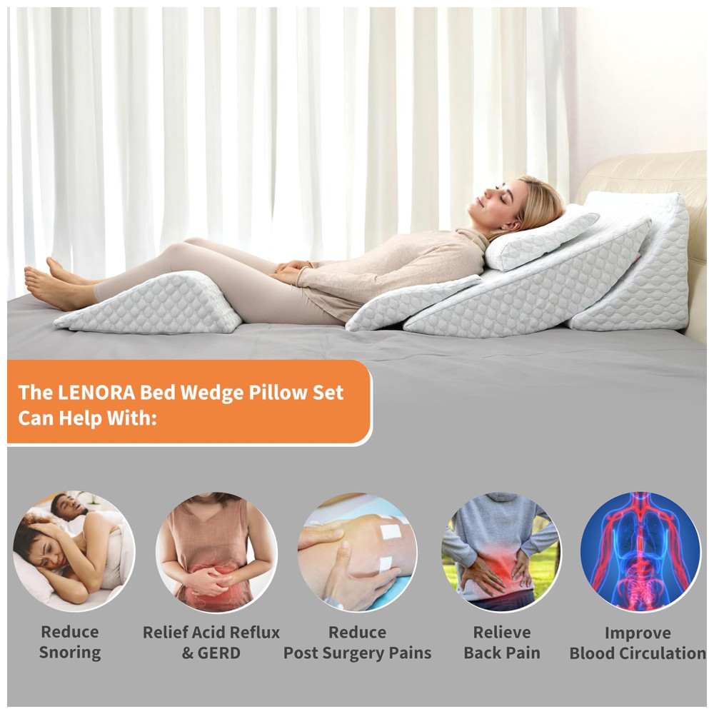 O conjunto Lenora Wedge é composto por 5 almofadas que podem ser usadas em diversas posições para proporcionar conforto e suporte. Os travesseiros podem ser usados sob a cabeça, na parte inferior das costas ou para elevar as pernas, aliviando dores e desconfortos pós cirúrgicos, além de ajudar a aliviar o refluxo ácido e reduzir o ronco. O conjunto permite que você descanse a cabeça, os ombros, o tronco ou as pernas e os joelhos em uma posição elevada que promove mais oxigênio e fluxo sanguíneo saudável para todo o corpo. É fácil de ajustar e personalizar seu nível de conforto, e cada componente apresenta espuma viscoelástica de alta densidade na parte superior e uma base de espuma firme para fornecer bom suporte e conforto. A capa é lavável à máquina e tem zíper para facilitar a limpeza. O conjunto foi desenvolvido para atender às necessidades de tamanho, firmeza e funcionalidade da maioria das pessoas para recuperação pós cirúrgica e uso diário.