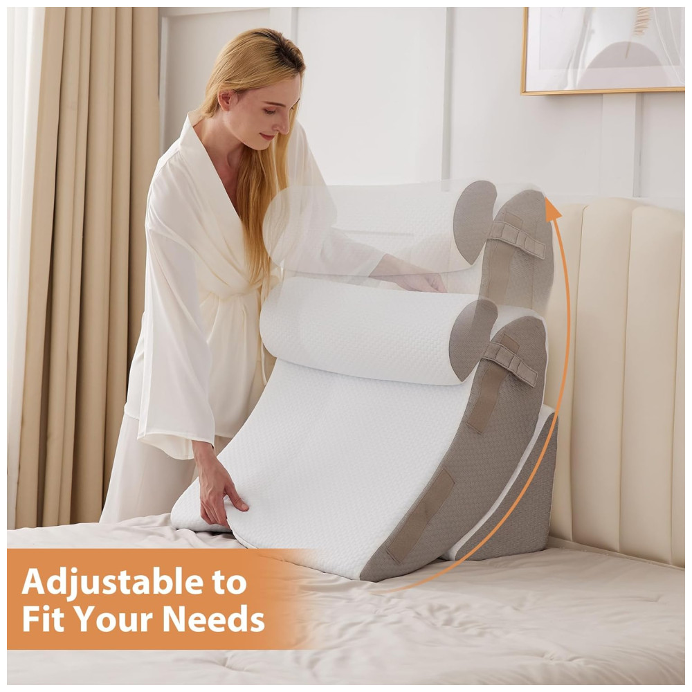 Este conjunto de travesseiros em cunha possui um design ergonômico curvo que oferece suporte e alívio do desconforto. É feito sob medida para se ajustar à curva da coluna, tornando o multifuncional e uma adição versátil a qualquer espaço. Pode ser usado para relaxamento, fisioterapia ou simplesmente para melhorar a qualidade do sono. Além disso, é ideal para aqueles que sofrem de refluxo ácido, pois pode proporcionar alívio e promover um sono melhor.