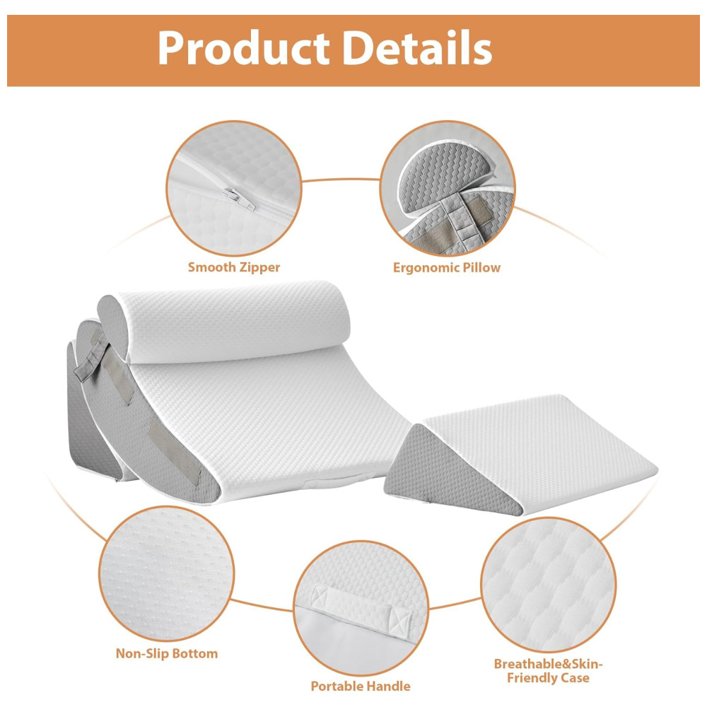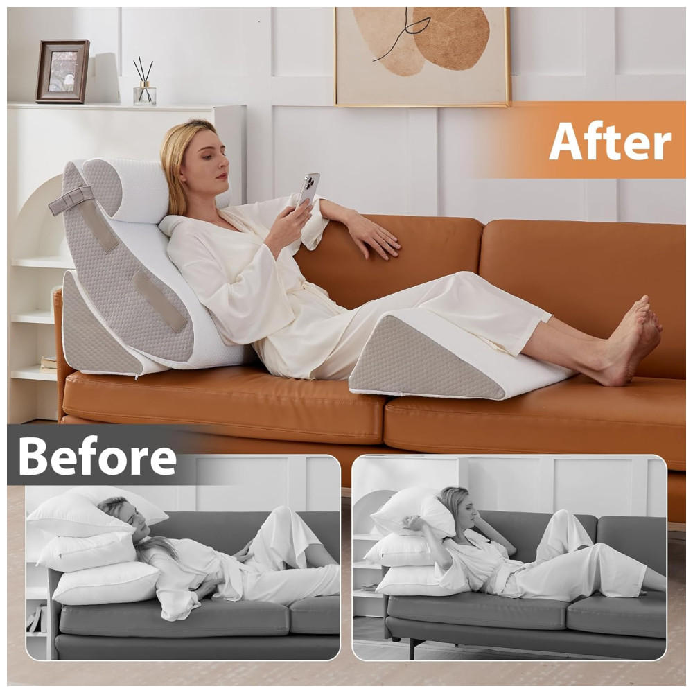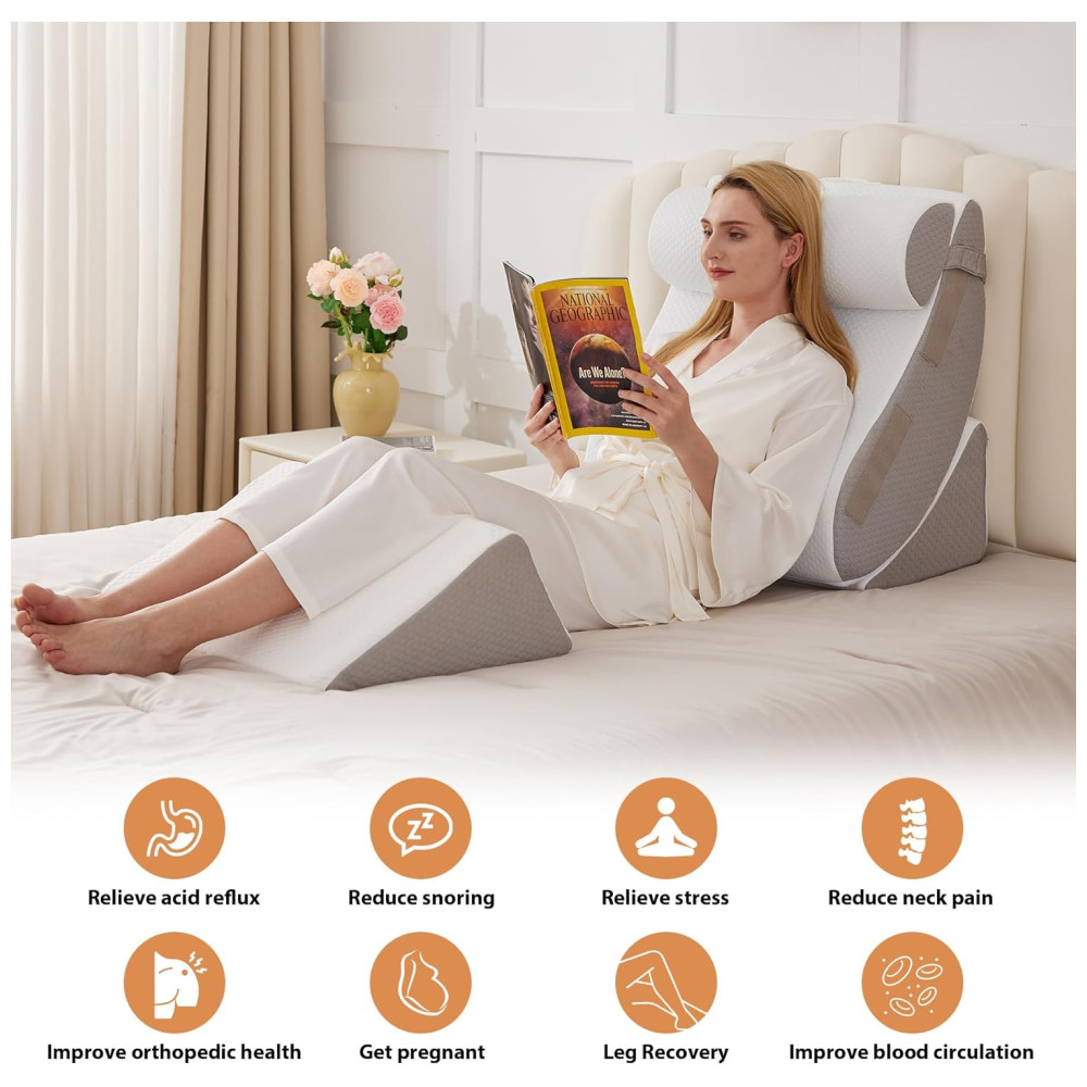 O conjunto de travesseiros é multifuncional e adequado para uma ampla gama de aplicações, incluindo leitura na cama, assistir TV, aliviar o refluxo ácido e melhorar a qualidade geral do sono. O travesseiro corporal consiste em quatro partes que podem ser combinadas para escolher um ângulo adequado para sentar, deitar e dormir nos travesseiros traseiros ajustáveis. O travesseiro de elevação das pernas pode aliviar o desconforto e a pressão nas pernas e joelhos.