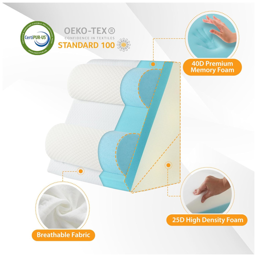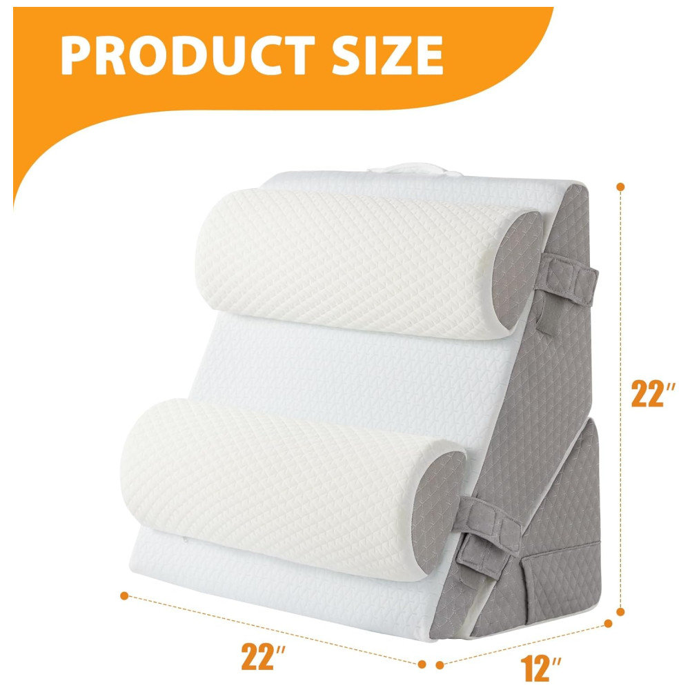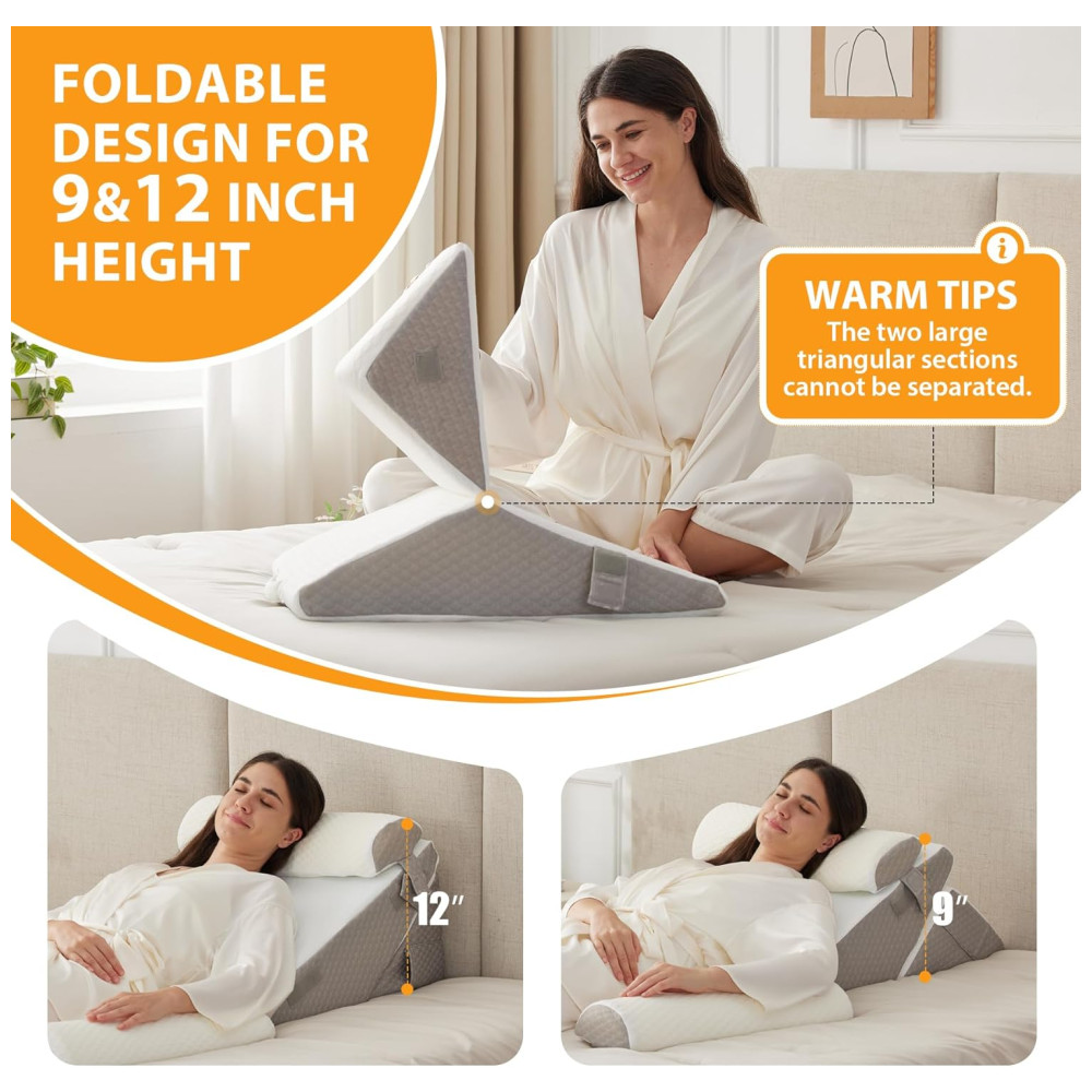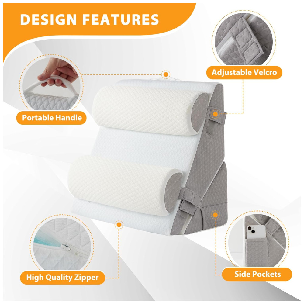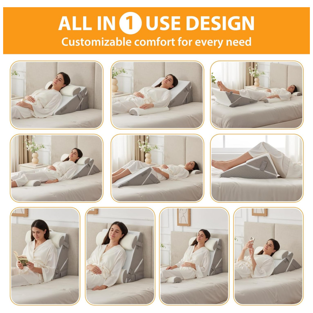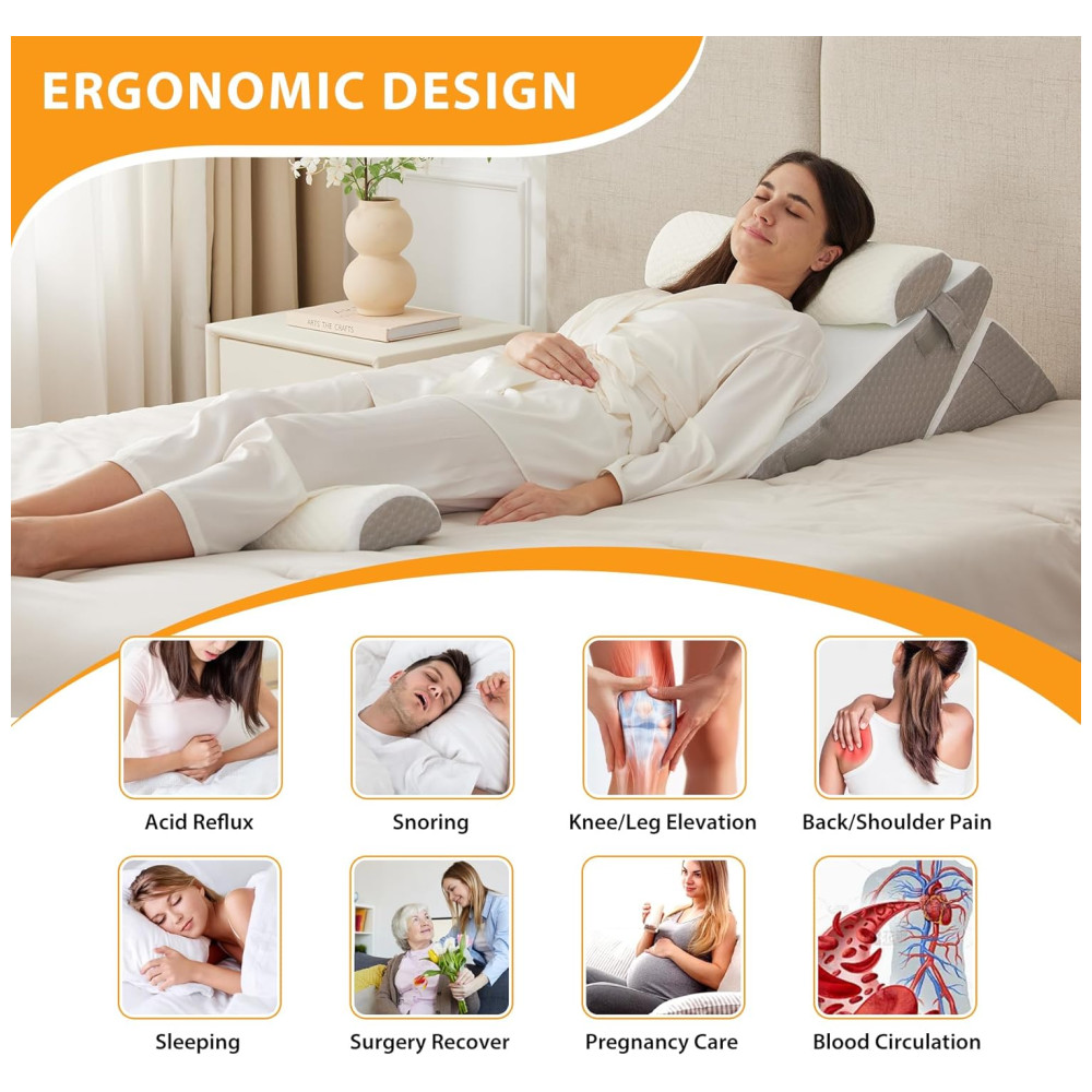 O conjunto de travesseiros cunha Ruqmuis oferece design multifuncional 10 em 1 com apoios ajustáveis que proporcionam suporte ergonômico para pescoço, cabeça, costas, pernas e joelhos. Ideal para uso pós-cirúrgico, controle de refluxo ácido, apoio para gestantes e alívio de dores cervicais e lombares. Composto por espuma viscoelástica de alta densidade (40D para o travesseiro semi-cilíndrico e 25D para os cunhas triangulares), oferece conforto firme e durabilidade.