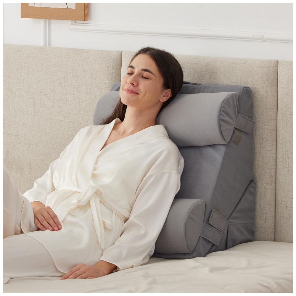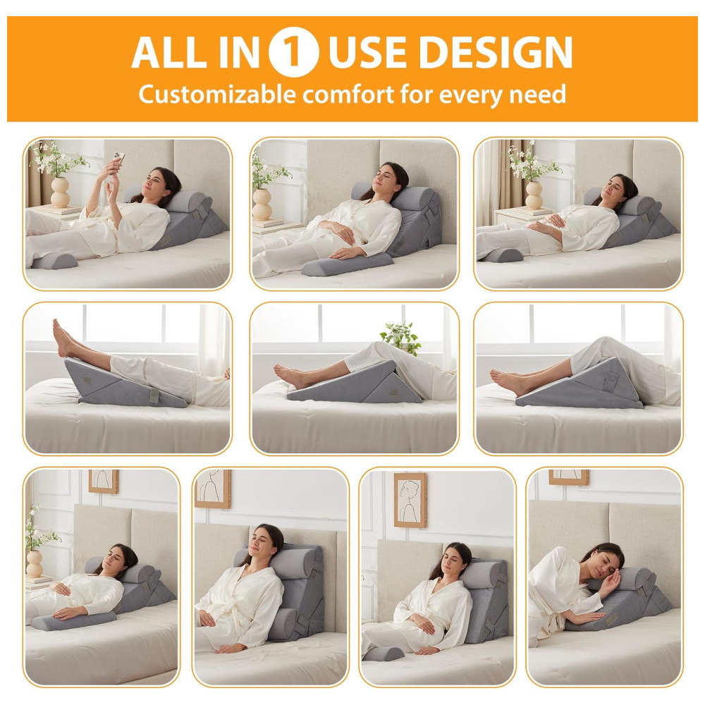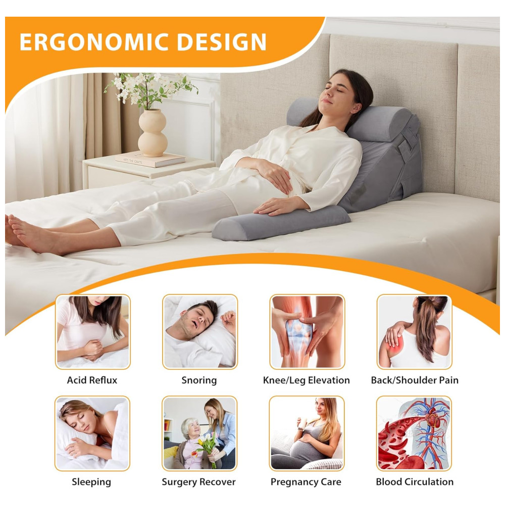 Projetado com uma curva ergonômica, este conjunto de travesseiros ortopédicos em cunha para cama oferece conforto excepcional. Nosso travesseiro pós cirúrgico melhora a circulação sanguínea, alivia o refluxo ácido e o ronco, auxilia na recuperação pós cirúrgica e fornece cuidados essenciais durante a gravidez.