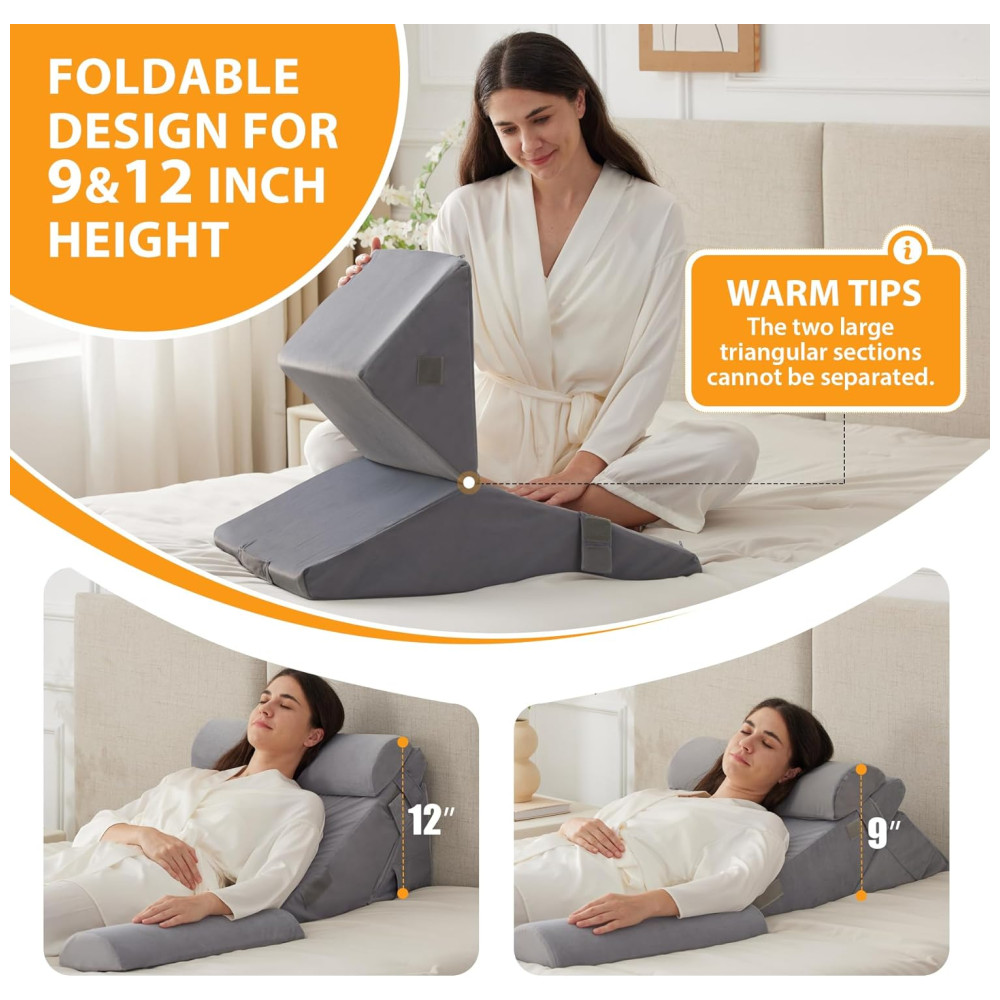 Conjunto de 4 Travesseiros Ortopédicos em Cunha para Dormir Ajustáveis para Refluxo Ácido e Alívio de Dores nas Costas Pós-Cirúrgico Ruqmuis Cinza