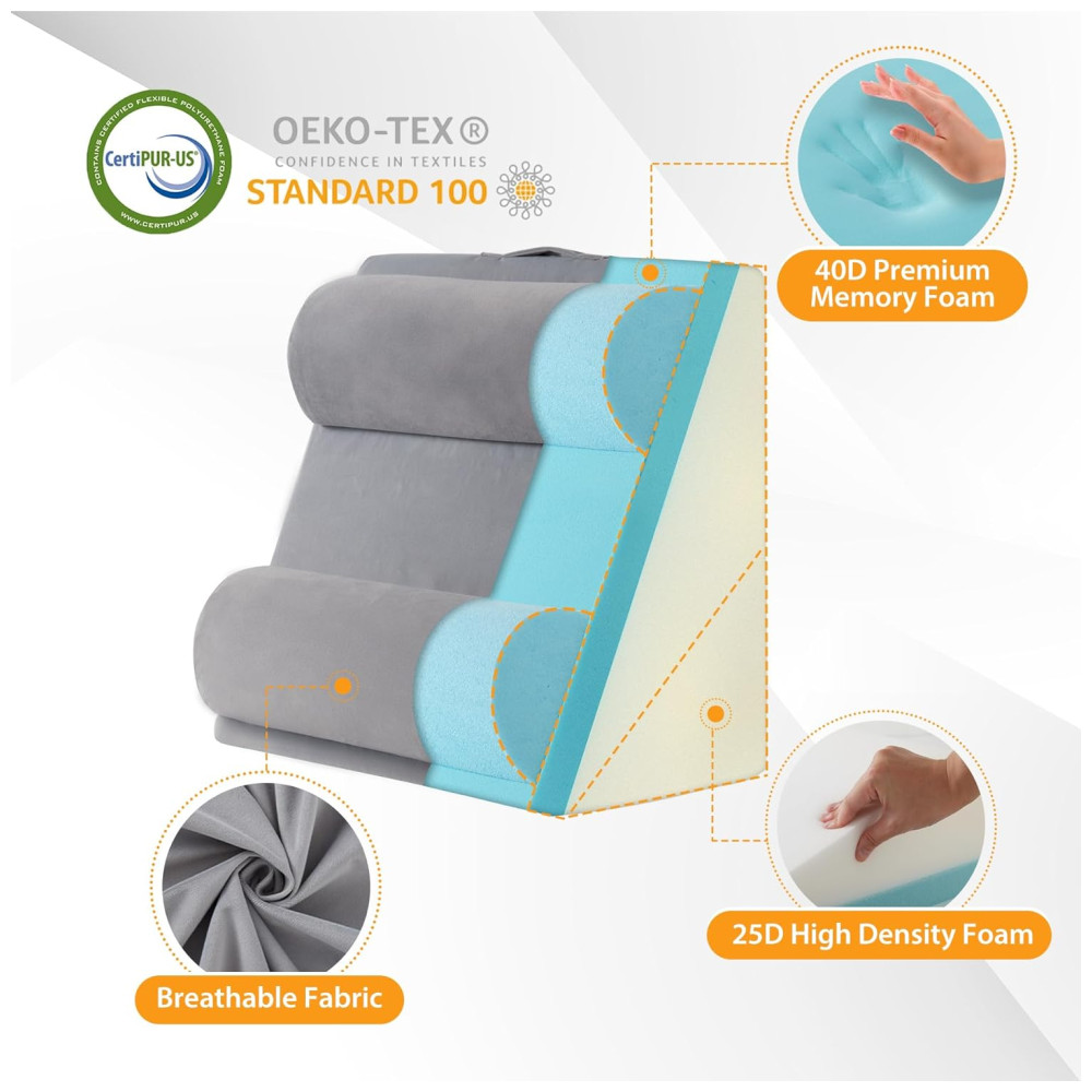 Feito com espuma de memória 40D de alta qualidade, o travesseiro semicilíndrico neste conjunto oferece suporte aprimorado e conforto excepcional. Os travesseiros triangulares são feitos de espuma de alta densidade 25D.
