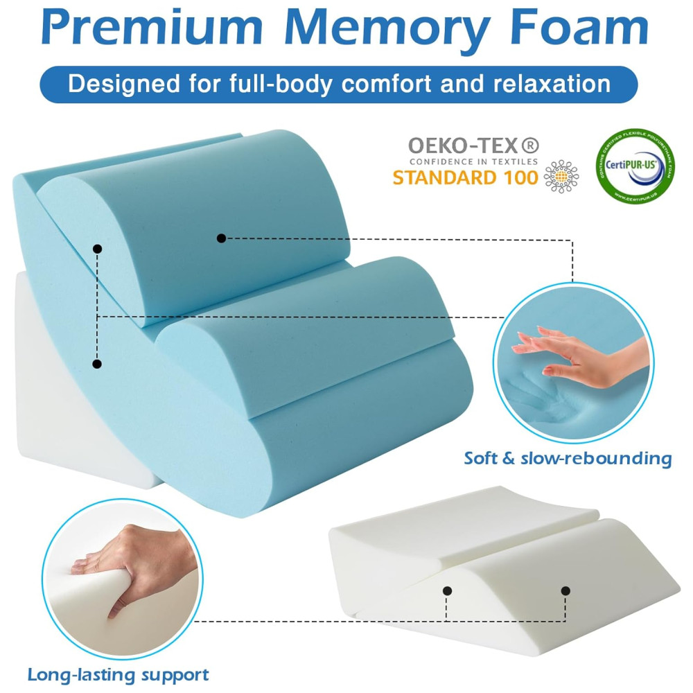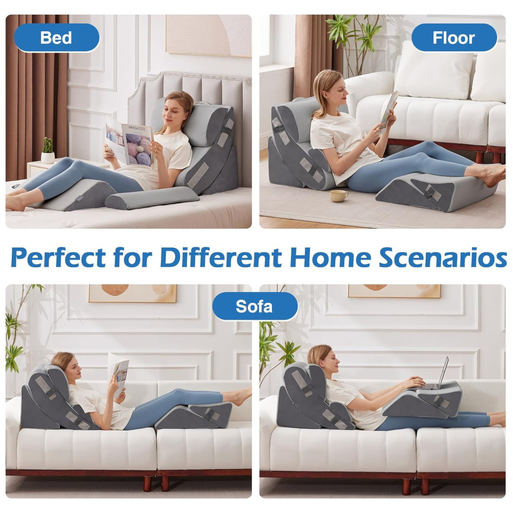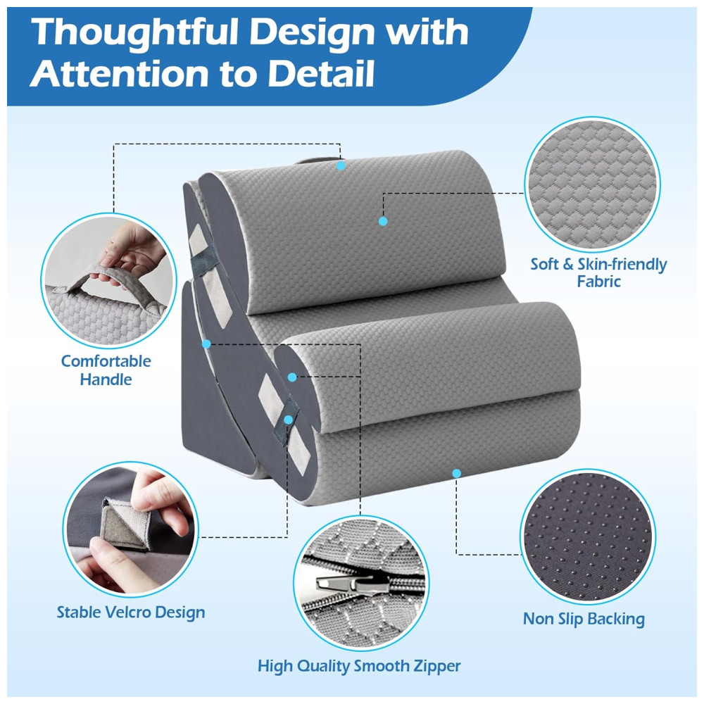 Este conjunto de travesseiros em cunha de 6 peças é ideal para aliviar a dor ortopédica no pescoço, costas, pernas e ombros, além de melhorar a circulação e promover uma melhor postura. Com mais de 16 configurações, este conjunto de travesseiros ajustáveis se adapta às suas necessidades, seja você dormindo, lendo ou assistindo TV. O design ergonômico multifuncional inclui uma almofada lombar para suporte adicional e almofadas para as pernas que também podem ser usadas como mesa conveniente. O conjunto apresenta uma mistura de espuma de memória em gel macio e espuma de base de alta densidade, garantindo um equilíbrio perfeito entre conforto e durabilidade. As capas removíveis e laváveis à máquina tornam a limpeza fácil e o design antiderrapante e as tiras de velcro seguras garantem que seus travesseiros fiquem firmemente no lugar. O conjunto vem com uma bolsa de viagem bônus e sacos de armazenamento a vácuo para facilitar o armazenamento. É importante lembrar que as almofadas em cunha são seladas a vácuo e é necessário aguardar de 24 a 48 horas para expansão total antes do uso para garantir o máximo de conforto e suporte.