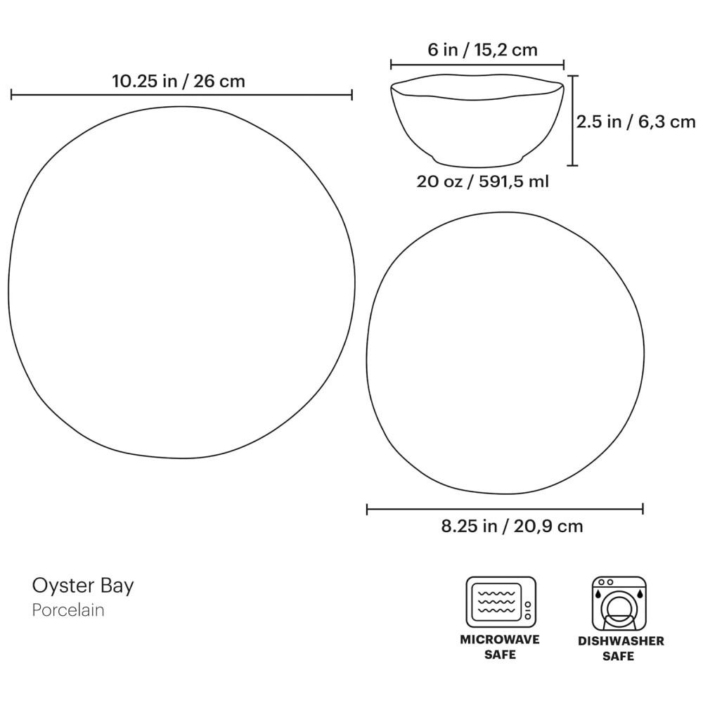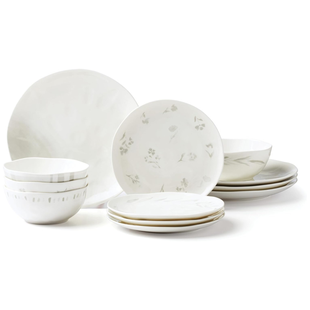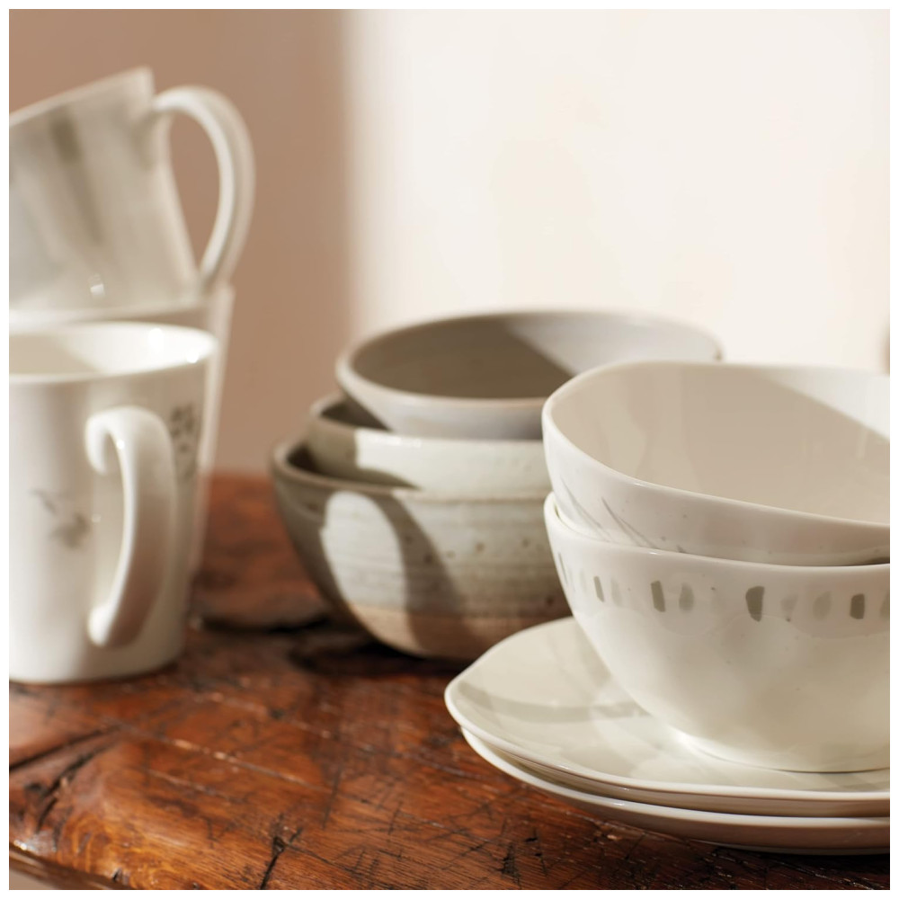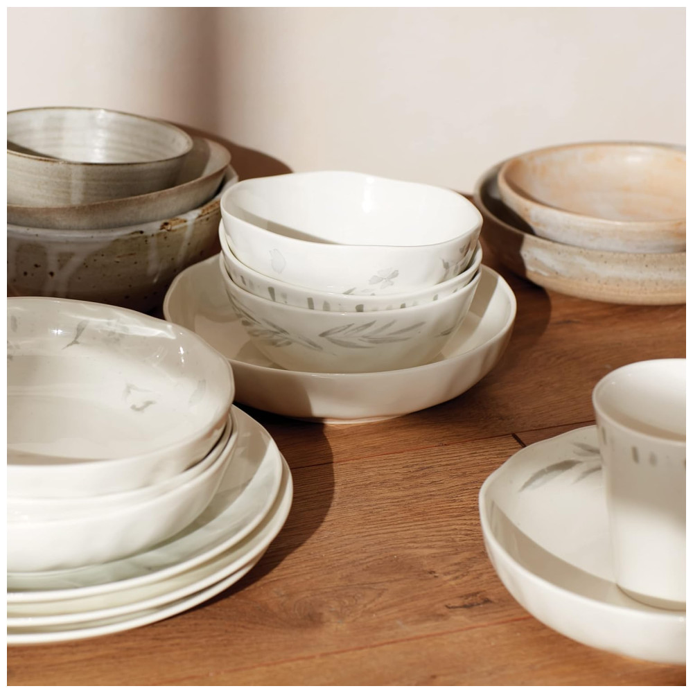 Este conjunto de 12 peças é uma homenagem à simplicidade e ao design natural, com suaves detalhes em cinza e formas orgânicas. A porcelana branca como a neve é decorada com arte variada inspirada em aquarela e padrões minimalistas. O conjunto inclui:
