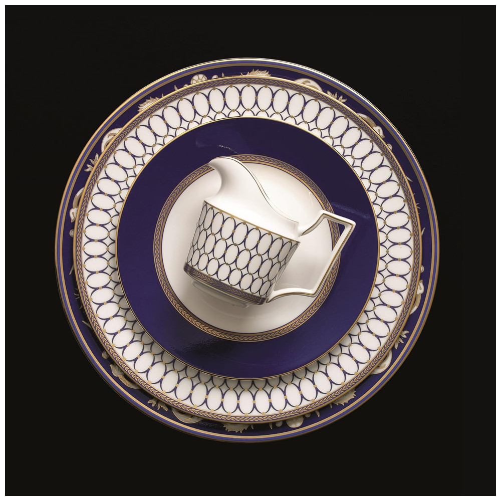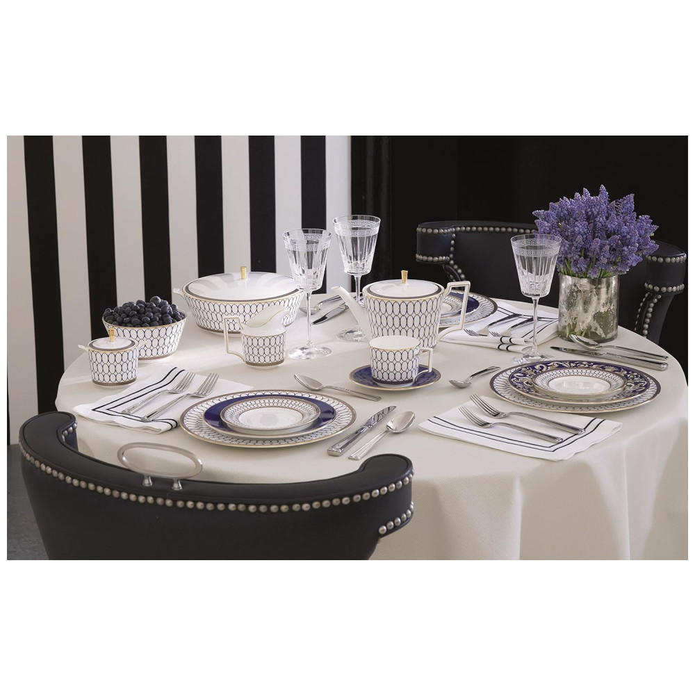 Este conjunto inclui prato de jantar, prato de salada, prato de sobremesa, prato de pão e manteiga, xícara de chá e pires de chá, todos feitos em porcelana fina. Cada peça é decorada com um acabamento azul Wedgwood vibrante e adornada com detalhes dourados intrincados, além de uma borda de louro neoclássica inspirada nos padrões históricos dos arquivos da marca, que adicionam um toque de luxo atemporal.