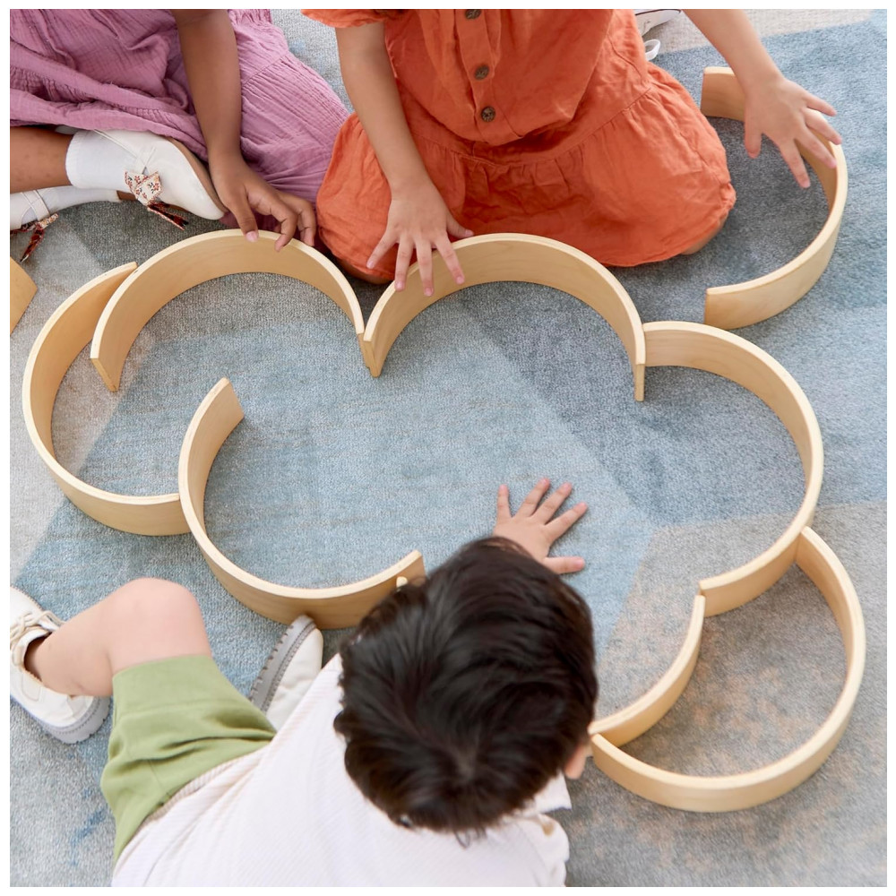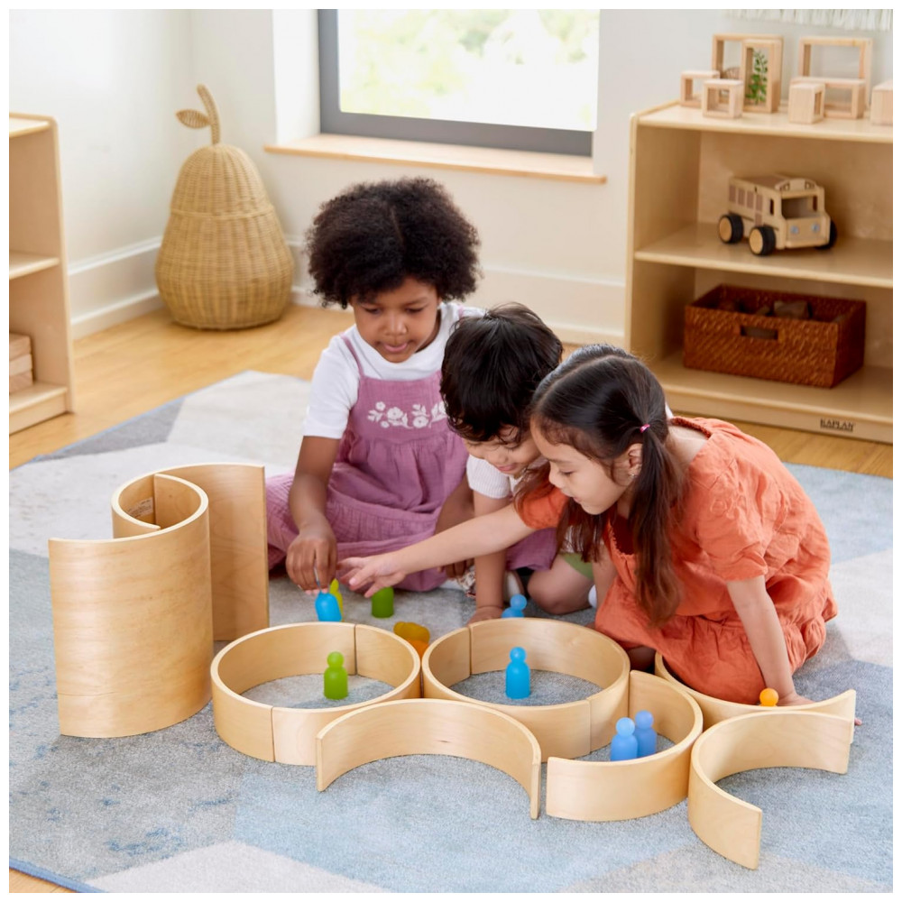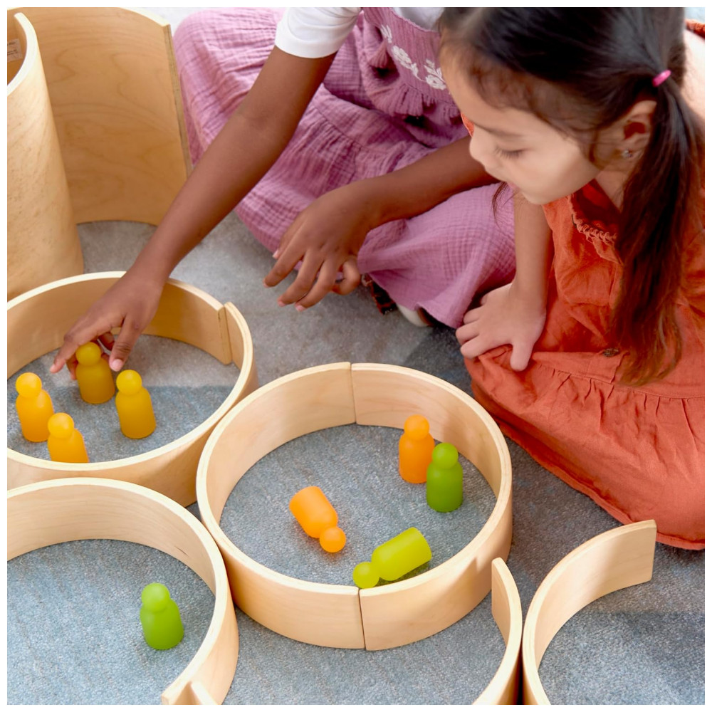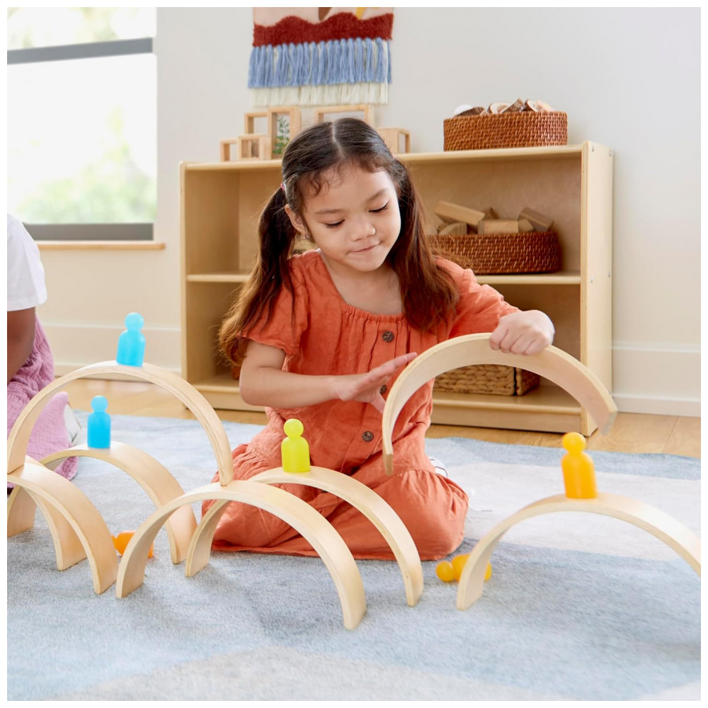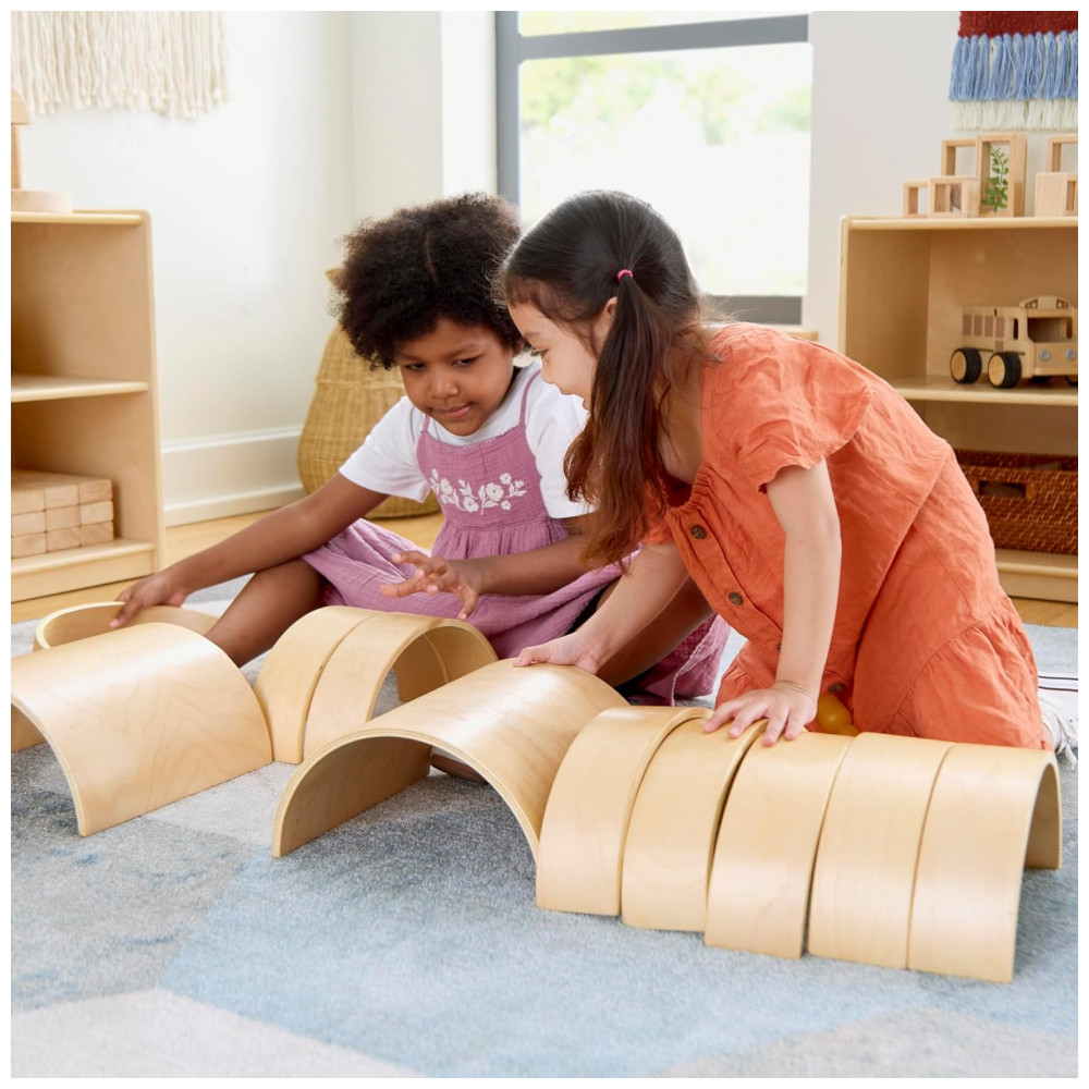Conjunto infantil de blocos curvos em madeira desenvolvido para brincadeiras abertas de empilhamento, construção e composição de cenários arquitetônicos. O set é composto por 10 peças, sendo 2 túneis e 8 arcos em diferentes larguras, permitindo criar pontes, túneis, passagens superiores e estruturas tridimensionais em combinação com outros blocos.