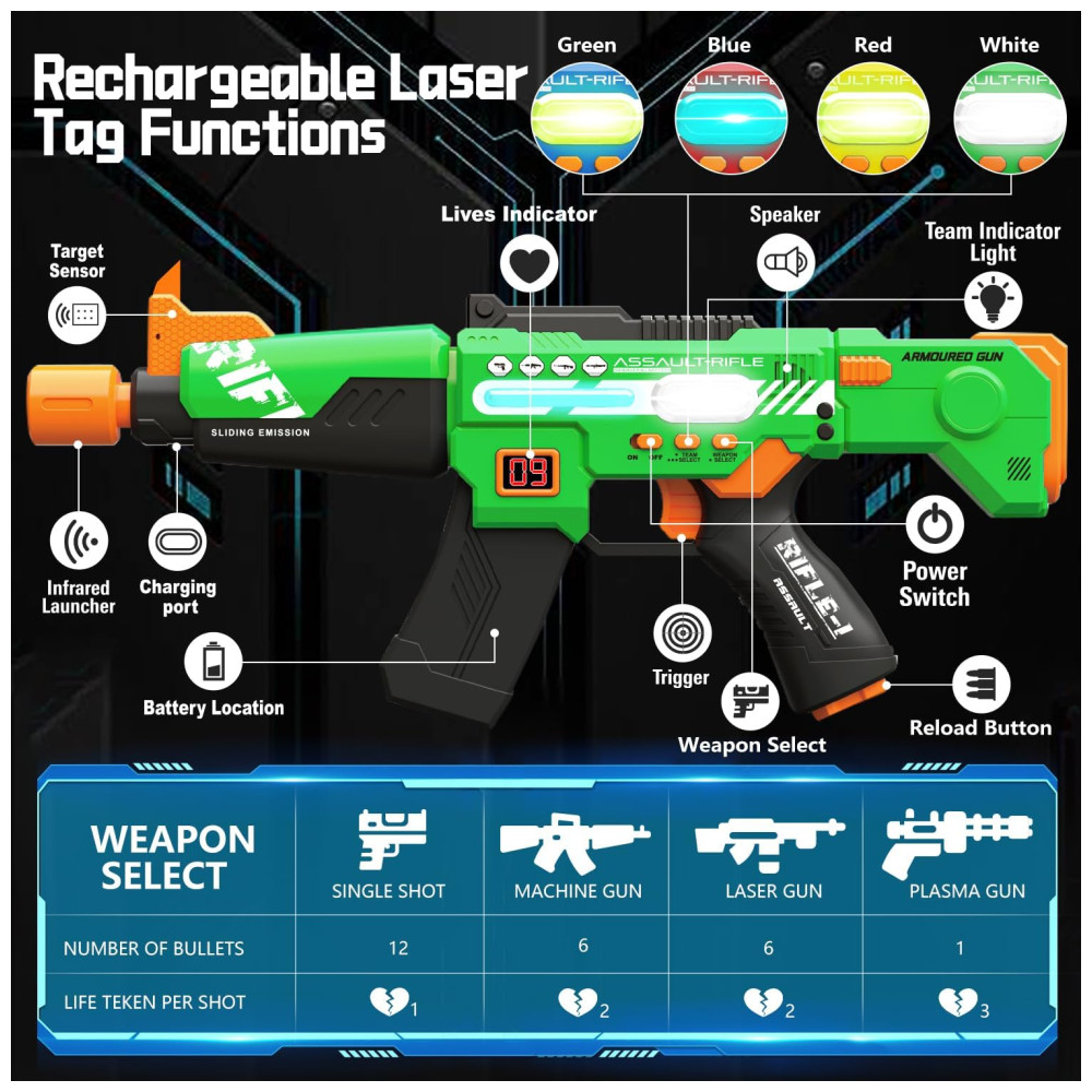 Dois Jogadores, Quatro Armas, Mais Diversão: Este conjunto recarregável de laser tag vem com 4 cores de equipes e diferentes modos de armas para escolher. Quando as armas e coletes estiverem na mesma cor, a pontuação será reduzida após cada disparo. Alterne entre os modos poderosos de Pistola, Metralhadora, Arma Laser e Plasma para derrotar seus inimigos e conquistar a vitória. Com um alcance de até 150 pés (45 metros), você pode transformar qualquer ambiente, seja interno ou externo, em uma arena de laser tag. O jogo ajuda a melhorar a concentração e a coordenação motora das crianças.