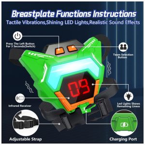 Coletes Multifuncionais com LED Digital: Os coletes ajustáveis e recarregáveis vêm com uma tela digital LED que exibe a pontuação e o status de vida. O total de vidas é 12, e cada vez que um jogador é atingido, ele perde pontos. Quando um jogador é atingido, o colete vibra e emite sons realistas. É fácil verificar a pontuação restante durante o jogo intenso, ajudando os jogadores a ajustar sua estratégia. O colete também permite selecionar a equipe, ligar/desligar e mostrar o indicador de vidas restantes, além de contar com um receptor infravermelho para maior precisão.