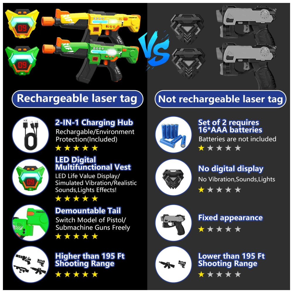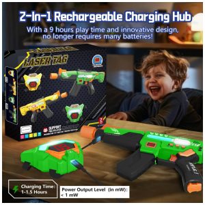 Novo Conjunto de Laser Tag Recarregável: Estamos comprometidos em oferecer uma experiência de jogo interativa aprimorada e mais confortável para as crianças. Agora, com este conjunto de 2 submetralhadoras de laser tag atualizadas, sua família e seus filhos terão a melhor experiência de laser tag. O pacote inclui 2 pistolas de laser e 2 coletes multifuncionais com LED digital, além de um cabo de carregamento USB 2 em 1, eliminando a necessidade de trocas constantes de pilhas. Após 1 a 1,5 horas de carregamento, você poderá aproveitar de 8 a 9 horas de diversão contínua.