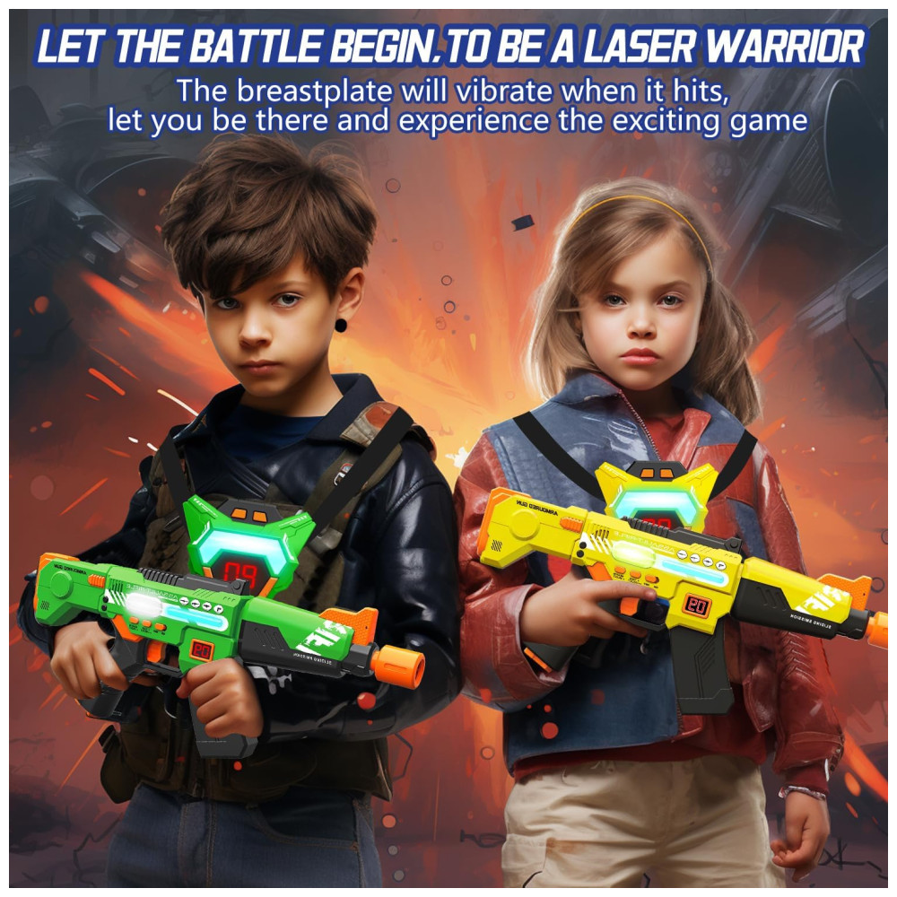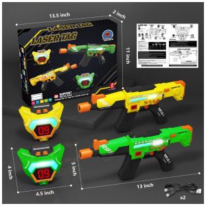 Conjunto de Arminha de Brinquedo Recarregável com Laser Tag 2 Armas e 2 Coletes de Exibição de Pontuação em LED Inodoo Amarela e Verde